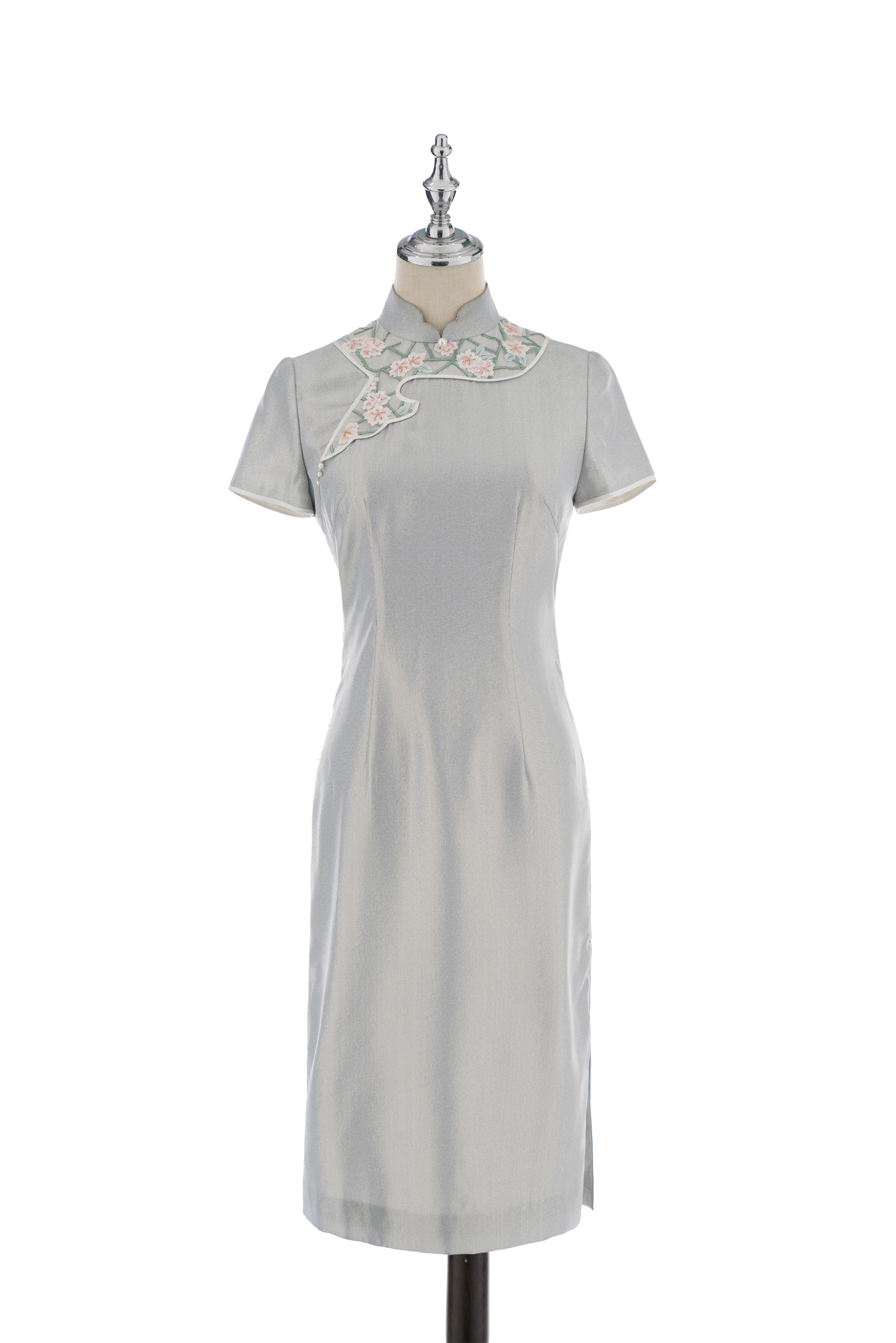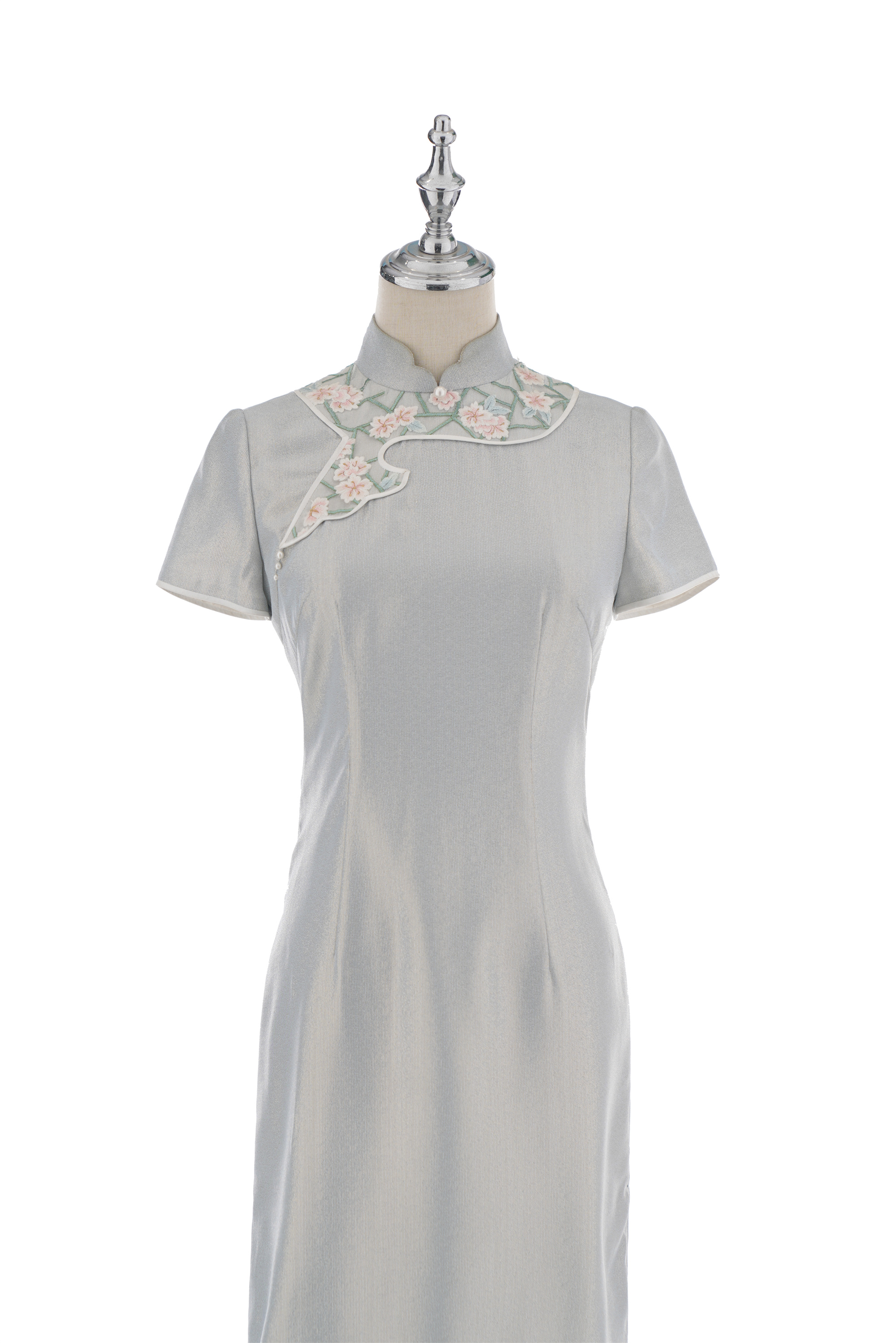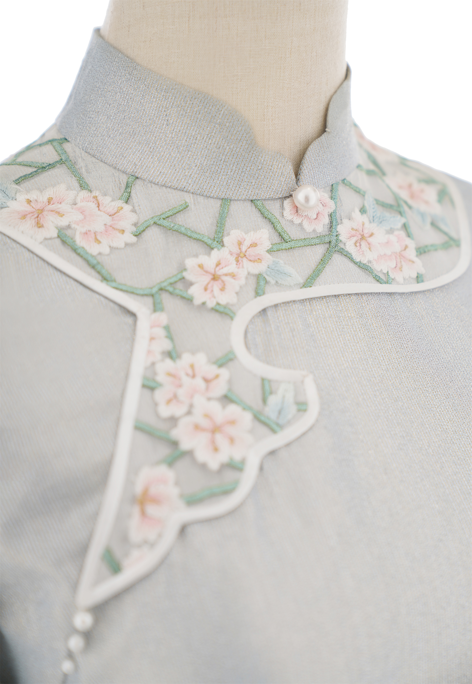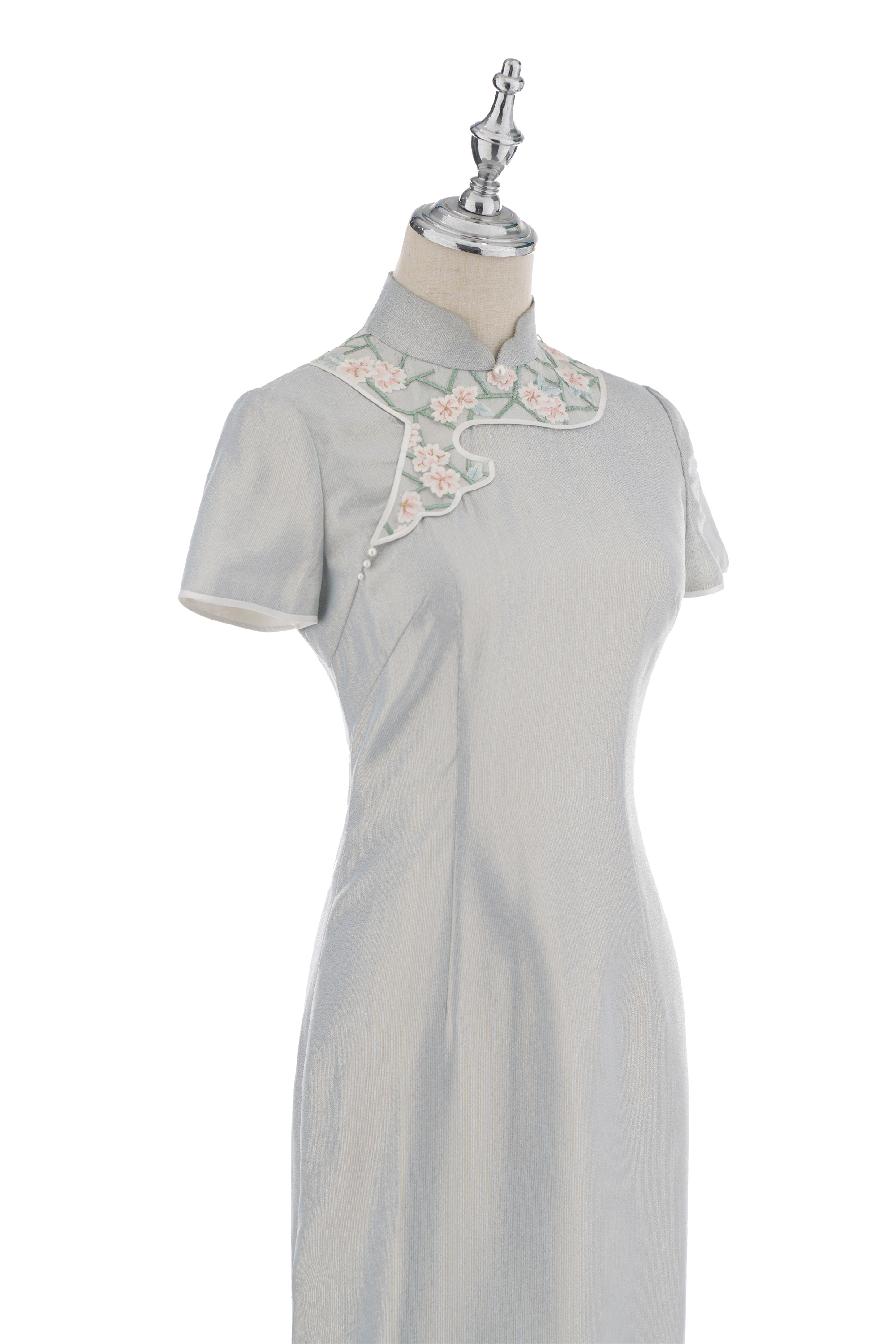 荷言HEYEN 苏园六纪【明星同款】淡蓝色珠光缎+花朵绣花手工旗袍