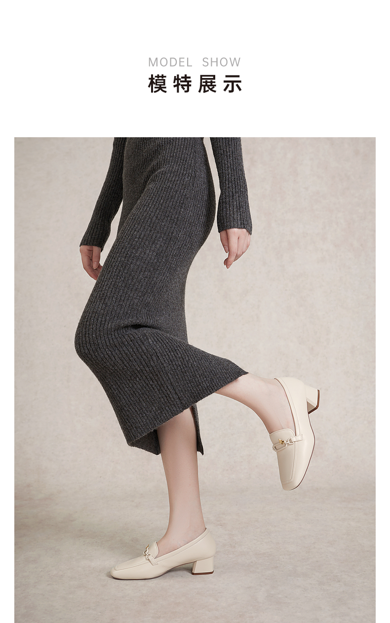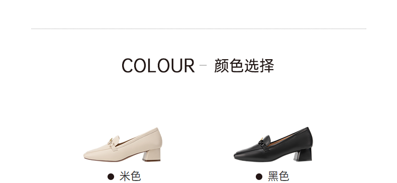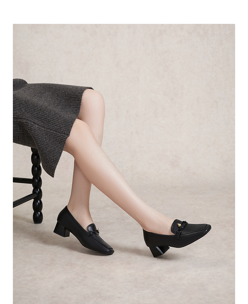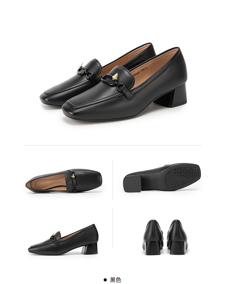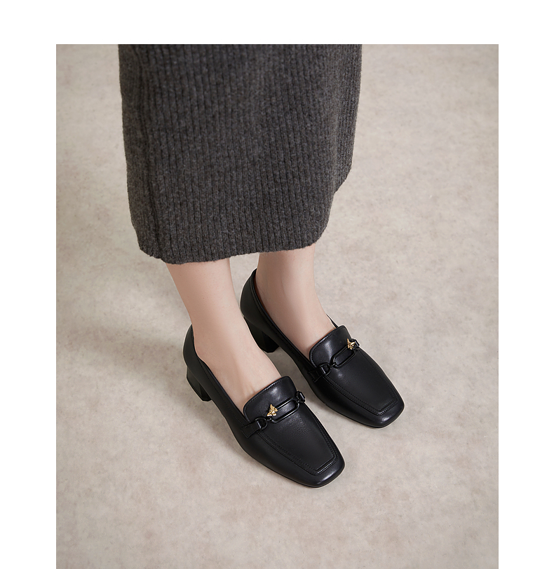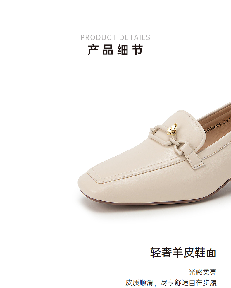 千百度正装乐福鞋女春季粗中跟方头小皮鞋通勤深口羊皮鞋A24149704
