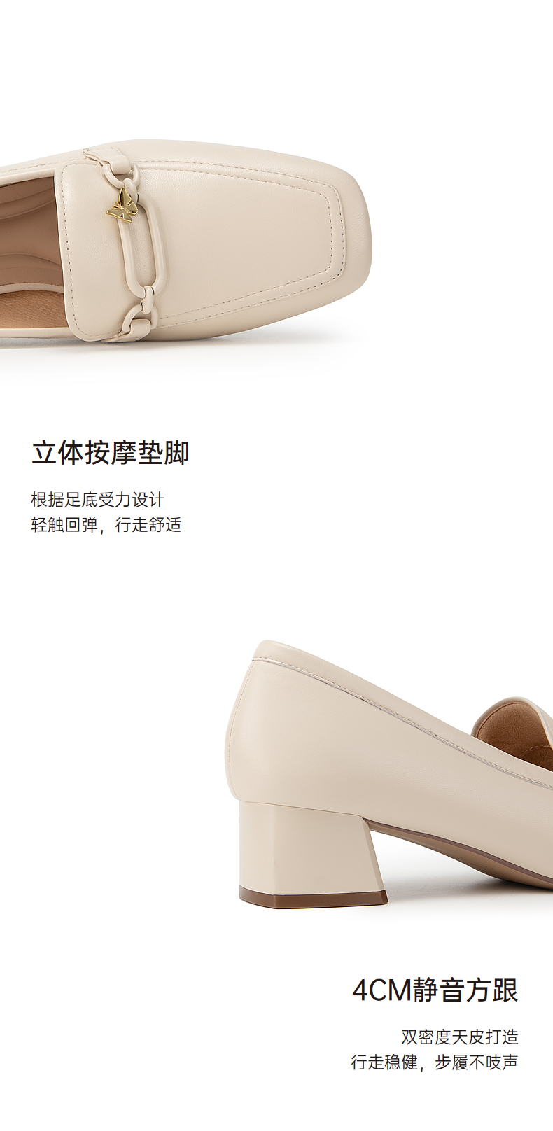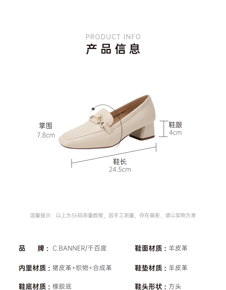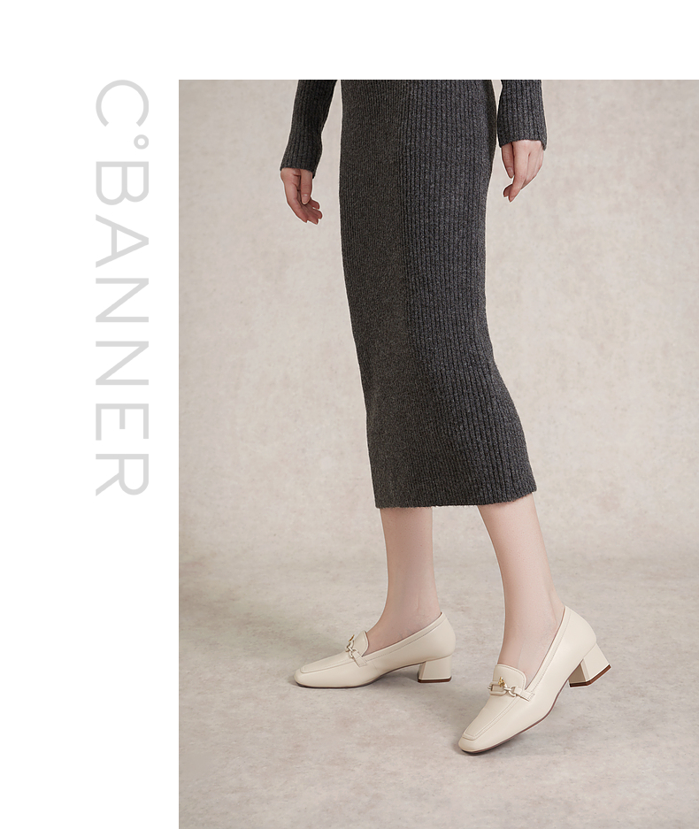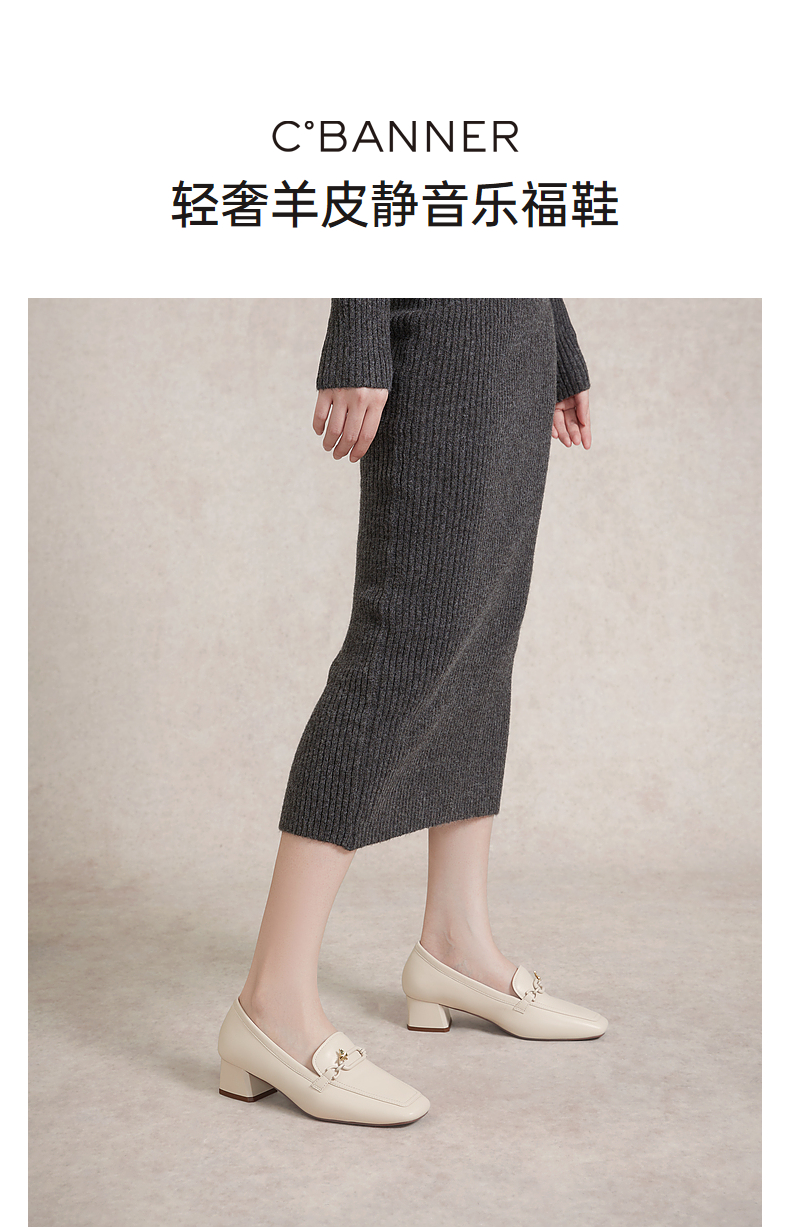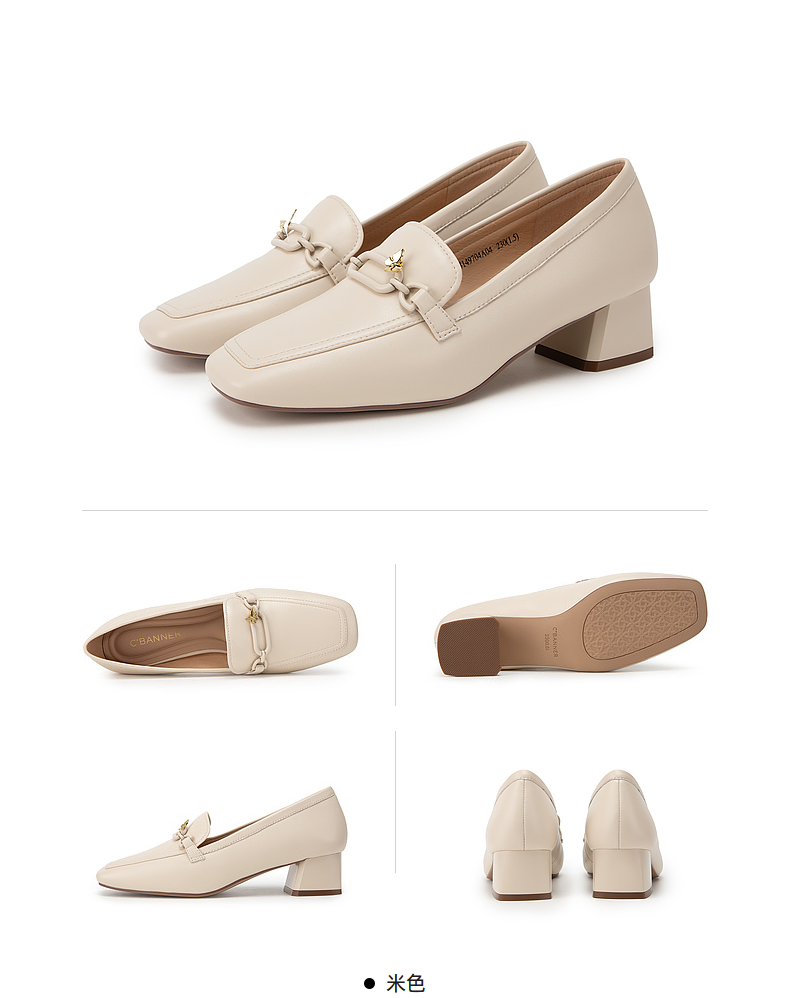 千百度正装乐福鞋女春季粗中跟方头小皮鞋通勤深口羊皮鞋A24149704