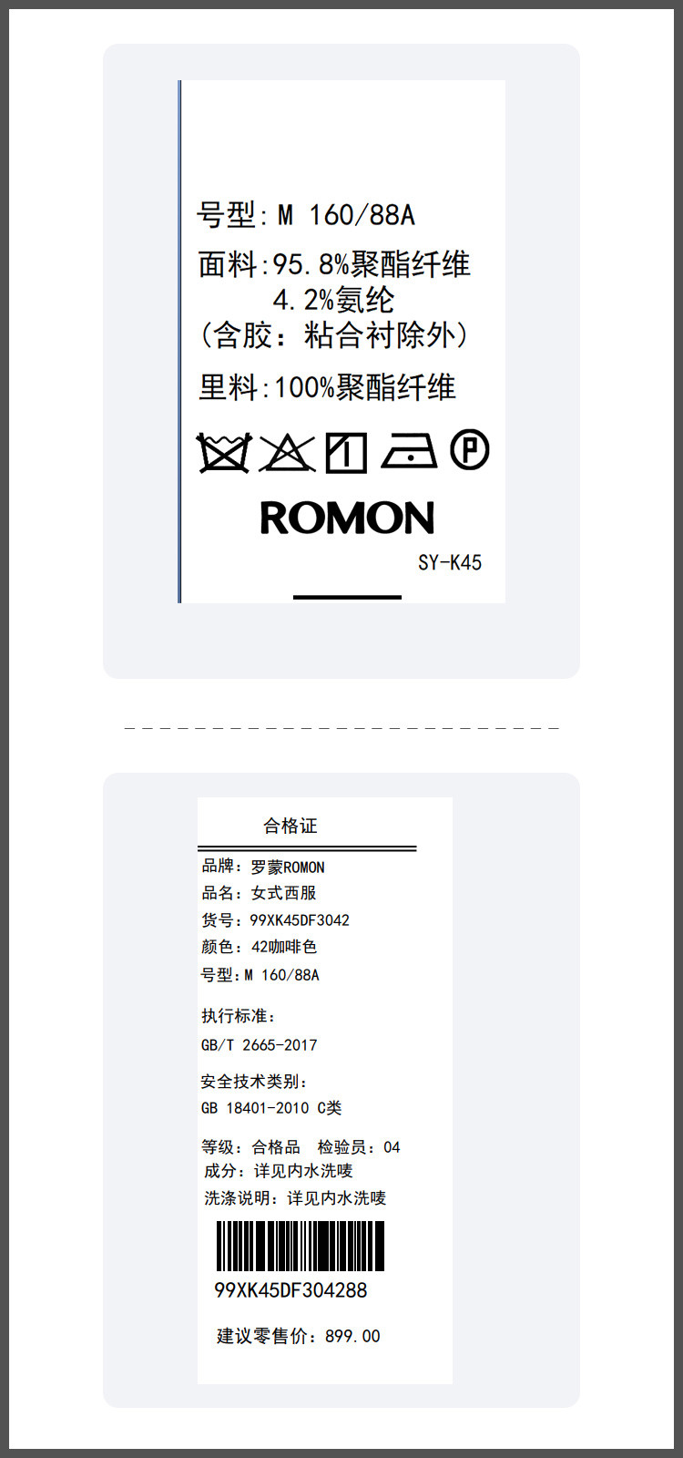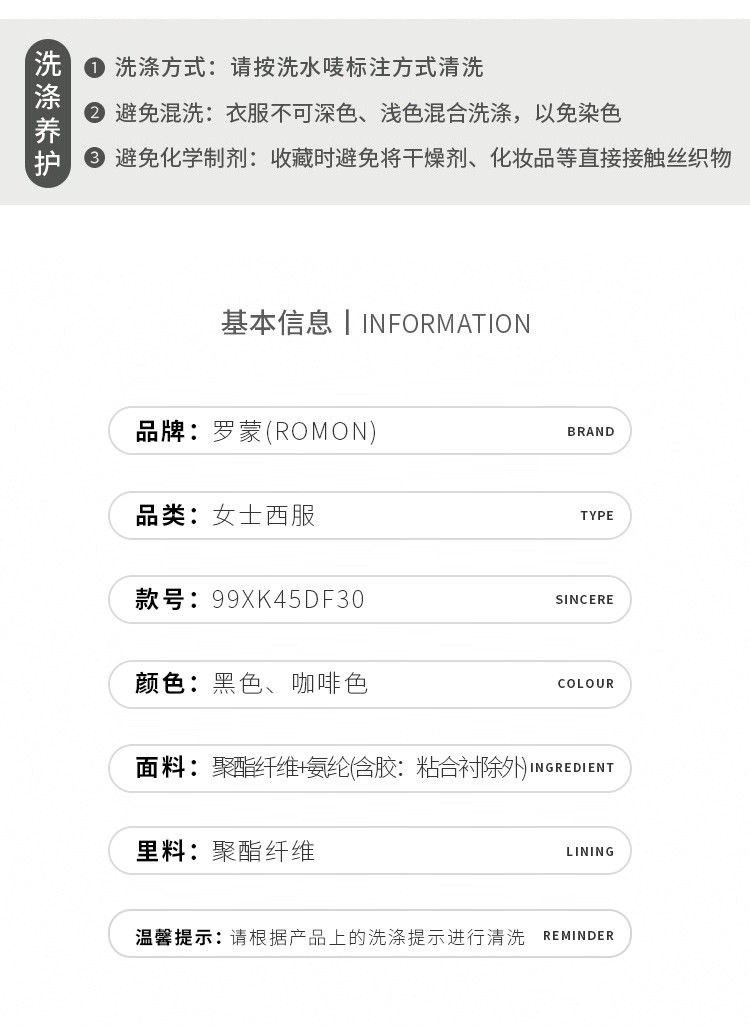 面料:95.8%聚酯纤维4.2%氨纶 (含胶:粘合衬除外) 里料:100%聚酯纤维