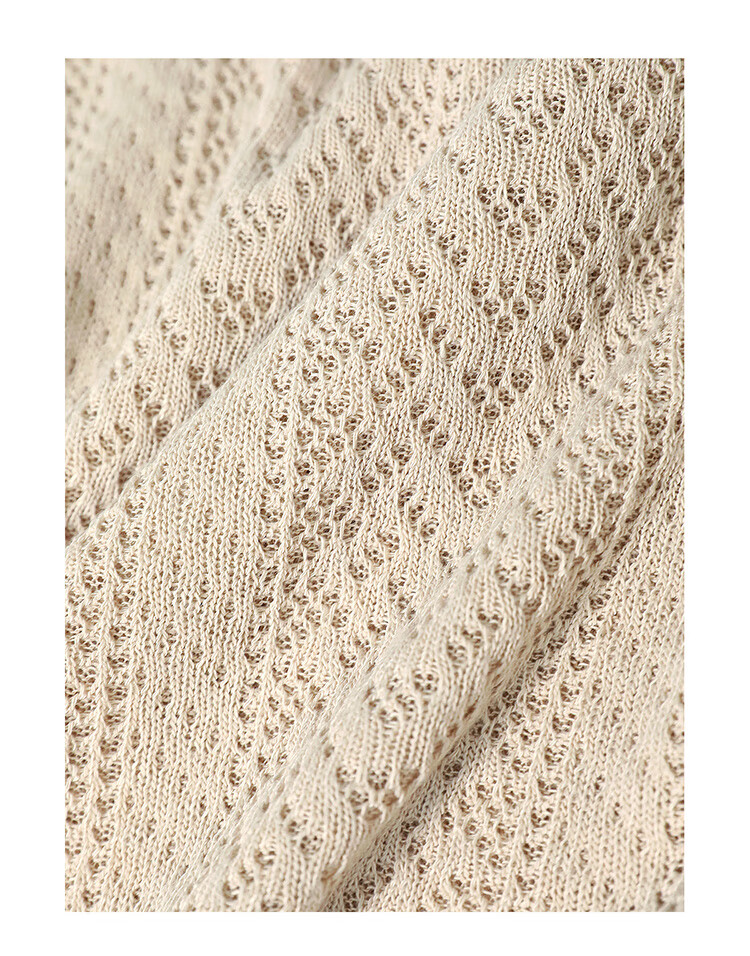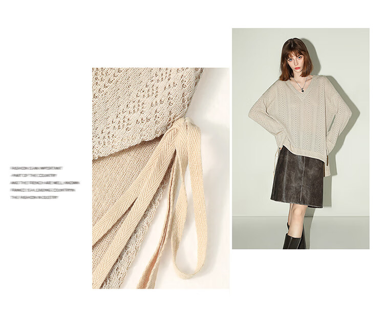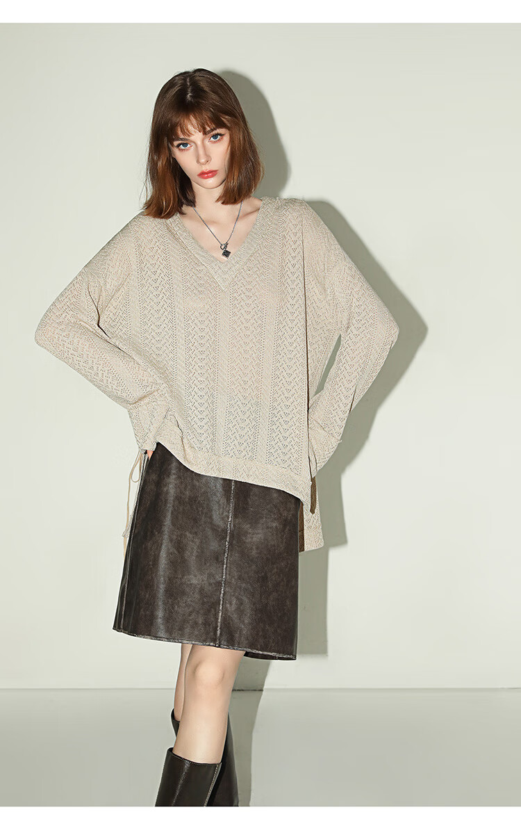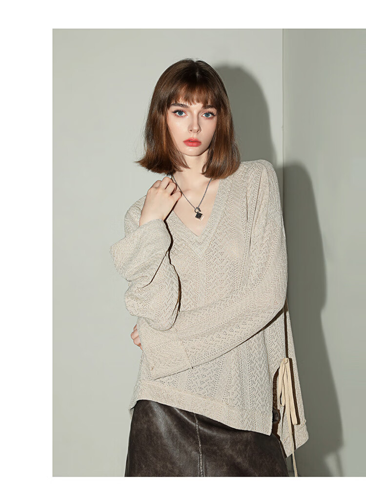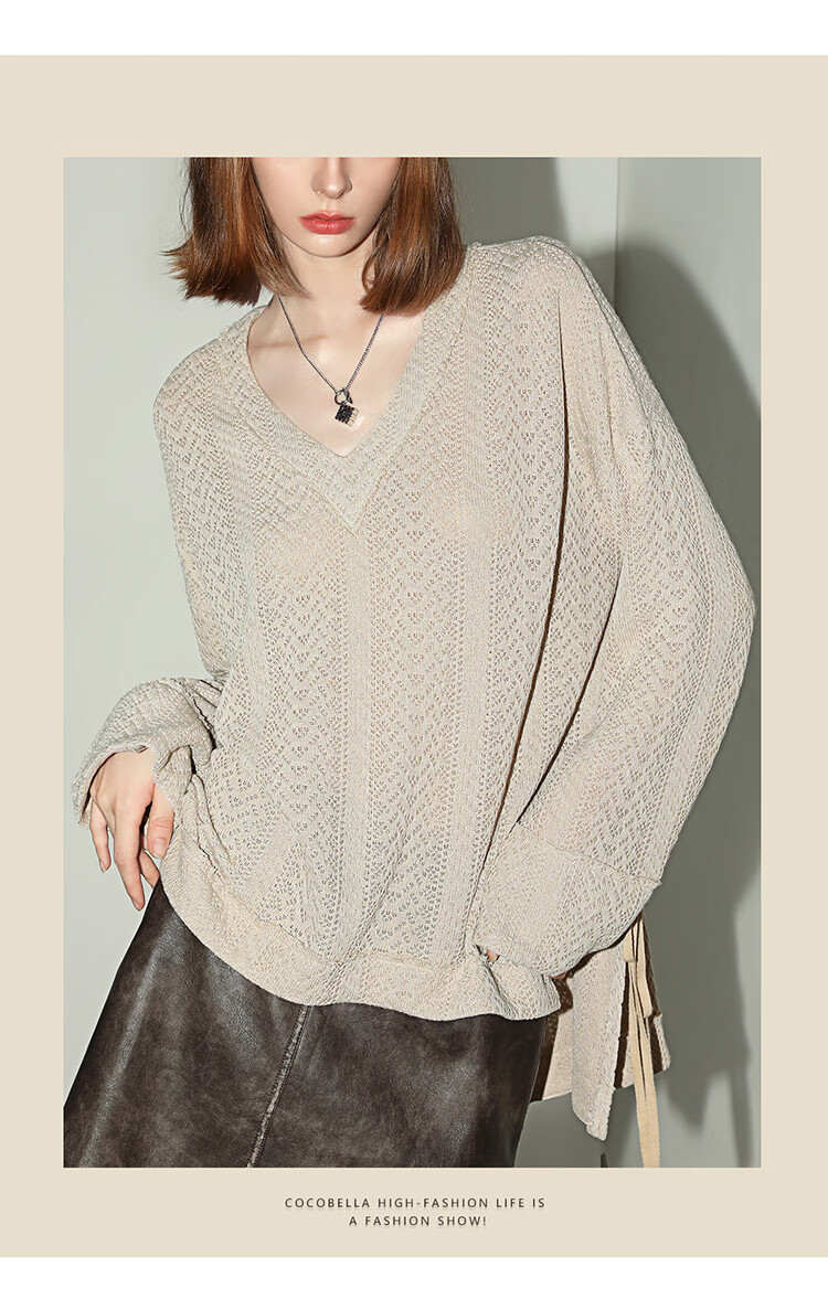 COCOBELLA设计师款精致镂空V领针织衫下摆开叉飘带毛衣MZ3099