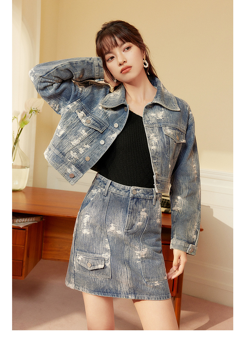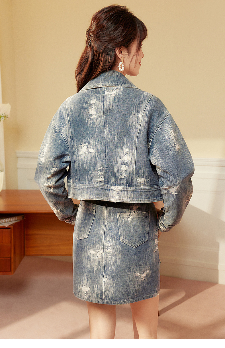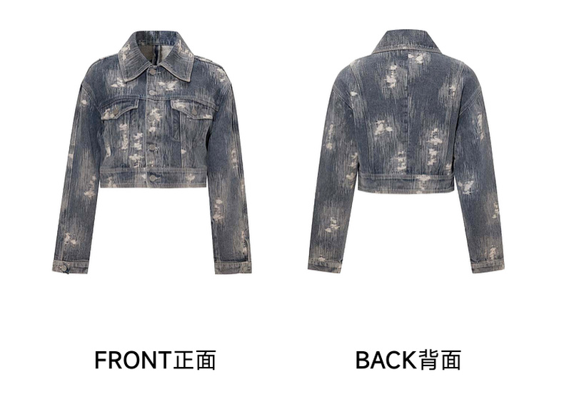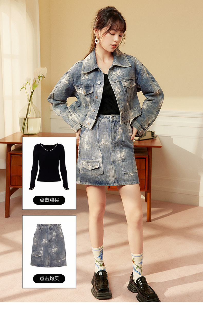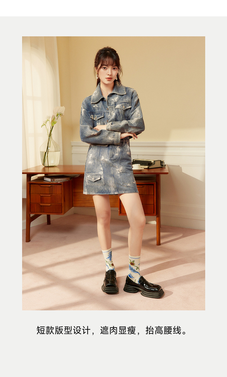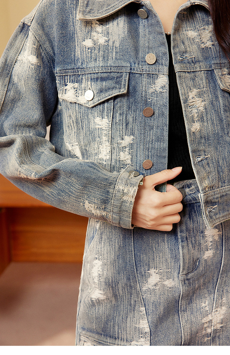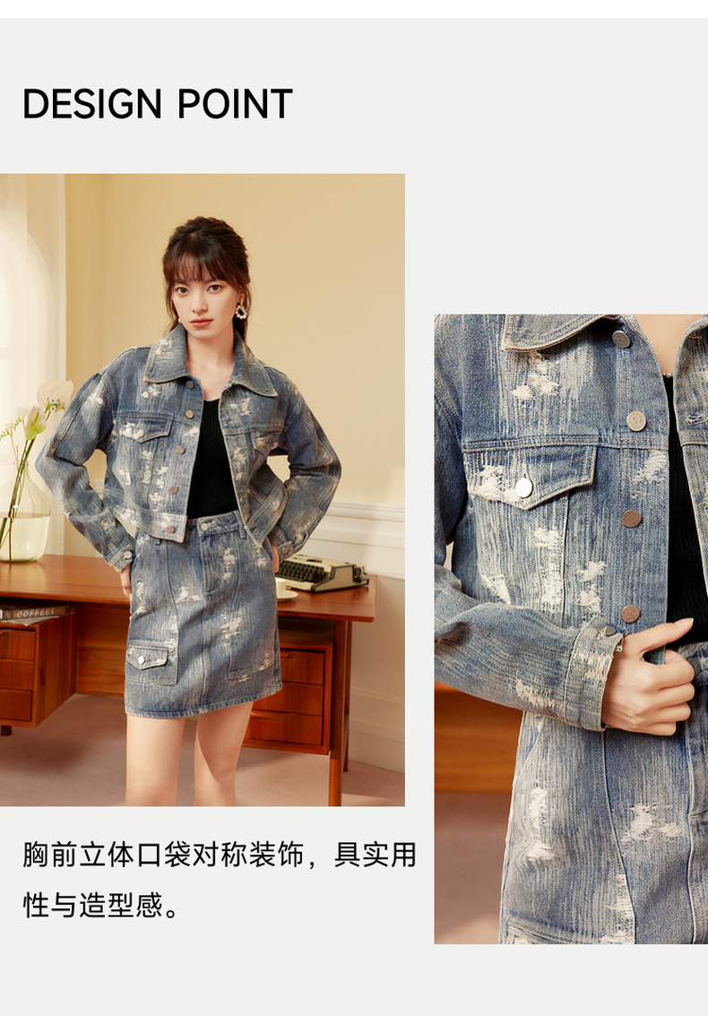 两三事发光摇摆2024春季新款复古做旧提花口袋装饰牛仔外套女短款