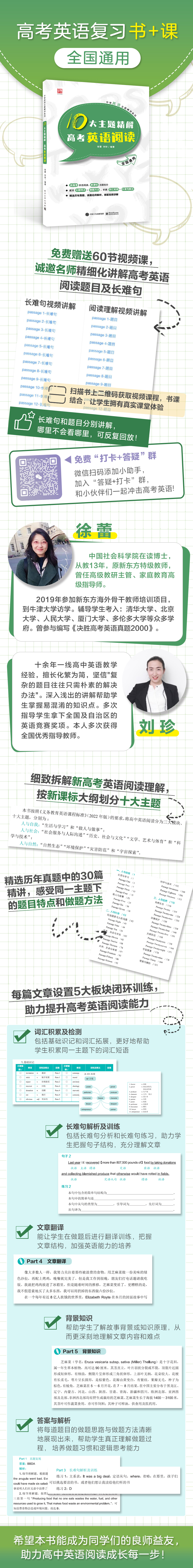 细致拆解新高考阅读理解按新课标大纲划分十大主题感受同一主题下的题目特点与做题方法积累同一主题下的词汇短语和长难句解法精选历年真题,诚邀名师解析,搭配视频讲解