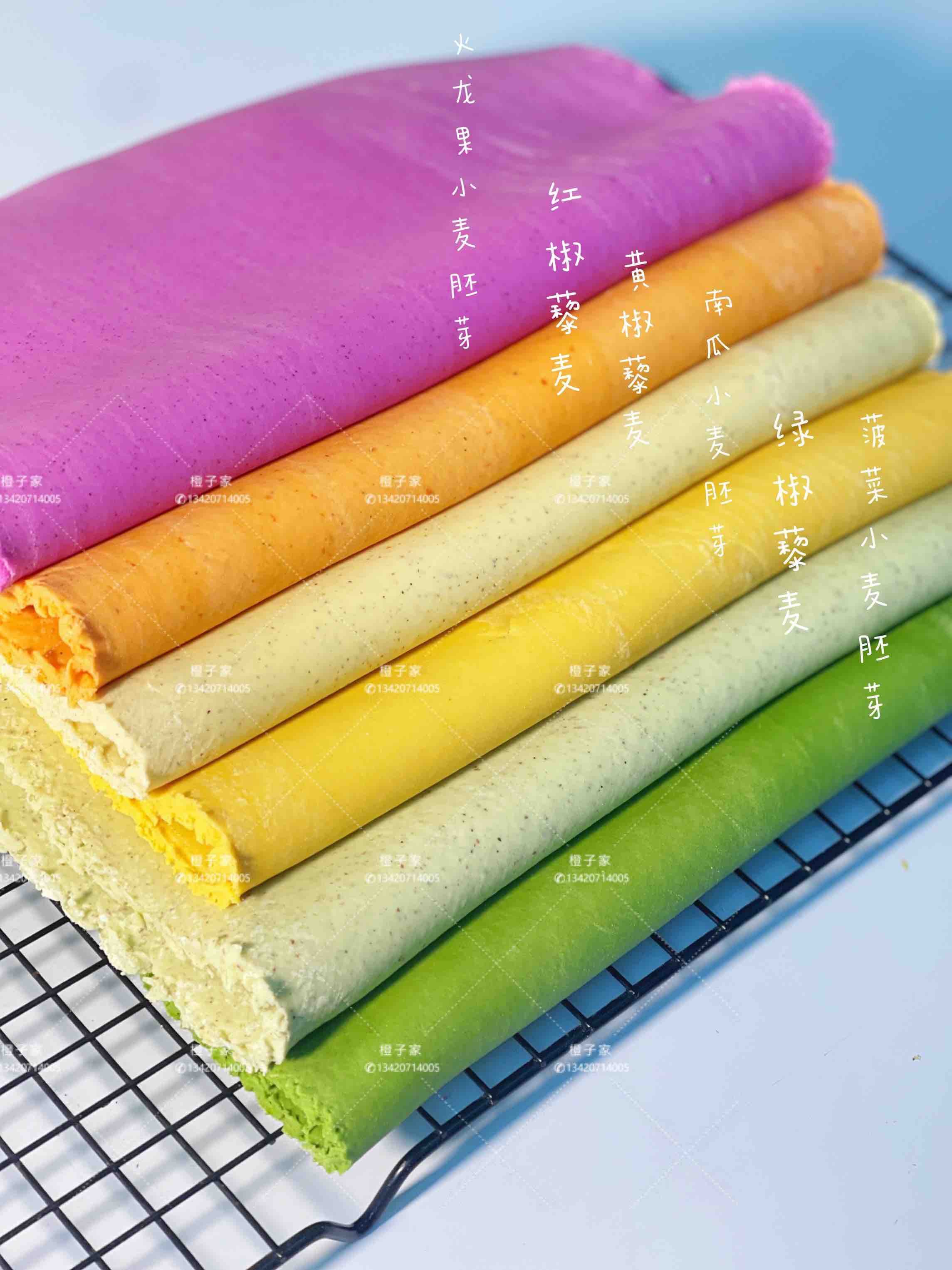 面皮:(菠菜、南瓜、火龙果、黄甜椒、红甜椒、绿甜椒等)新鲜果蔬泥、小麦胚芽、三色藜麦、小麦粉