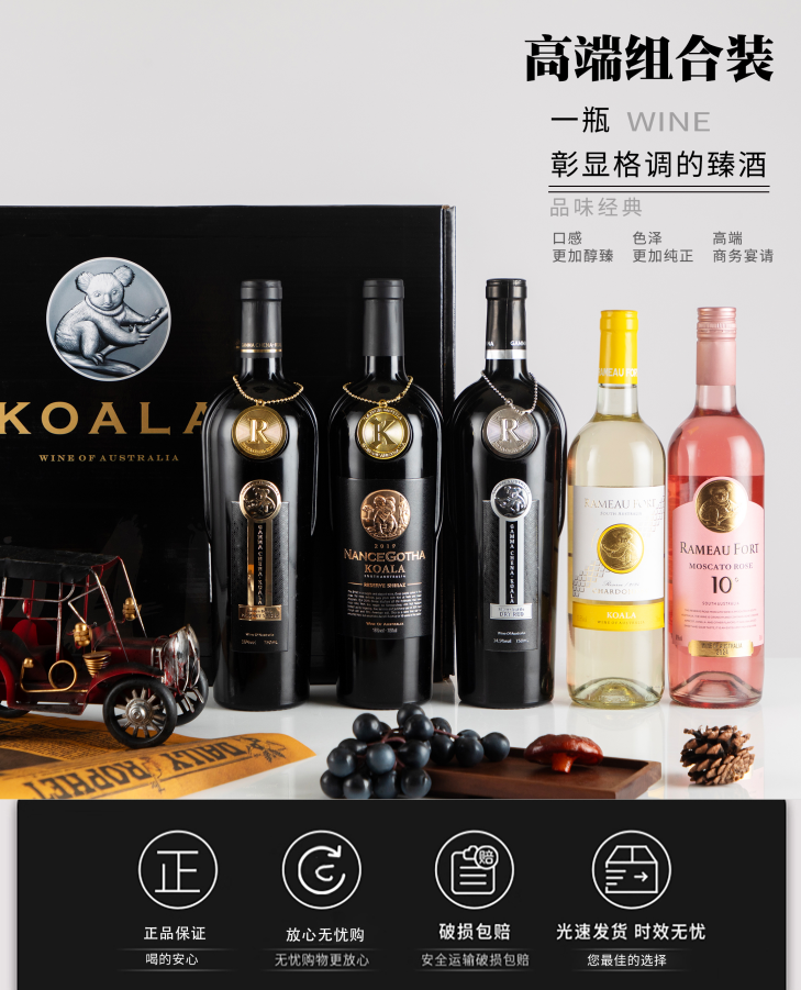 热卖中!!【澳洲进口】考拉珍藏礼盒(拉摩图堡·10°珍藏莫斯卡托桃红+拉摩图堡·考拉珍藏霞多丽干白+南斯·歌达®考拉珍藏西拉干红+佳歌·图昂®考拉金樽干红+佳歌·图昂®考拉银樽干红)