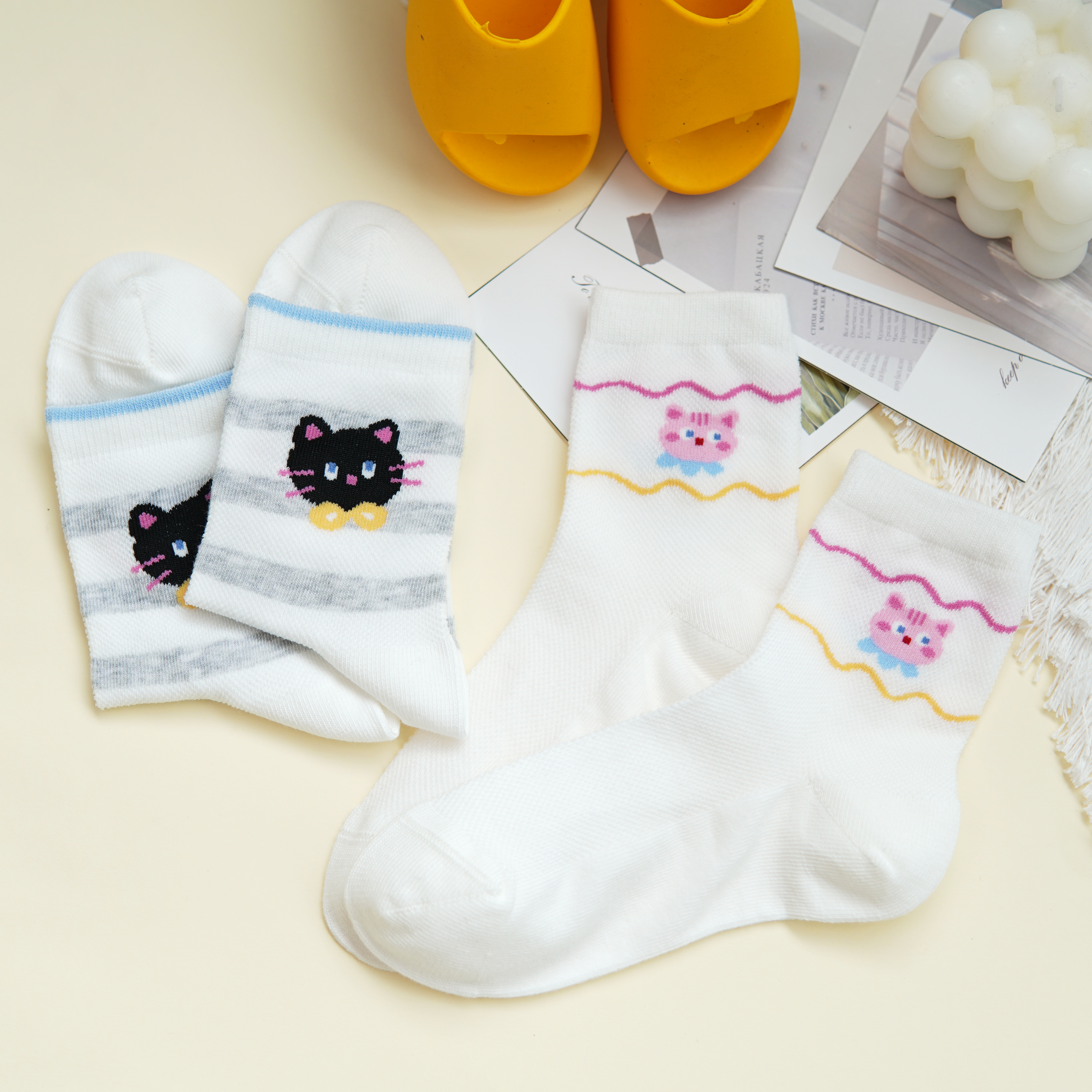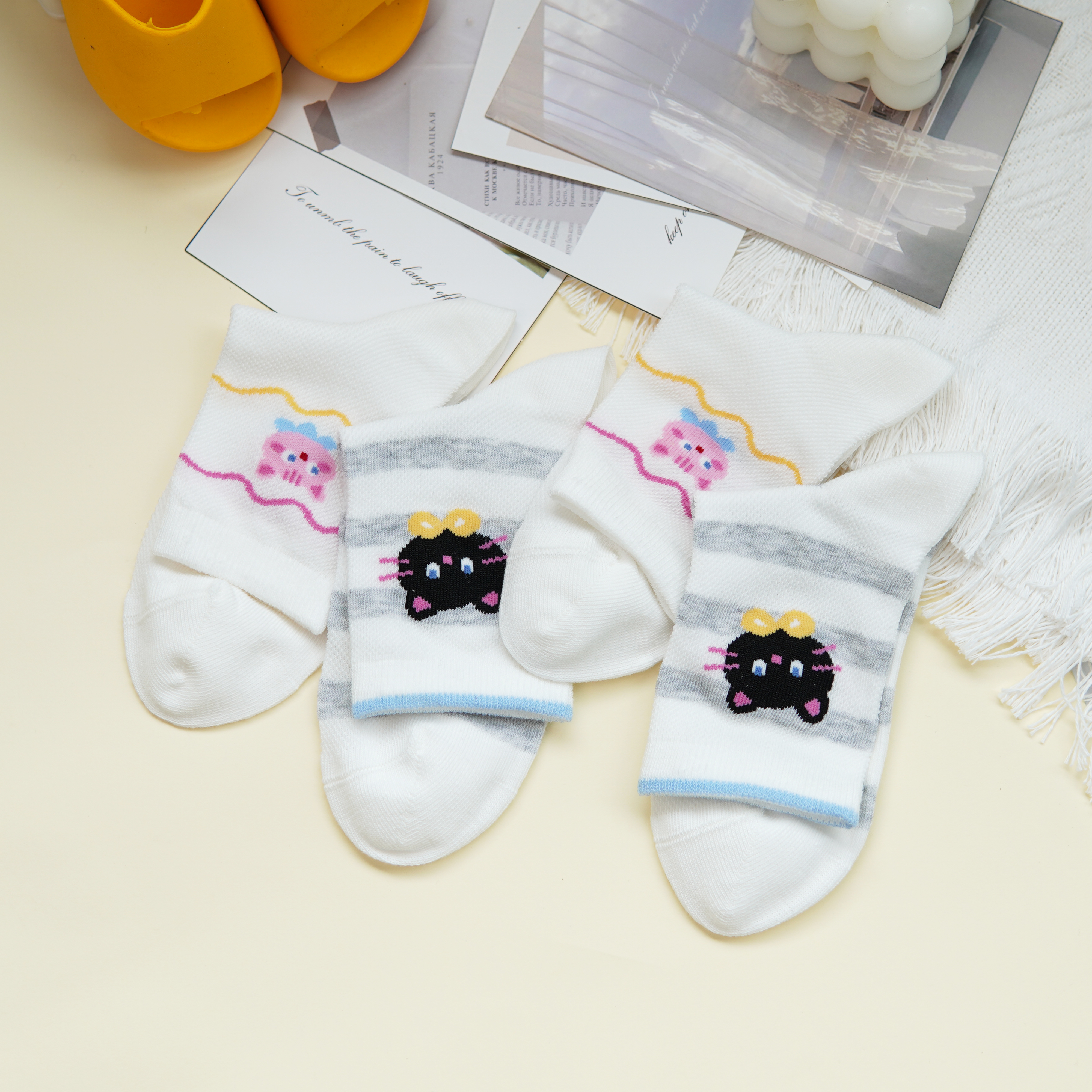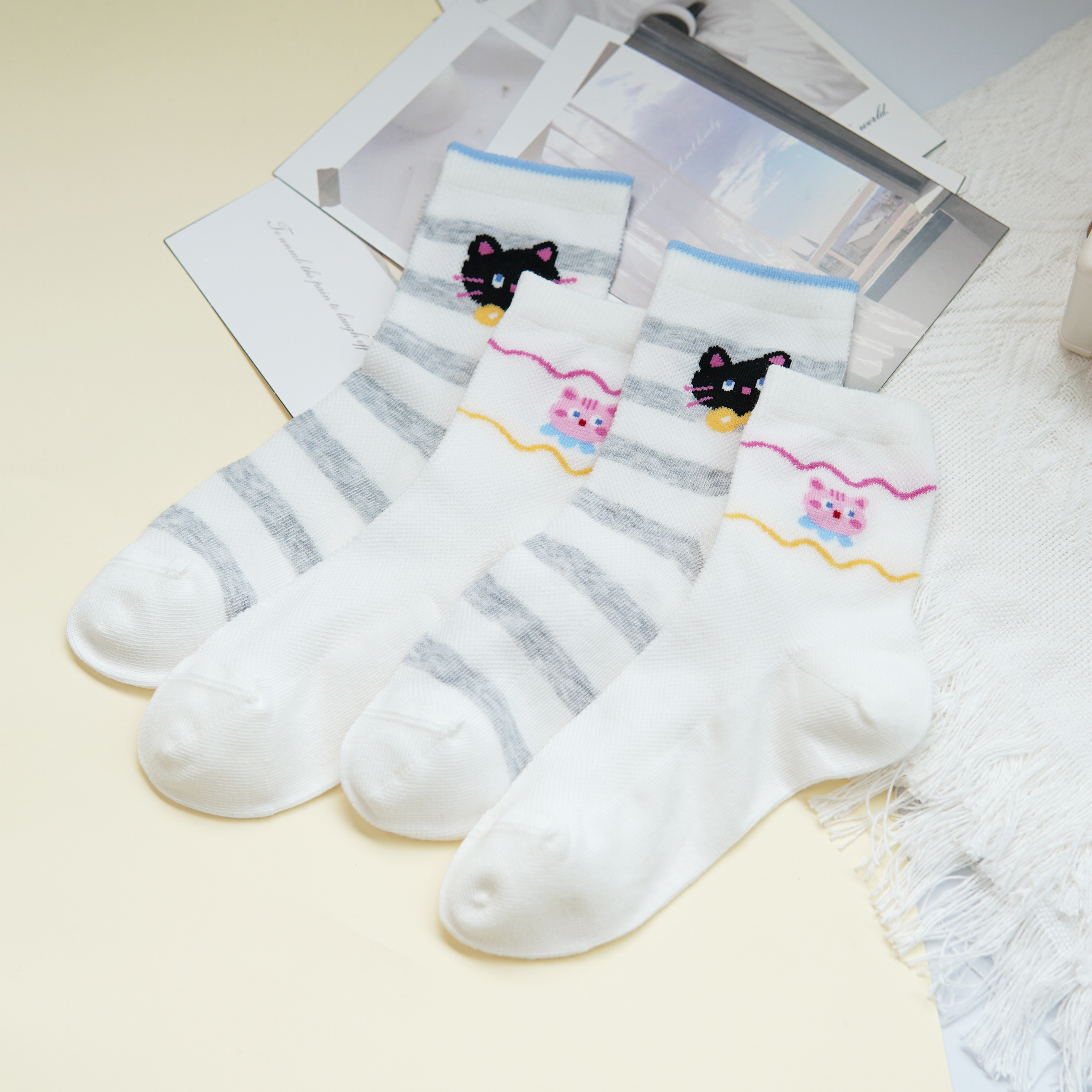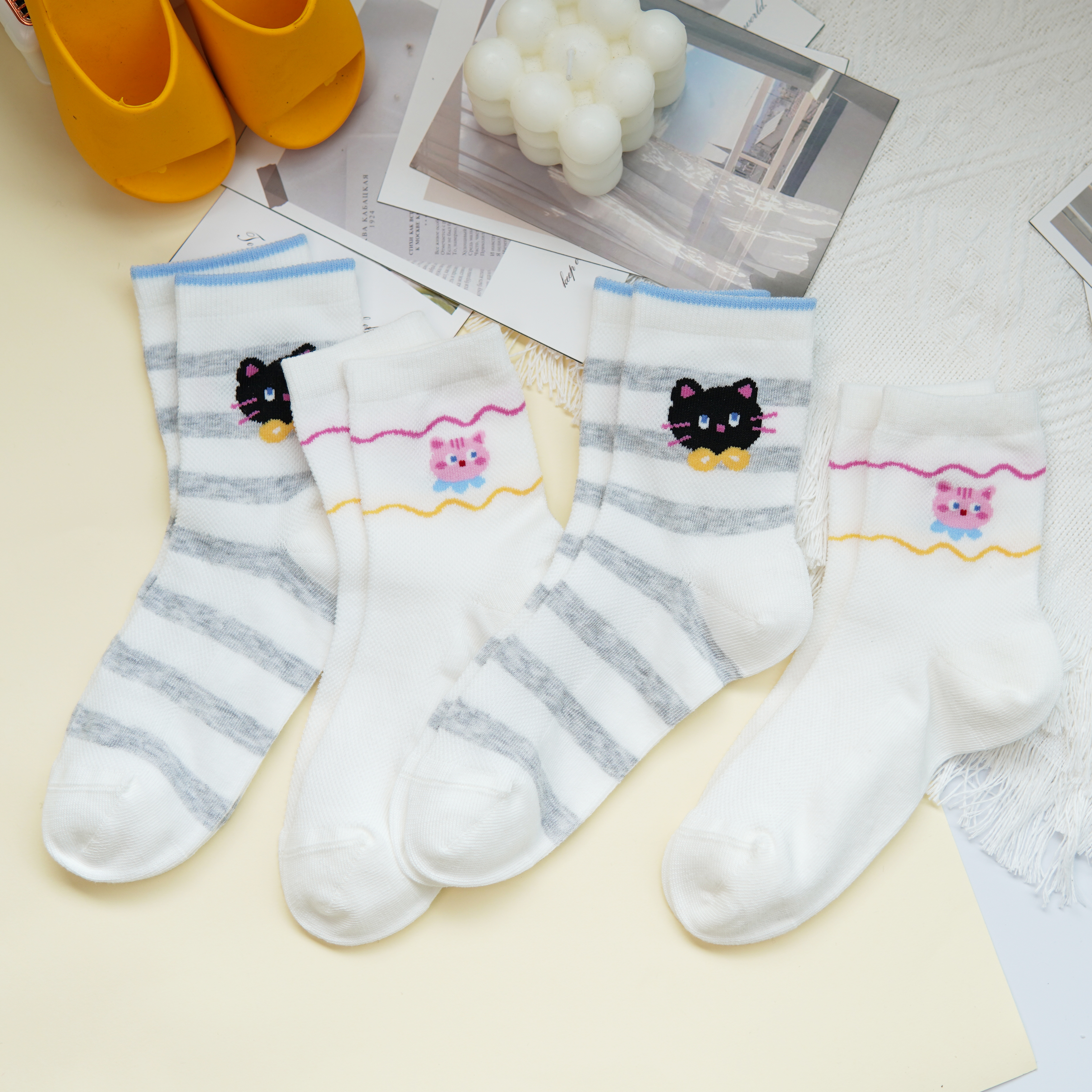 【6双6折】【32-35码】大童卡通可爱棉袜条纹猫咪女宝袜子春夏薄时尚袜【2双装】【2613207】