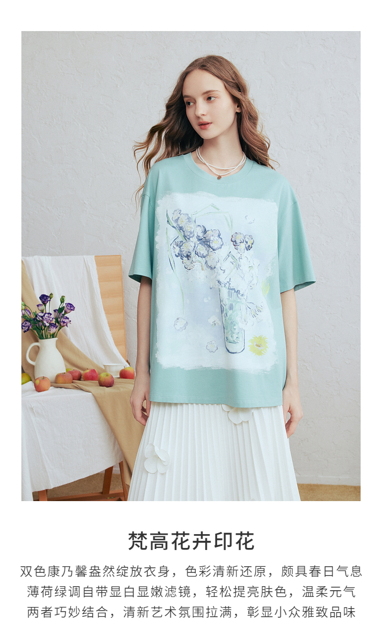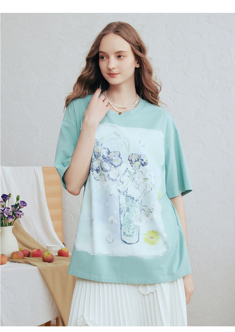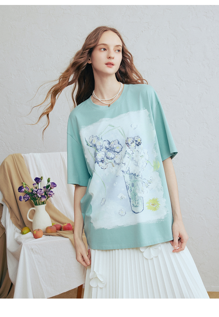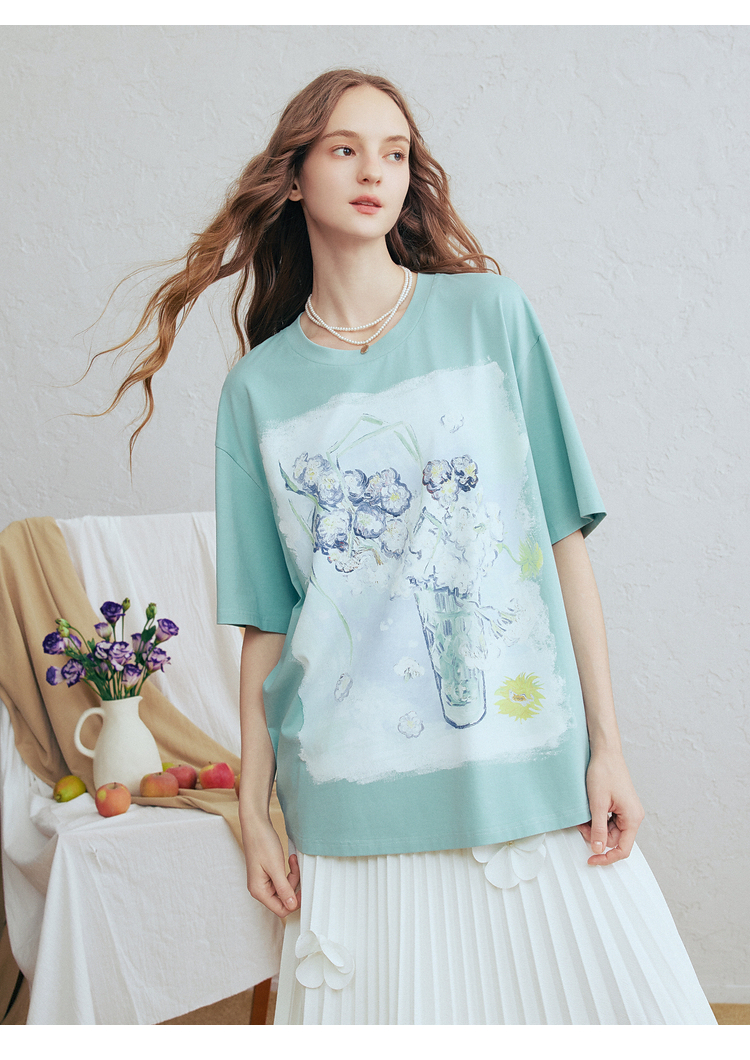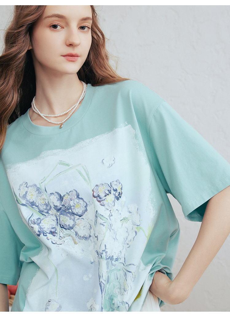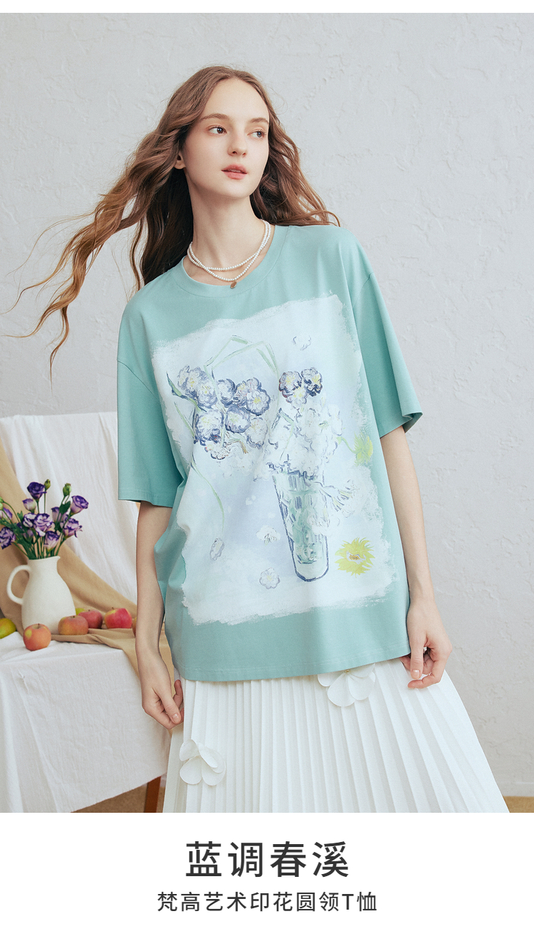 两三事梵高文艺蓝调春溪2026春新款立体手钩花印花短袖t恤女宽松