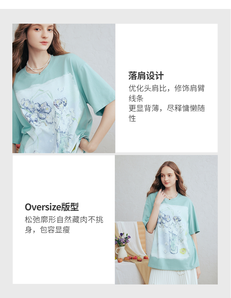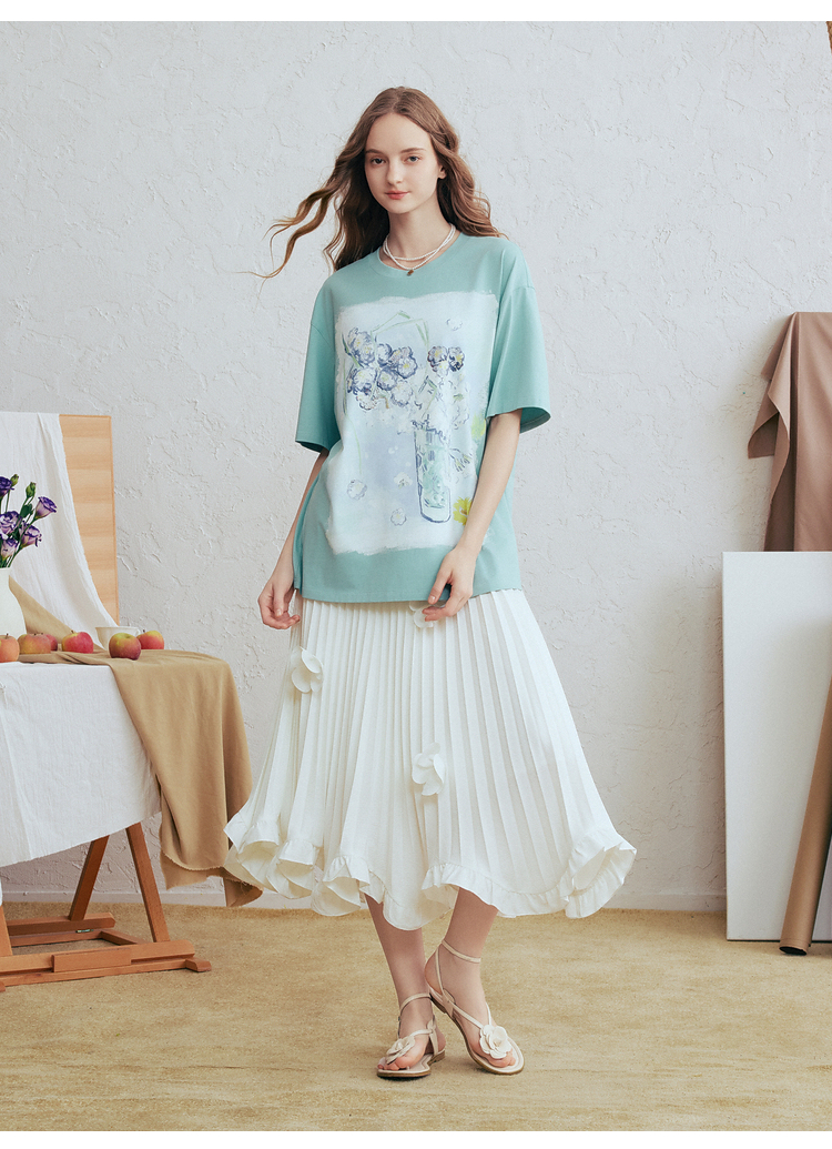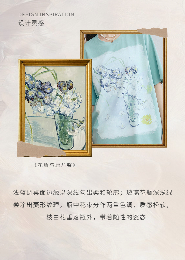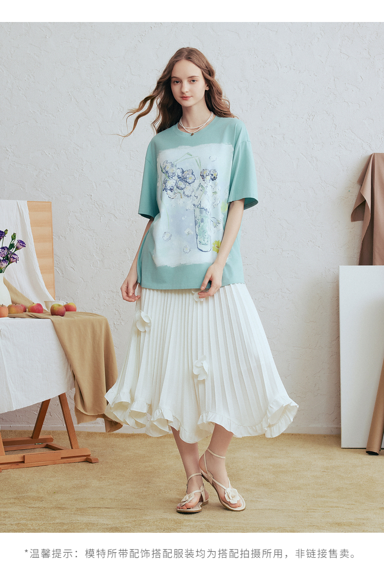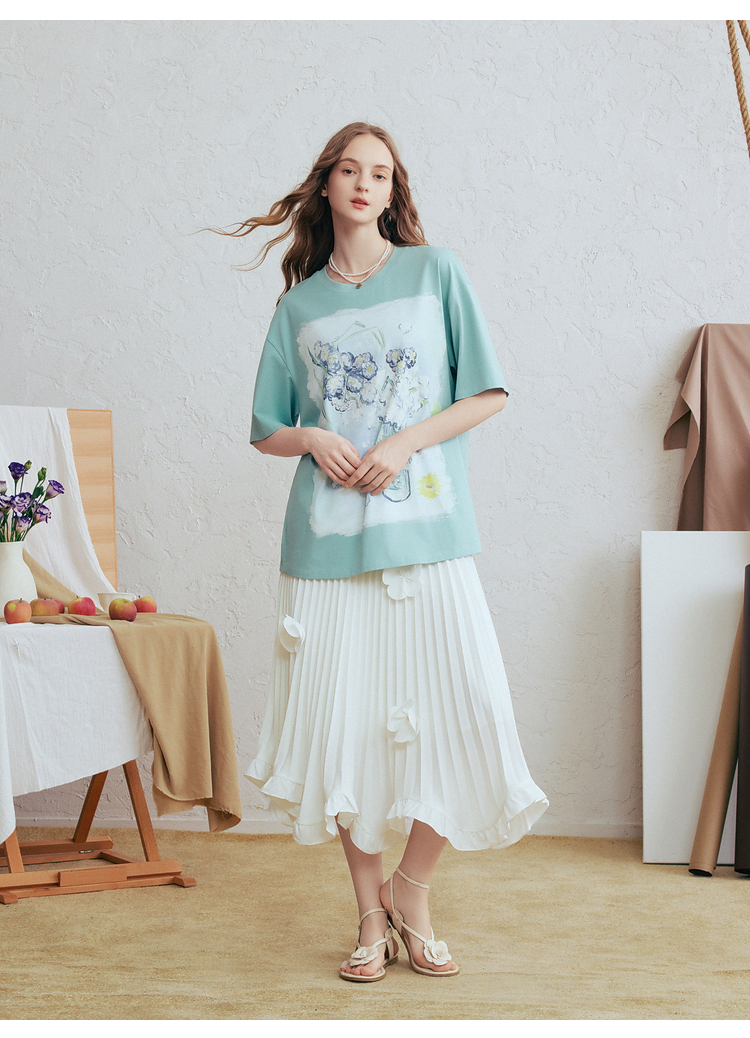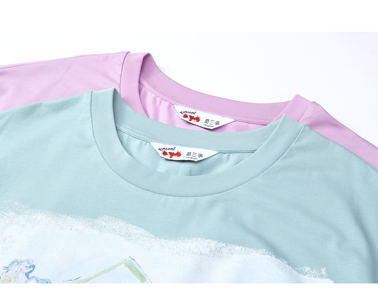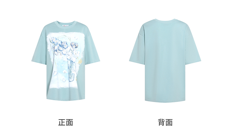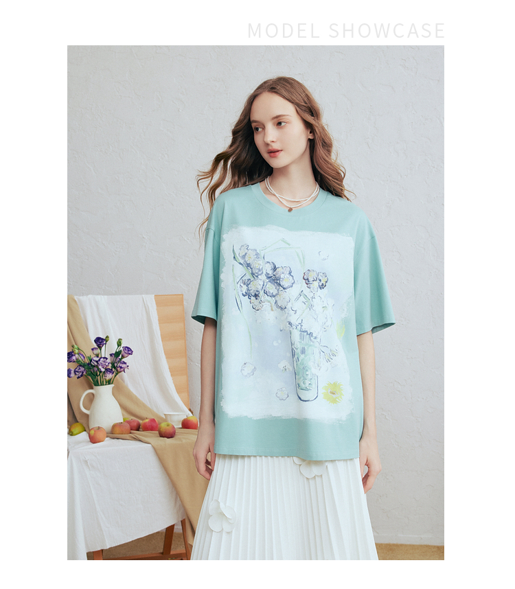 两三事梵高文艺蓝调春溪2026春新款立体手钩花印花短袖t恤女宽松