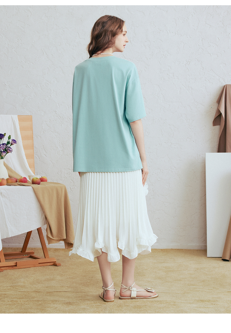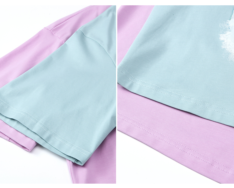 两三事2024夏季新款甜美蕾丝印花拼接假两件t恤女宽松