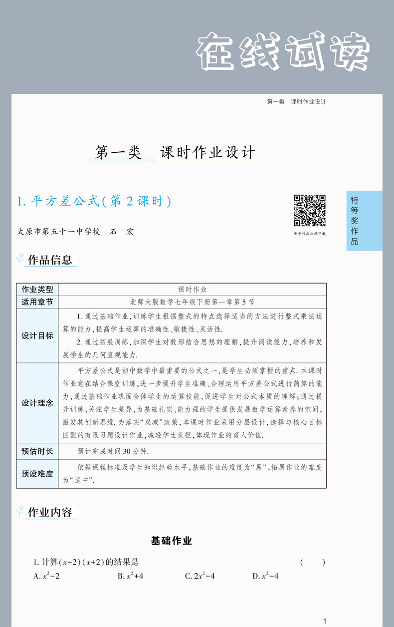 山西省首届中小学教师作业设计大赛获奖作品选 初中数学 教学设计