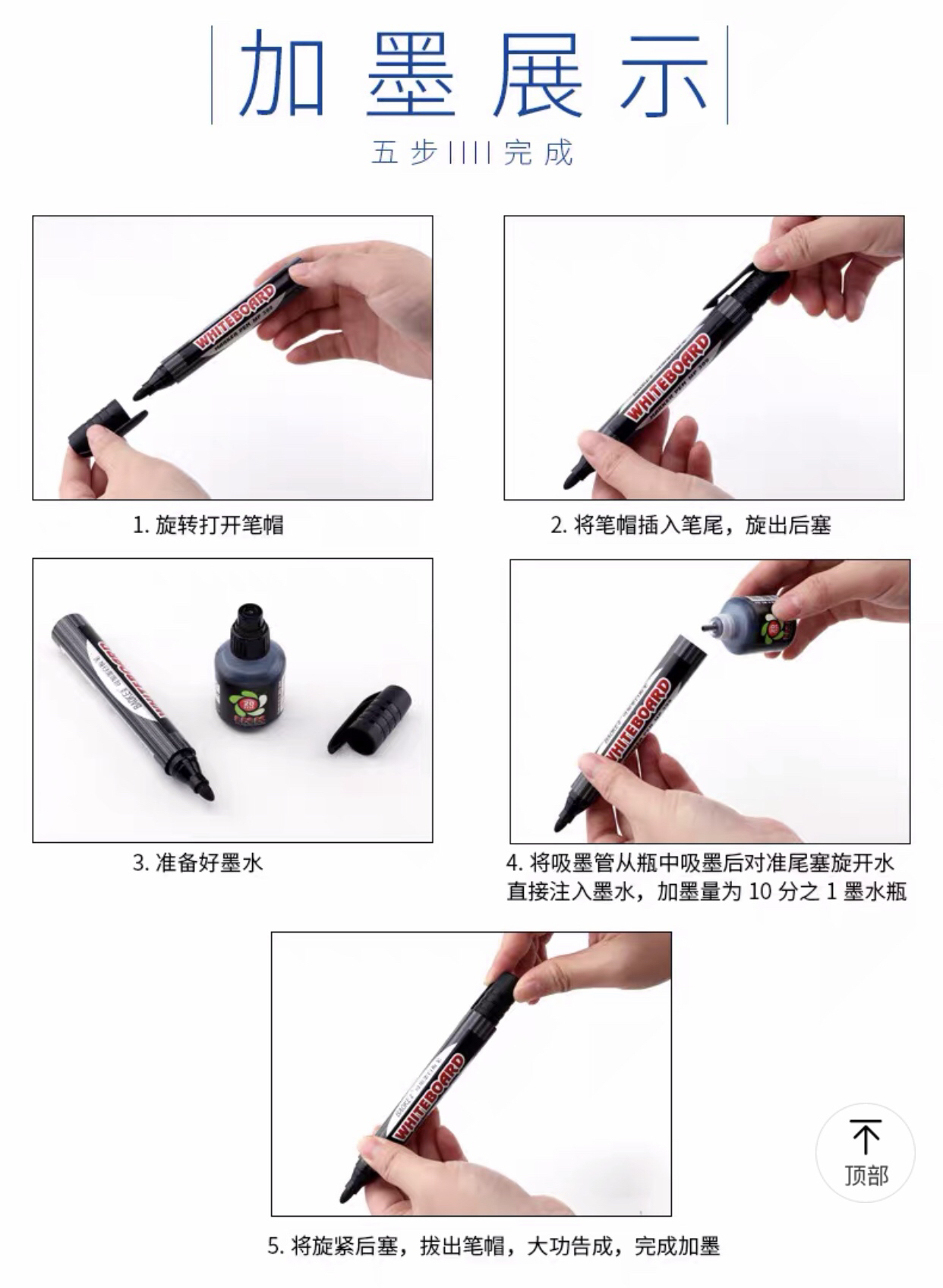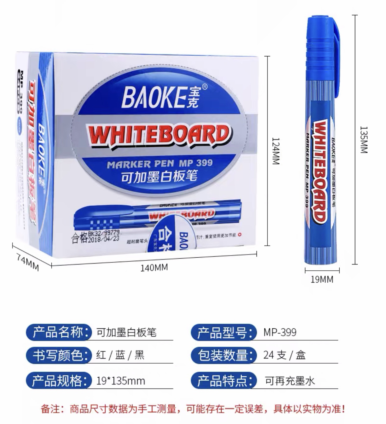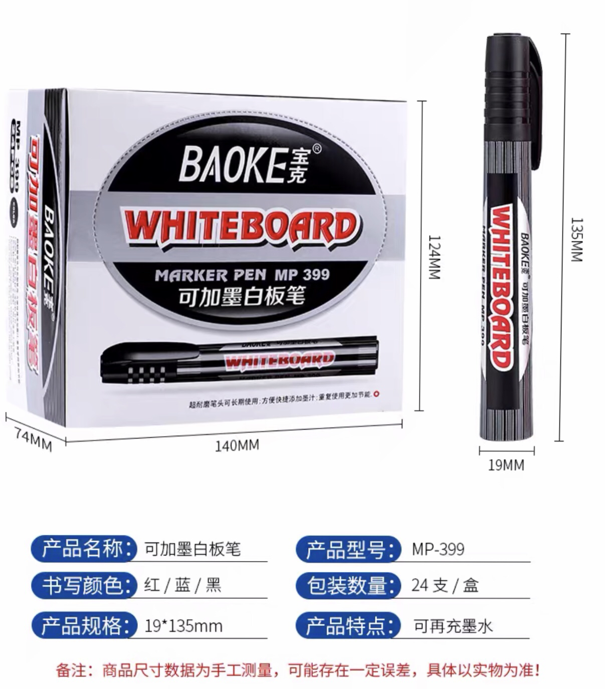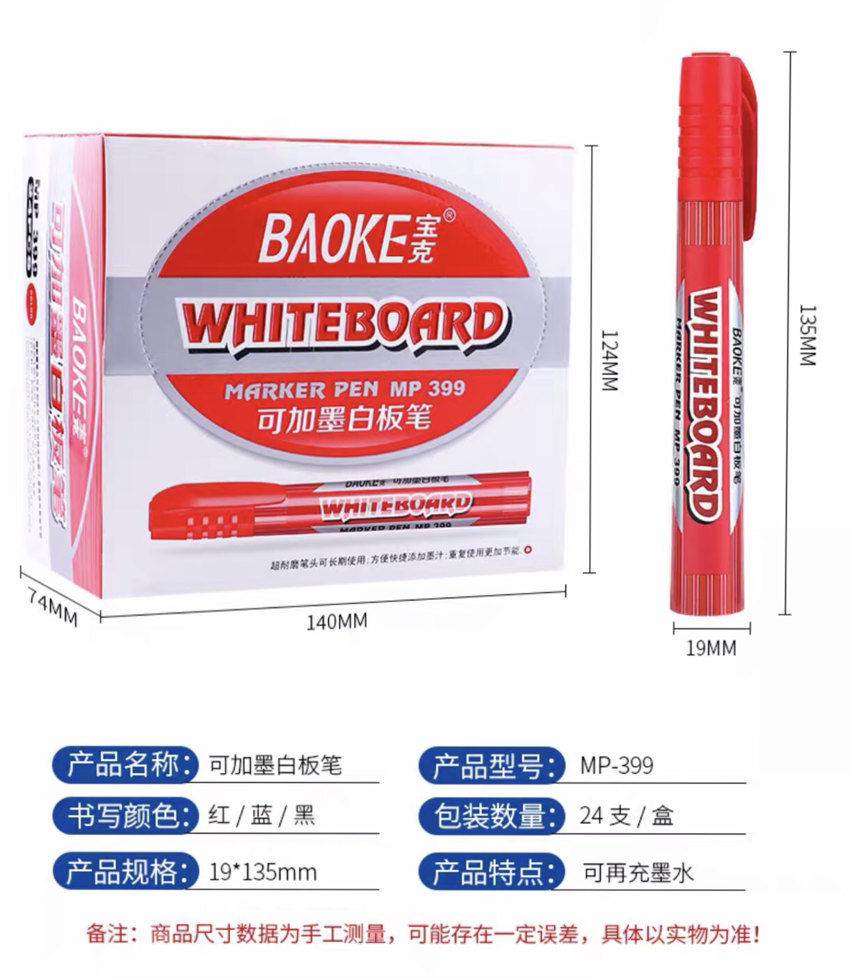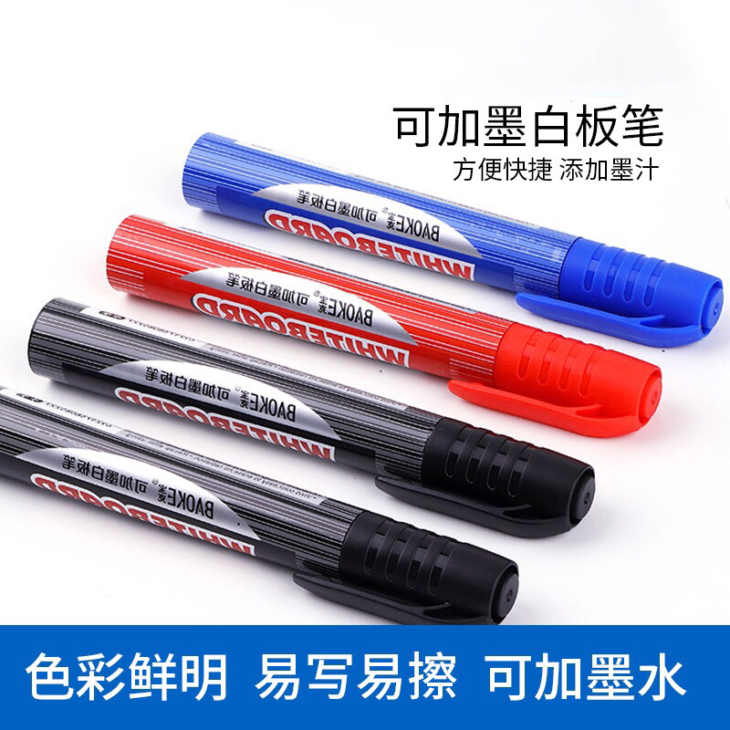宝克中字可加墨白板笔mp399黑色红色蓝色单头教学细白板笔