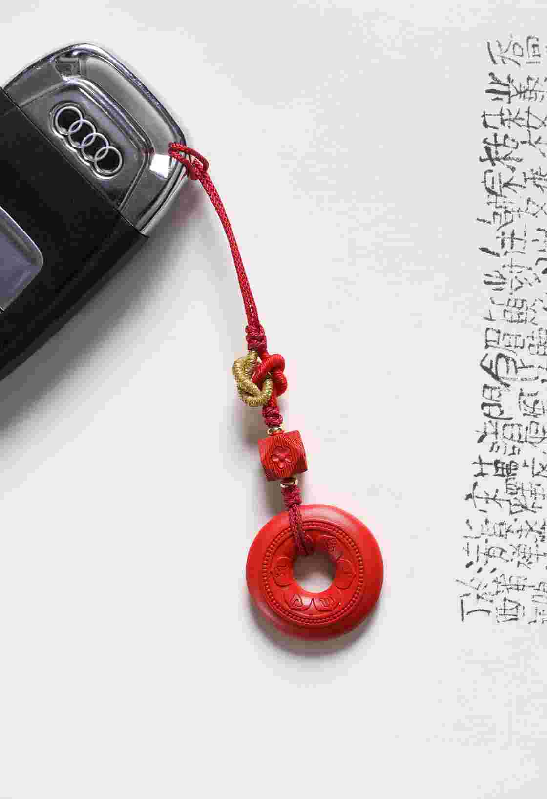 配件:朱砂平安喜乐“六字真言”平安扣,朱砂掐丝梅花八棱珠,铜飞碟