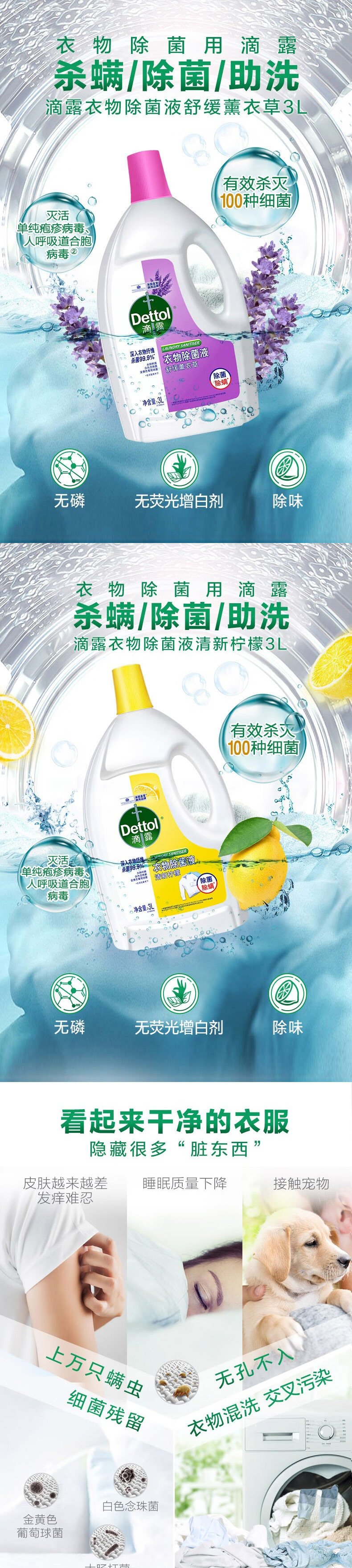 滴露(Dettol)衣物除菌液3L 薰衣草 安心配方 高效除螨