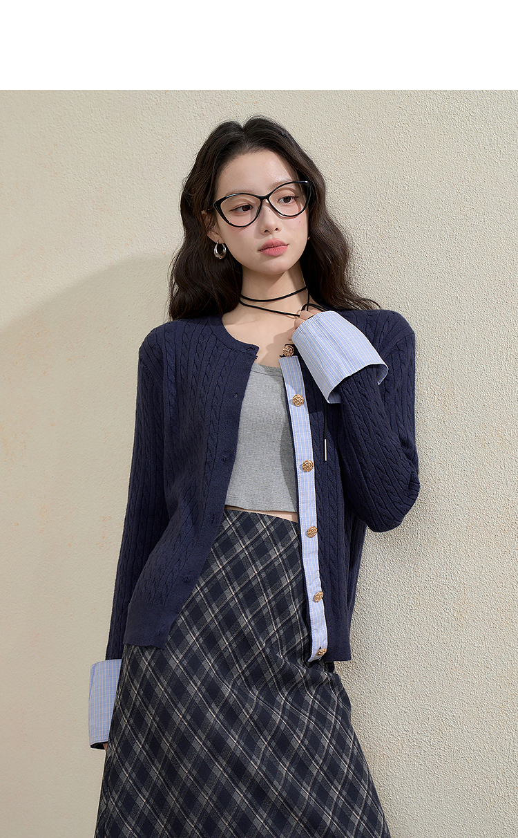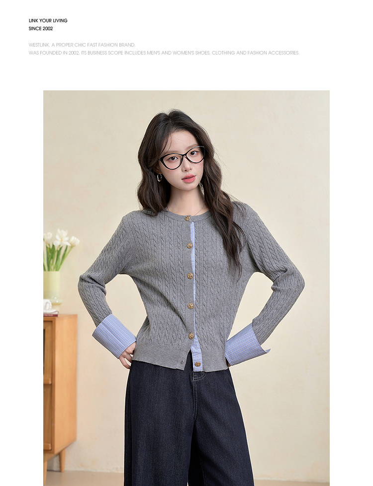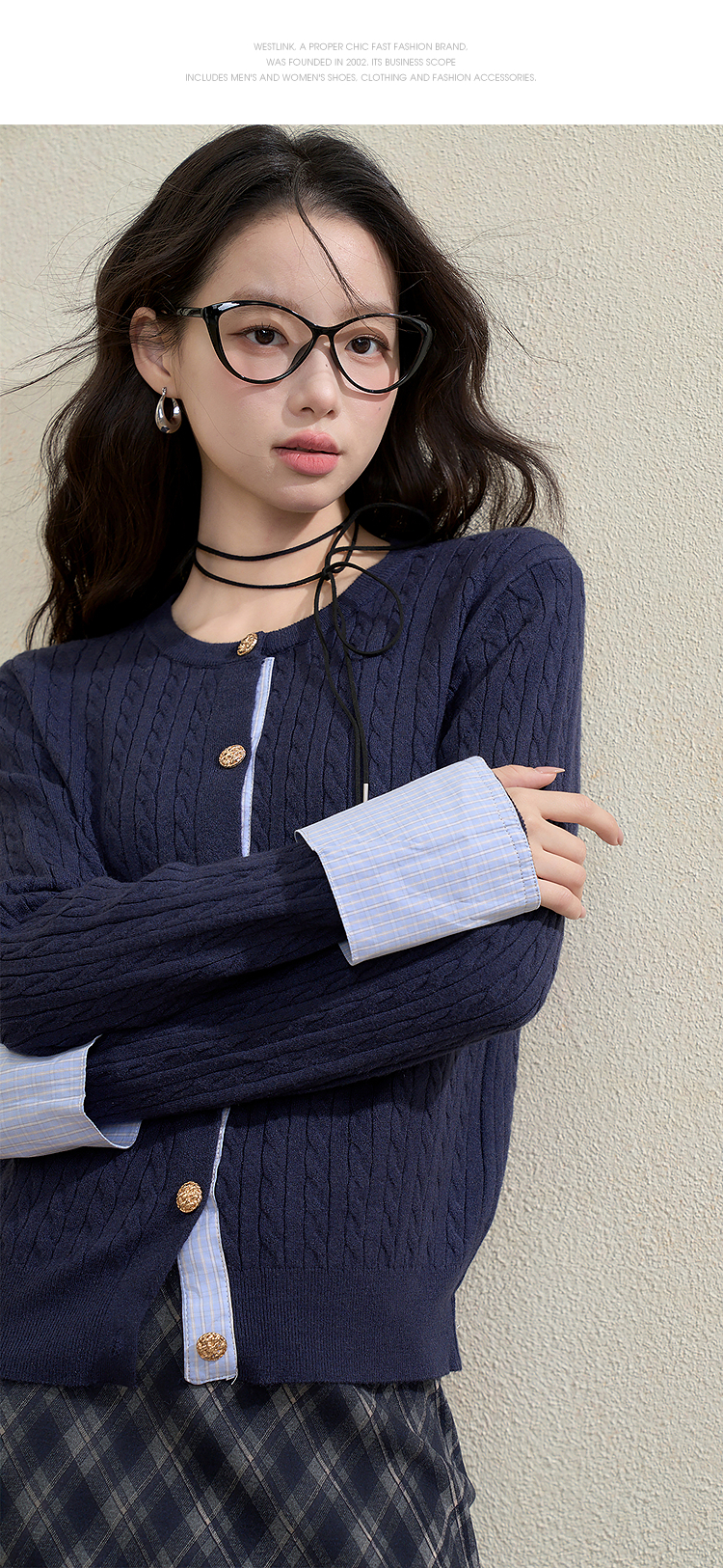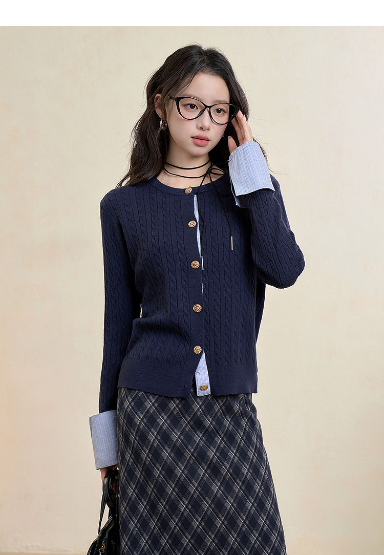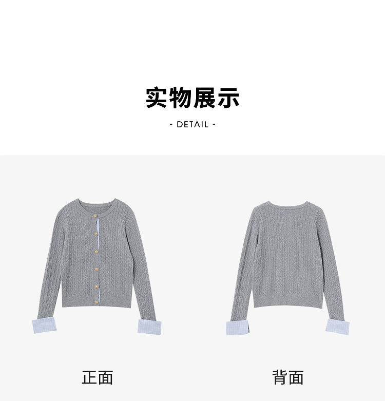 西遇通勤短款针织开衫女秋季新款圆领撞色格纹拼接毛衣外套Y0055211