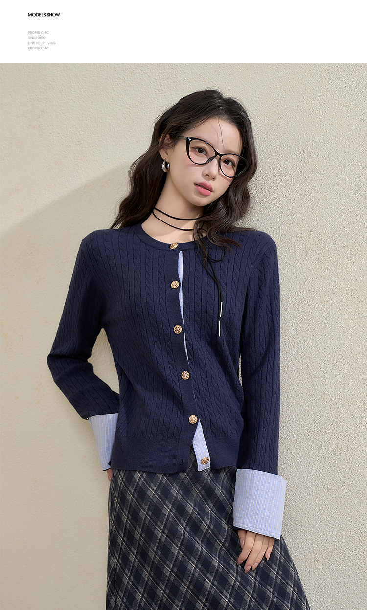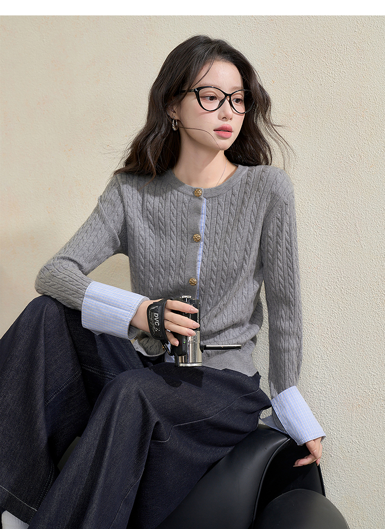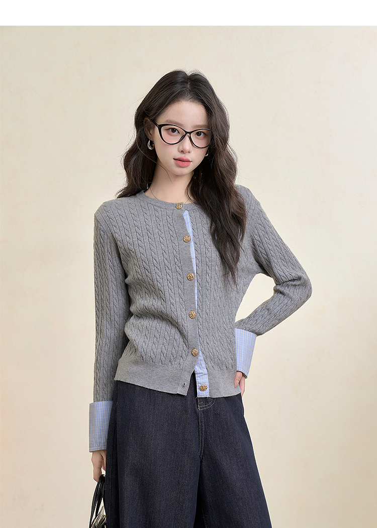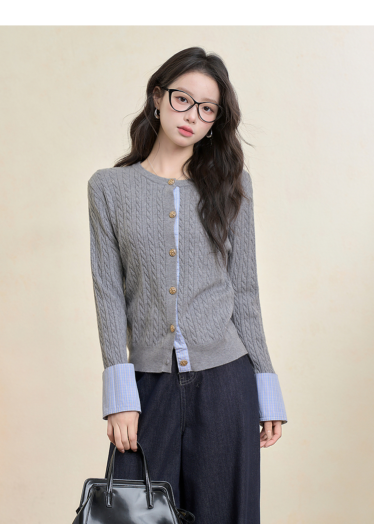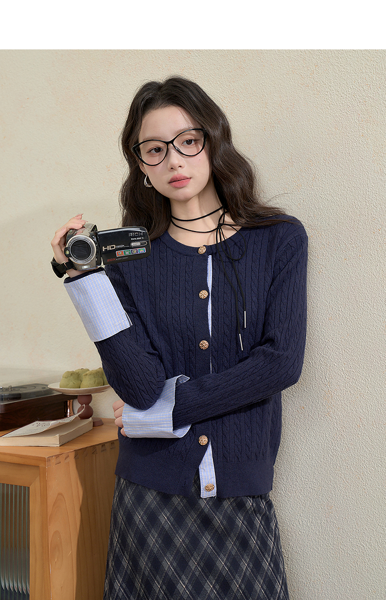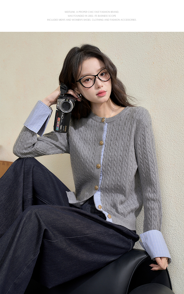 西遇通勤短款针织开衫女秋季新款圆领撞色格纹拼接毛衣外套Y0055211