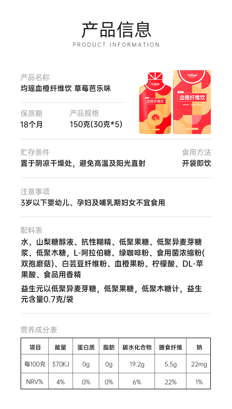 均瑶健康血橙纤维饮膳食纤维0蔗糖0脂肪(草莓芭乐味)30g*5/盒