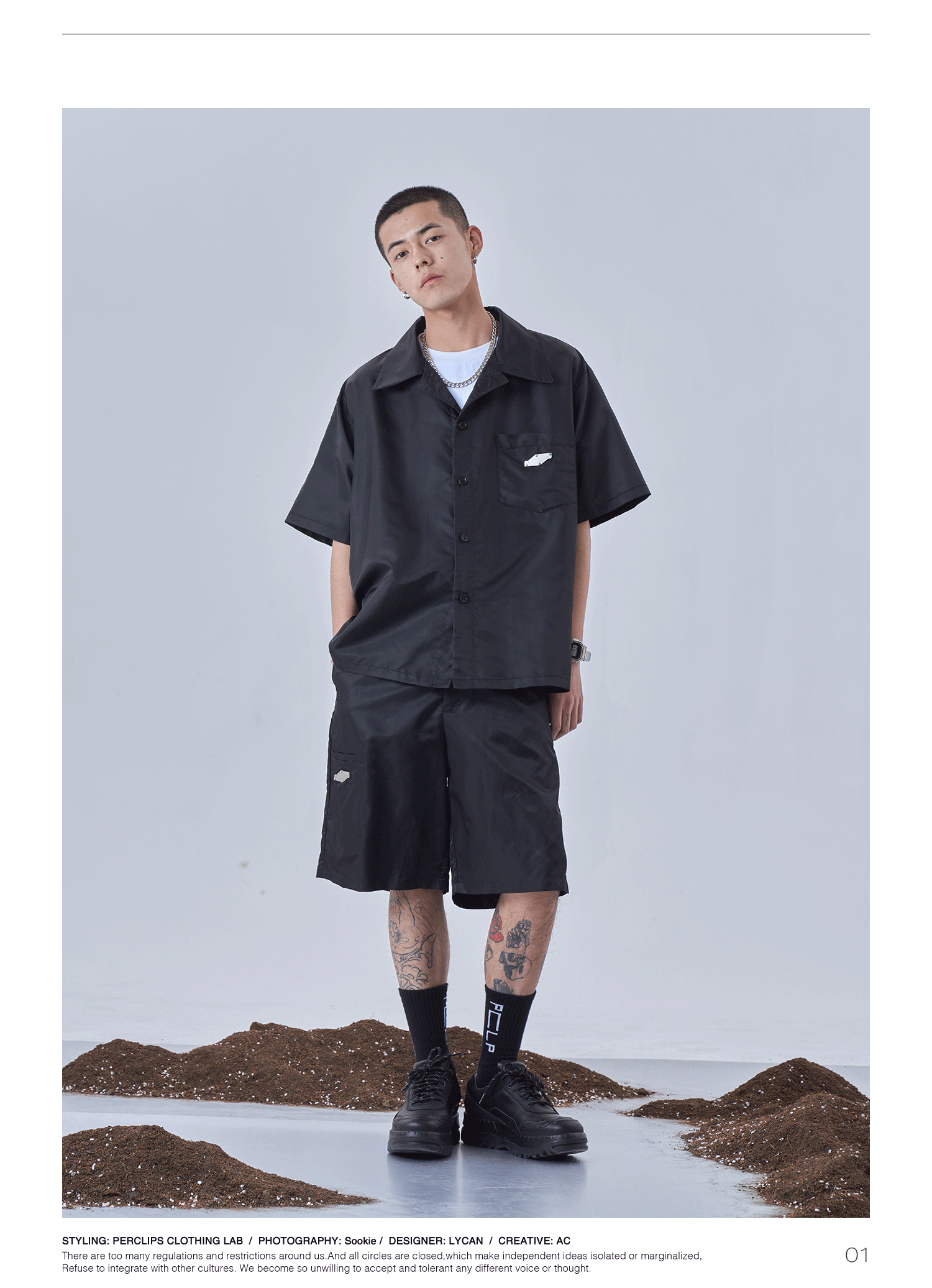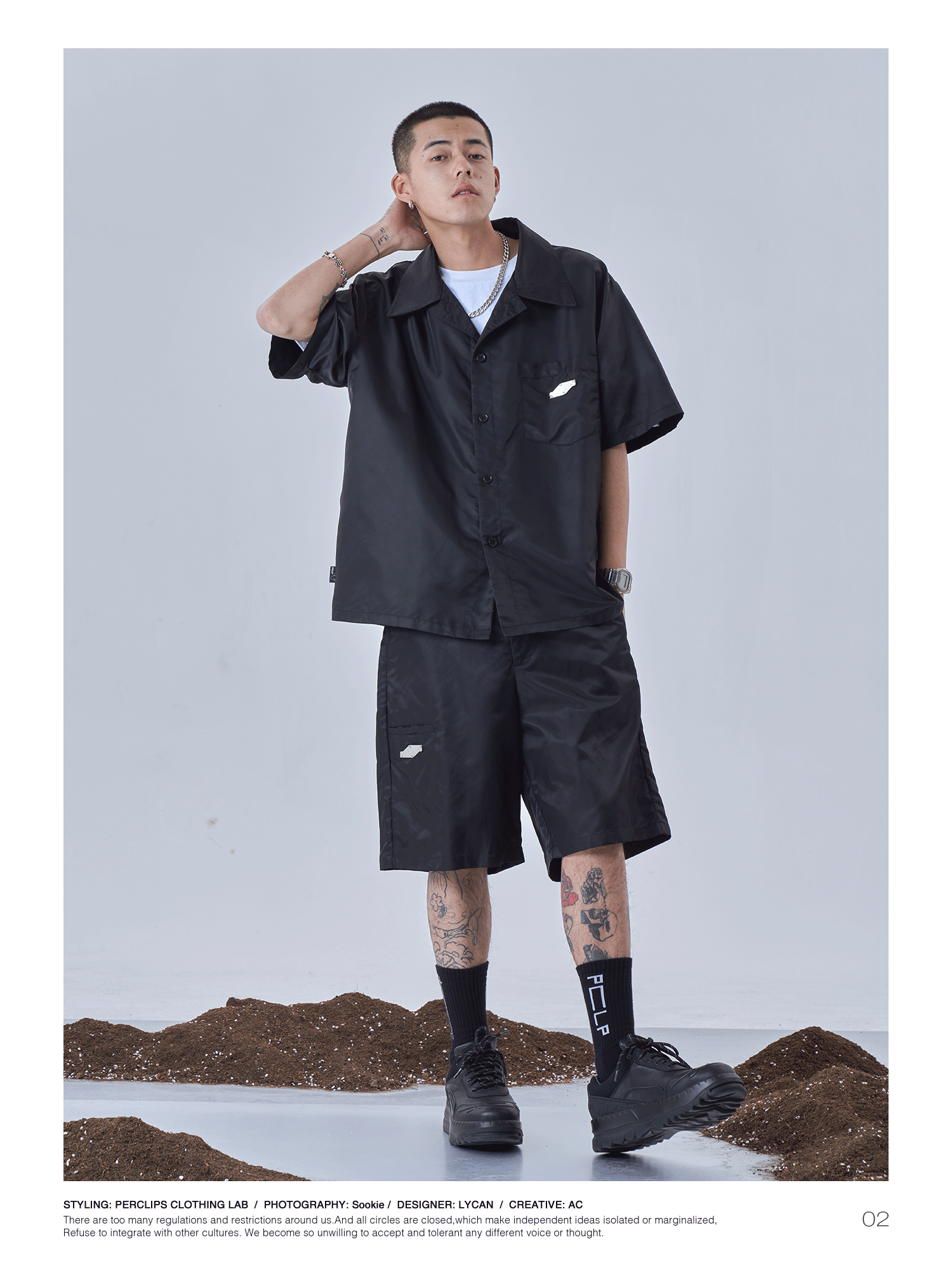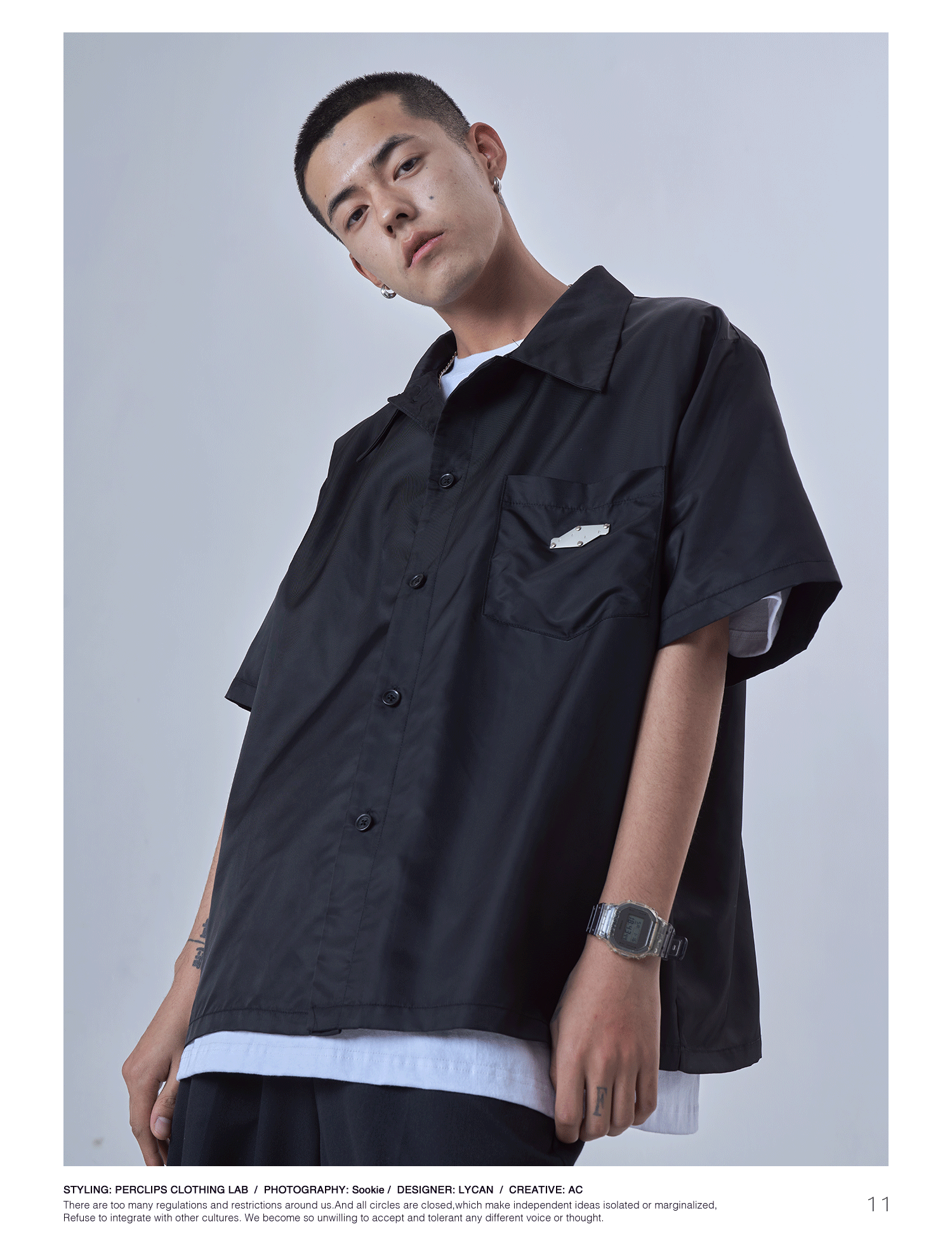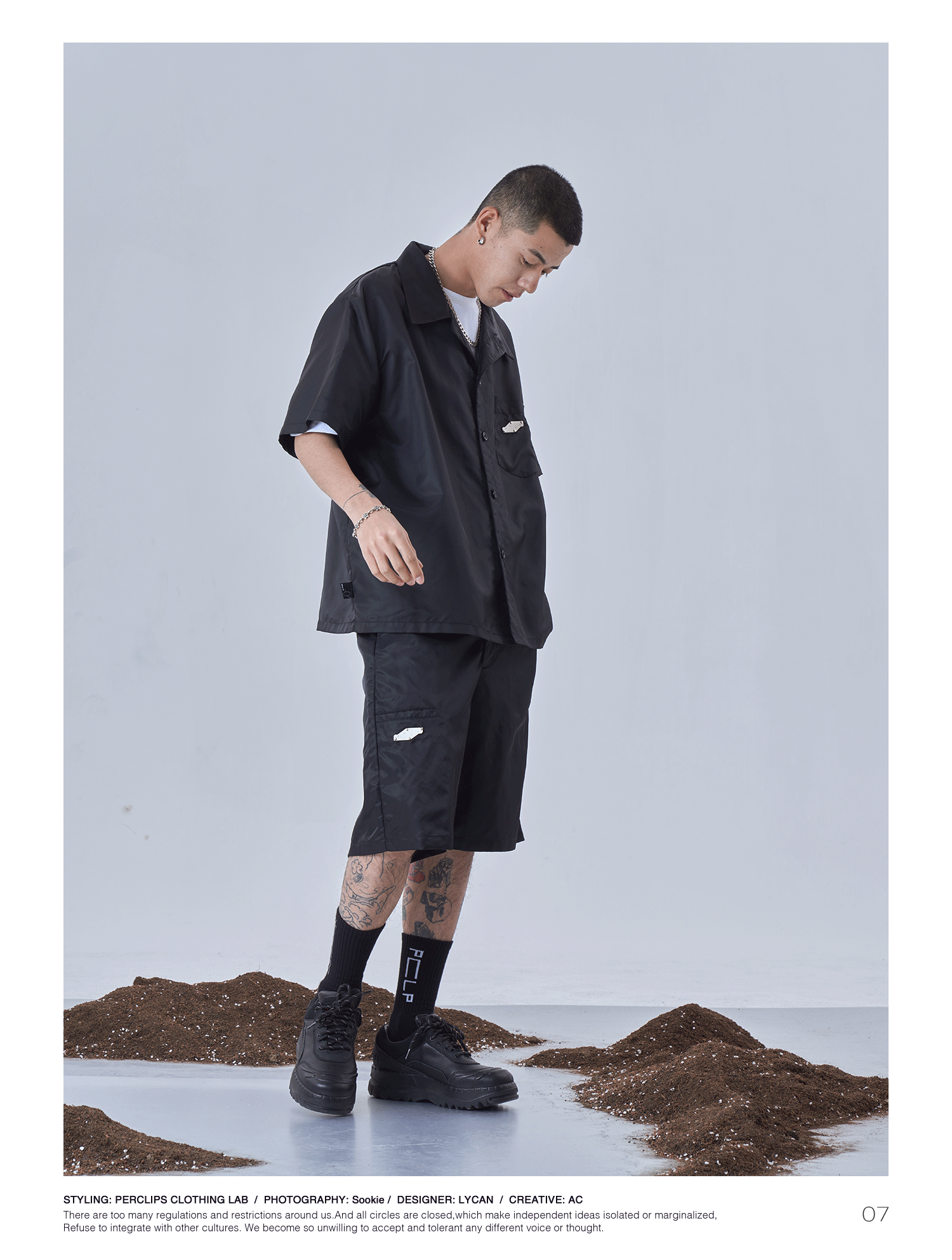 PCLP(PERCLIPS) 金属牌短袖衬衫 潮流解构工装日系港风男半袖衬衣
