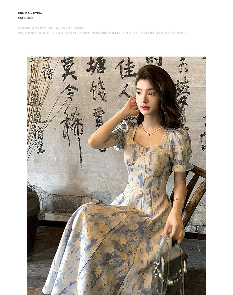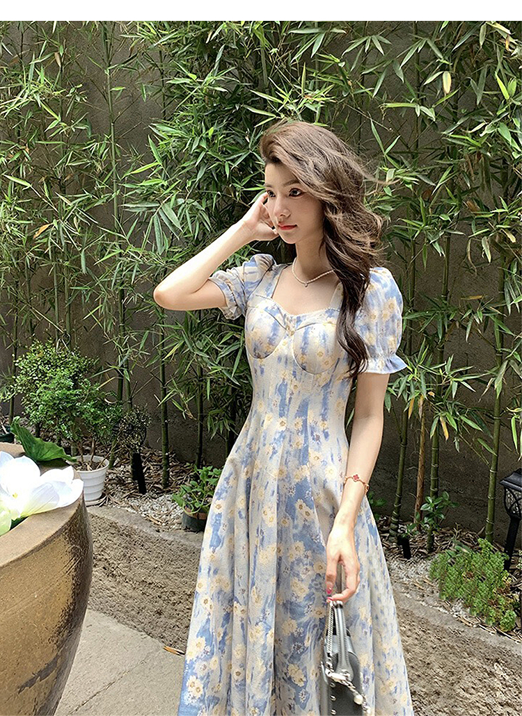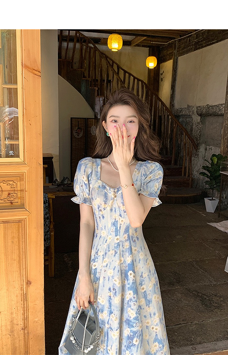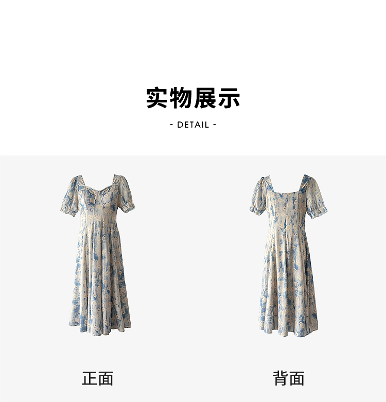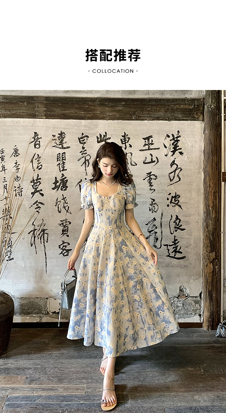 西遇法式碎花连衣裙女2025年夏季新款a字蓝色方领油画短袖长裙SS150346