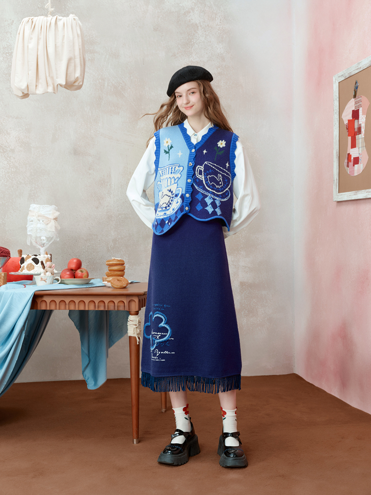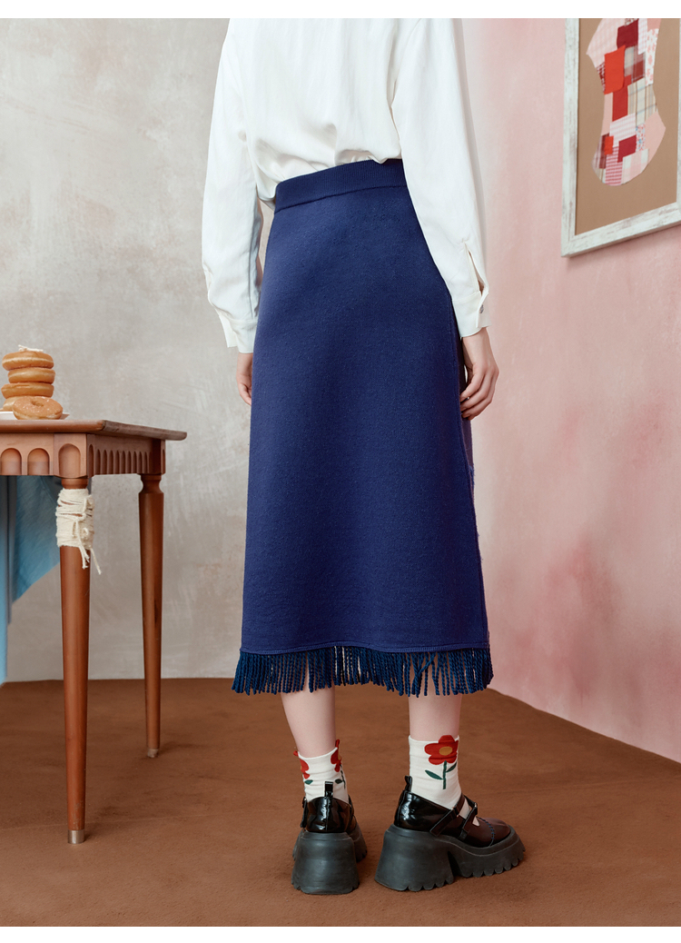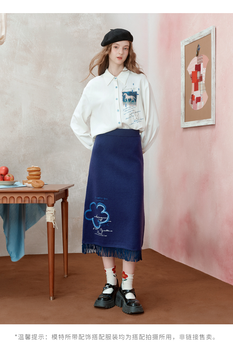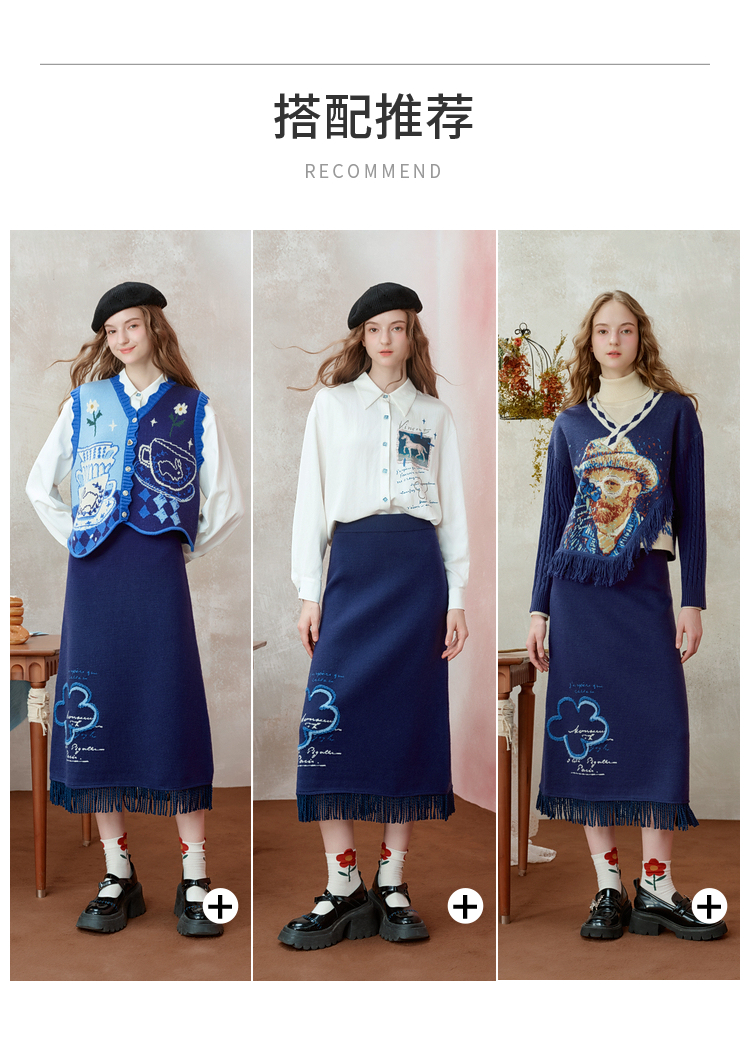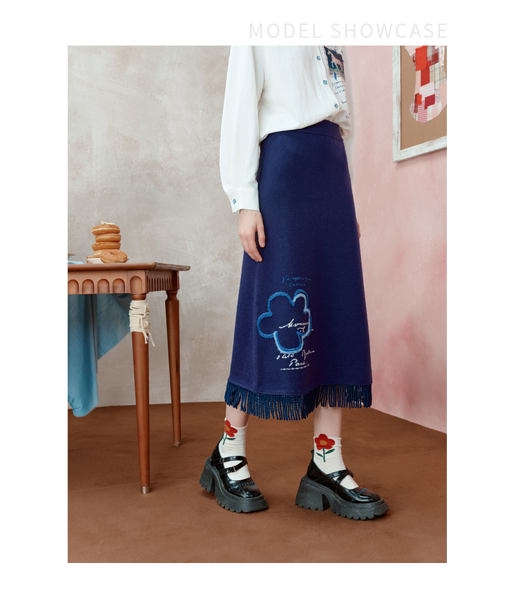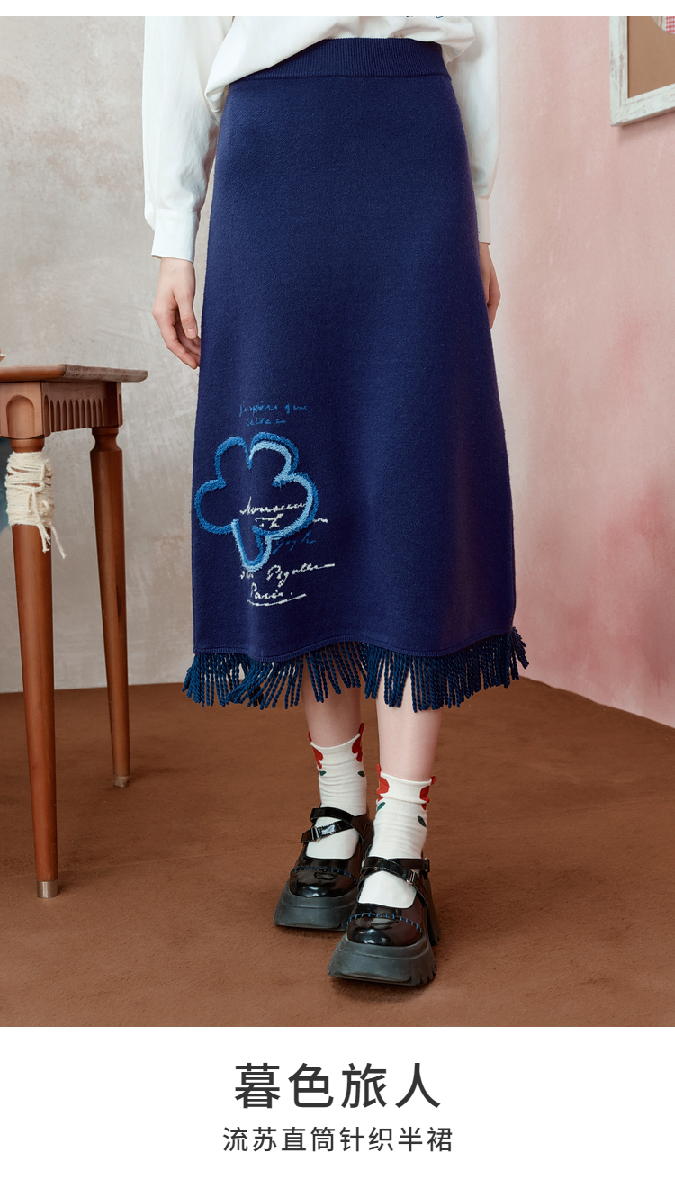 两三事梵高文艺暮色旅人2025冬新款花朵毛巾绣流苏直筒针织半身裙