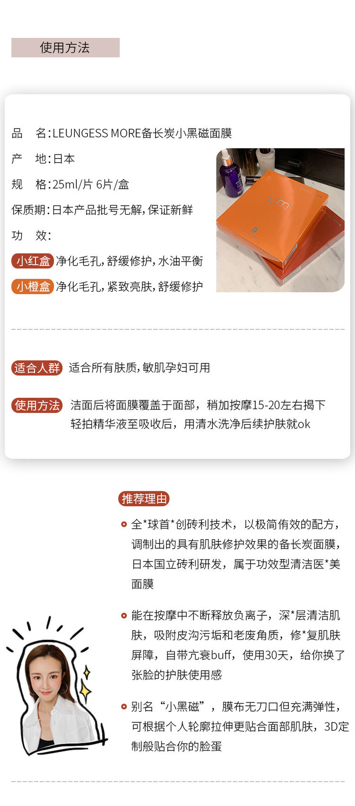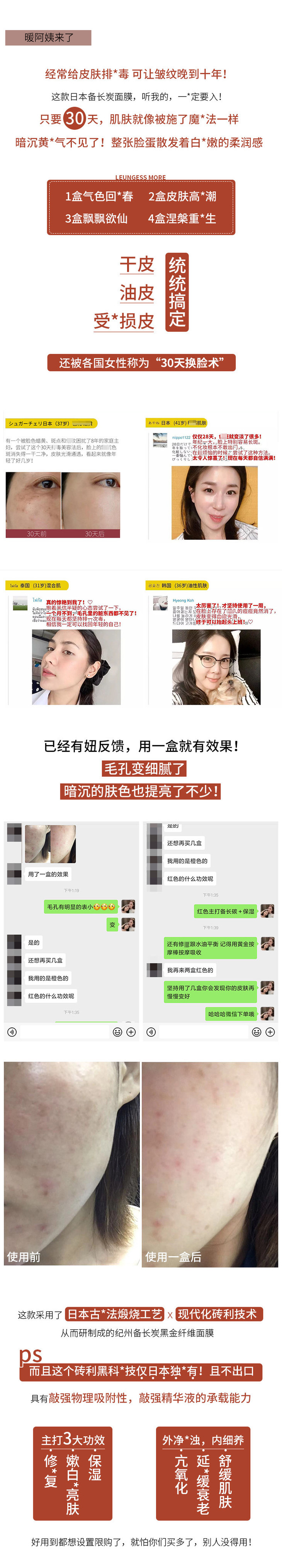 【负离子吸附 毛孔黑头敏感肌 修护提亮抗氧化】备长炭黑面膜 6片装 日本LEUNGESSMORE纪州