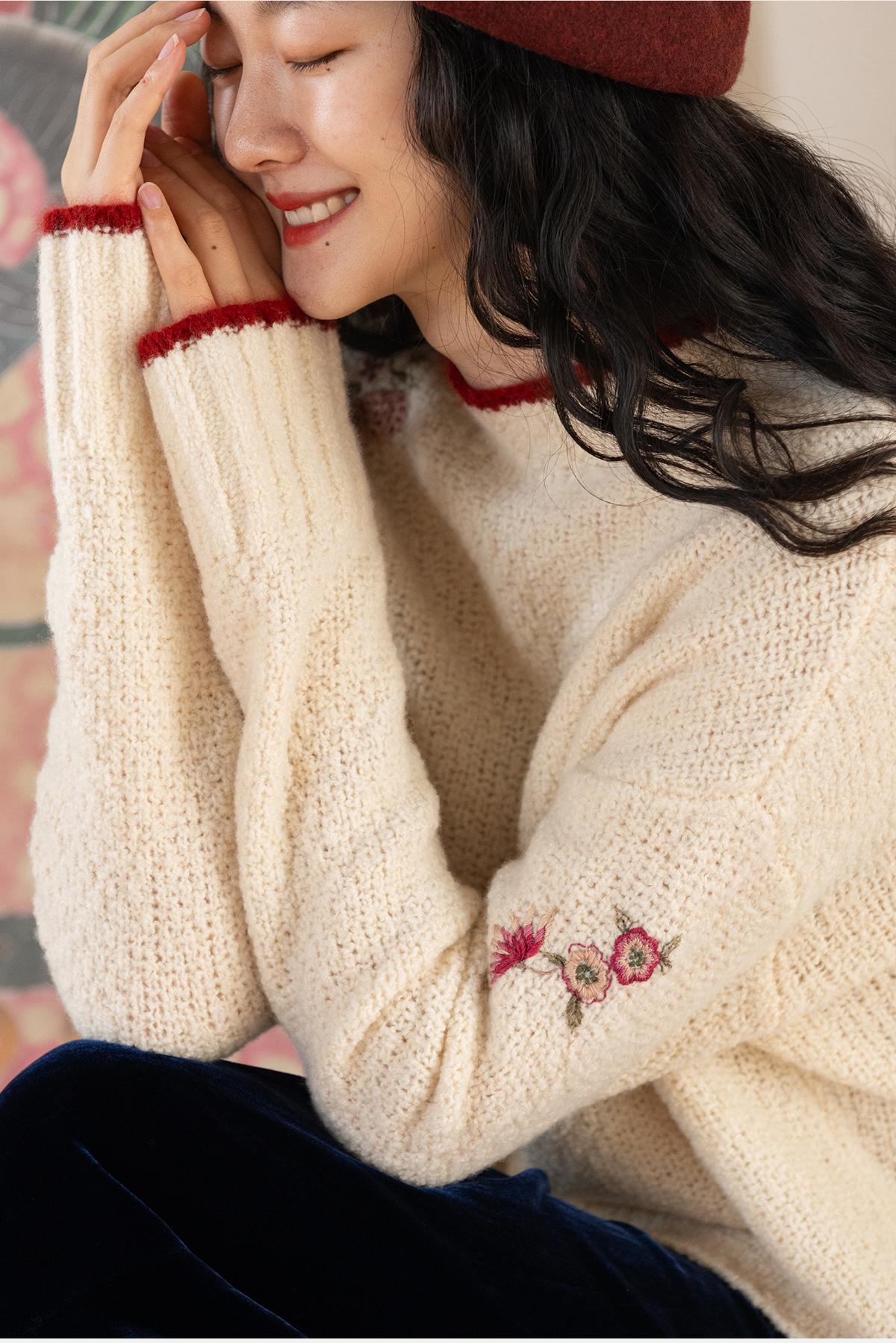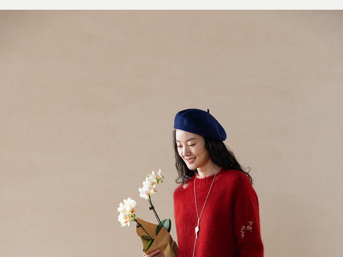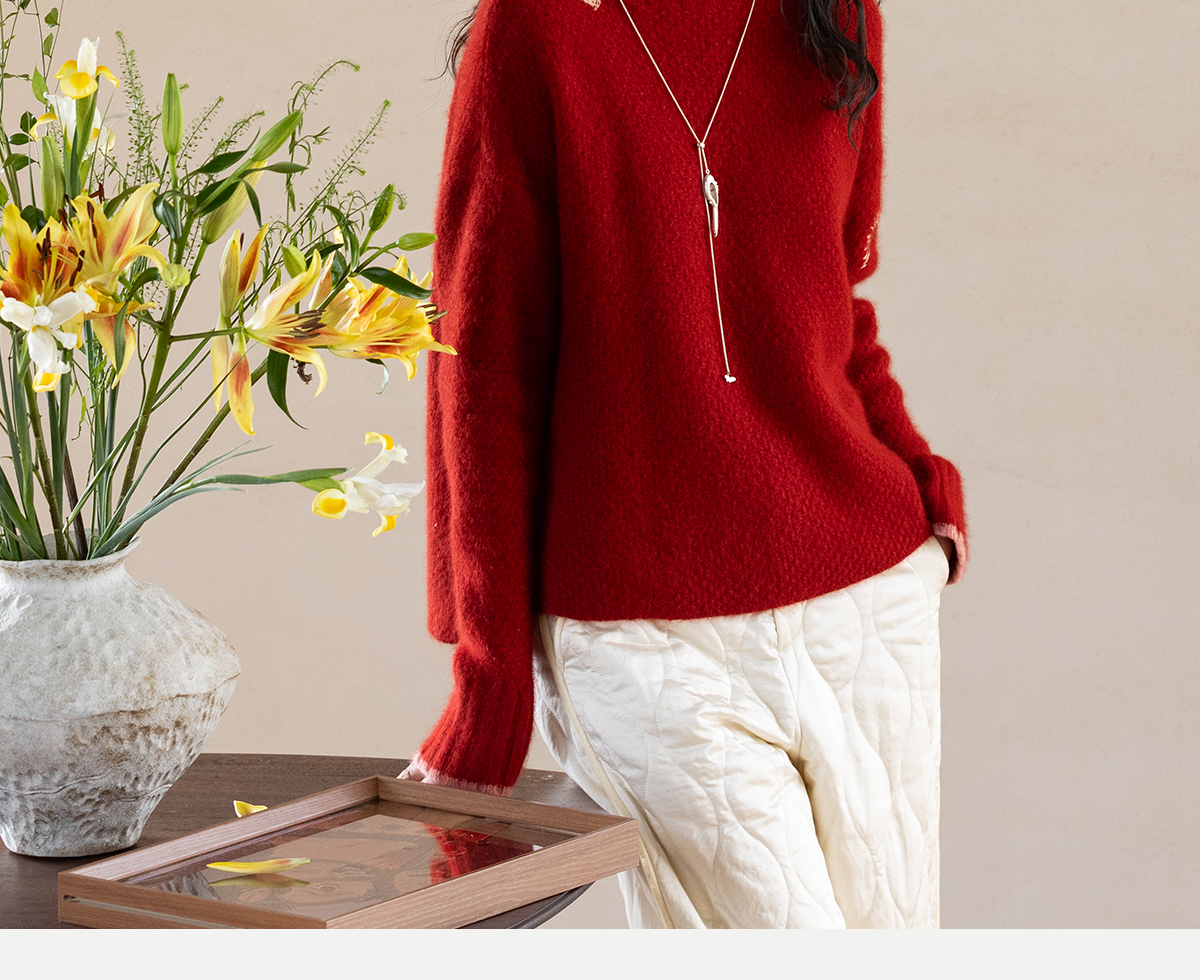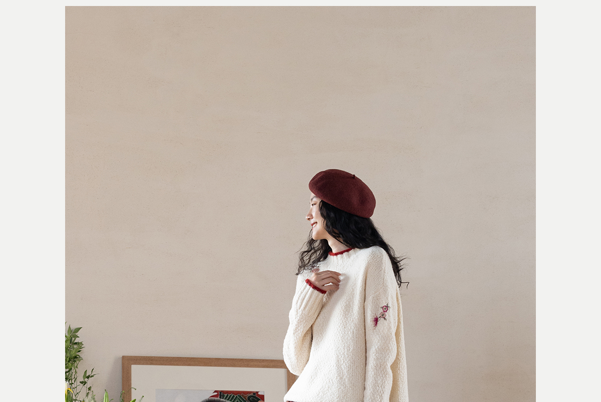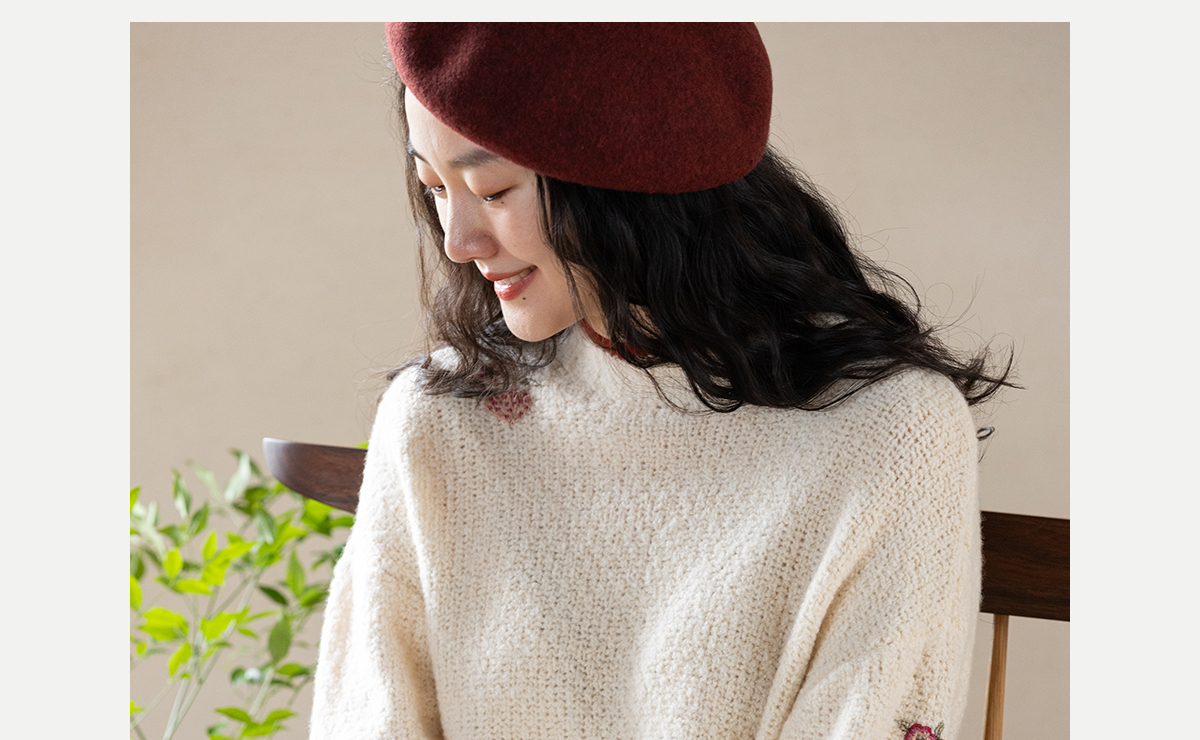 牧衣游原创 毛织手工刺绣毛织套头衫软糯保暖红色氛围毛衣女 暮冬