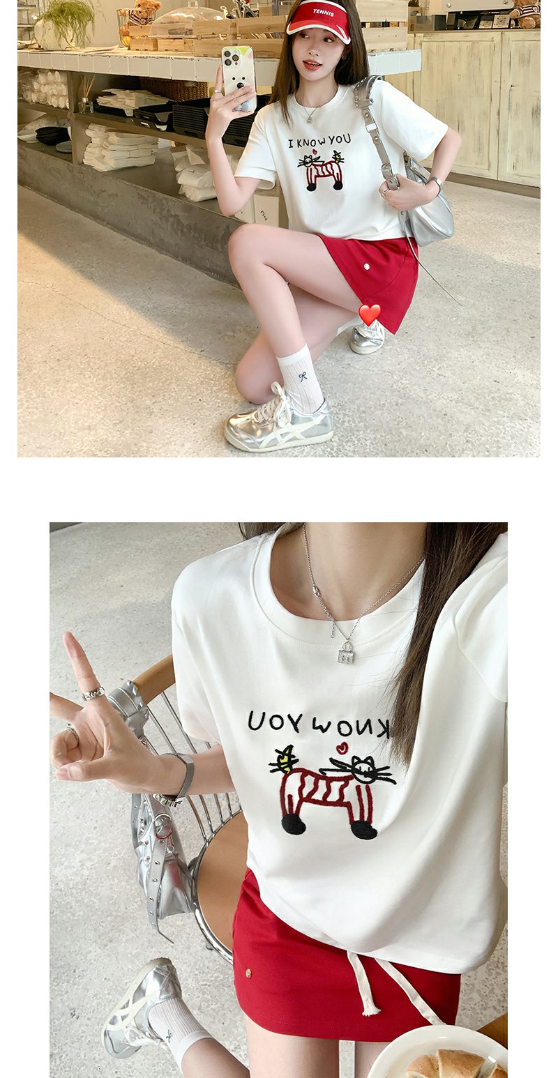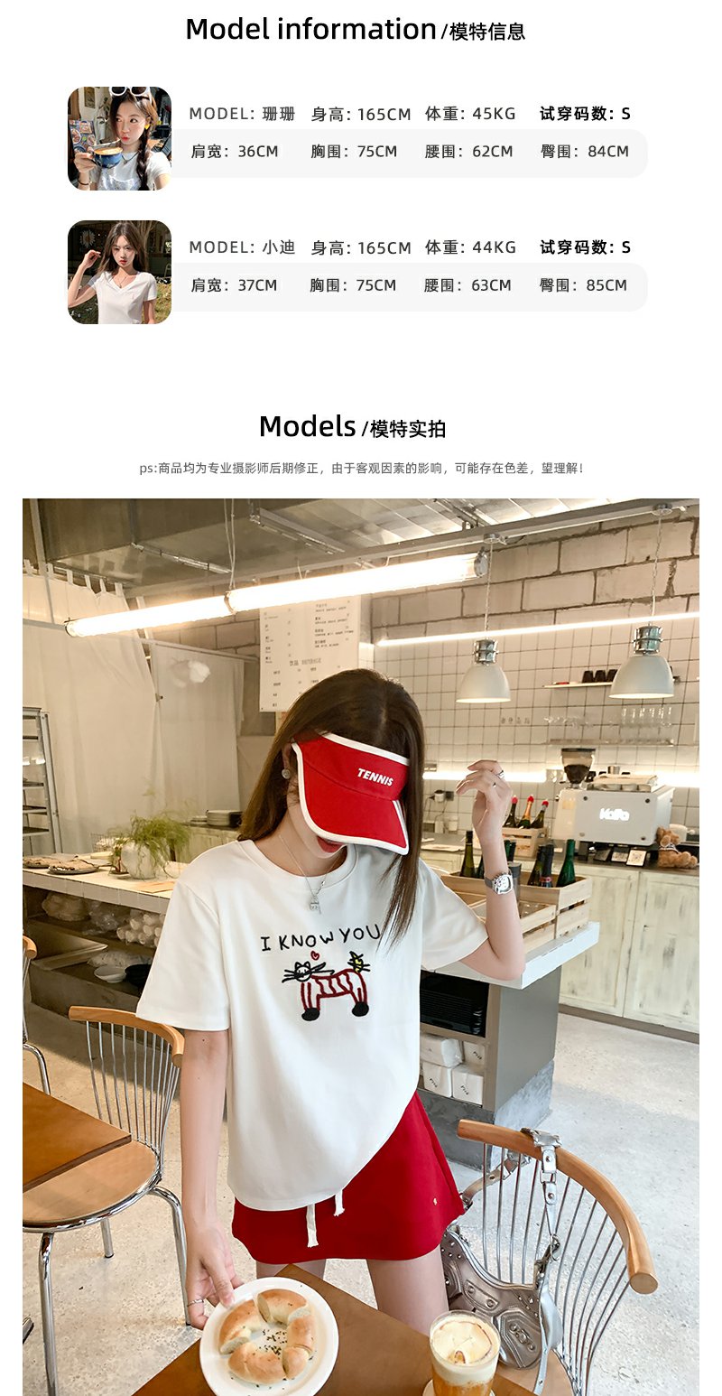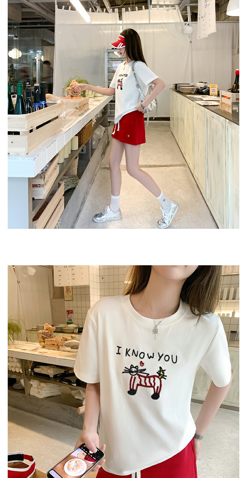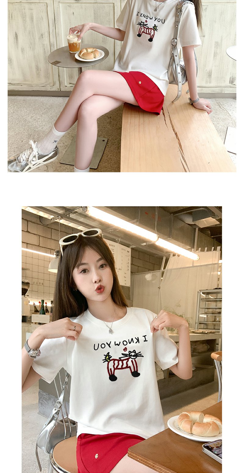 <曾小咸推荐>休闲百搭白色猫咪字母绣花短袖T恤