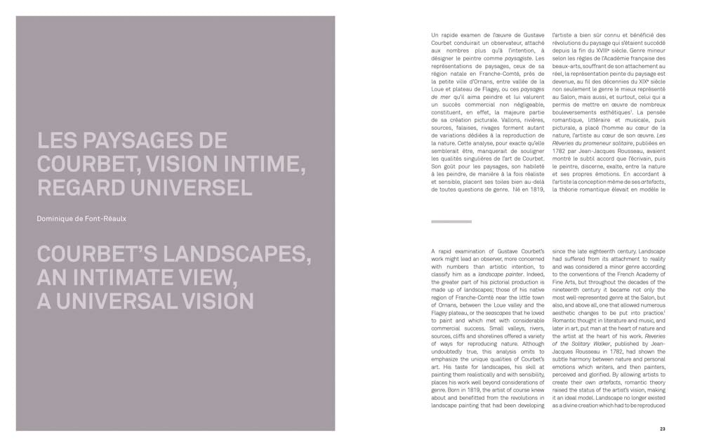 本书介绍了库尔贝的一系列重要作品,主要来源于古斯塔夫·库尔贝研究所和奥尔南博物馆的藏品,以及受其风格影响的其他19世纪画家的作品。该出版物还深入探讨了艺术评论家乔治·贝松(George Besson)和画家盖伊·巴顿(Guy Bardone)的重要贡献,两人都致力于通过收购库尔贝在奥南的出生地和保护他的艺术来保护库尔贝复杂的遗产。