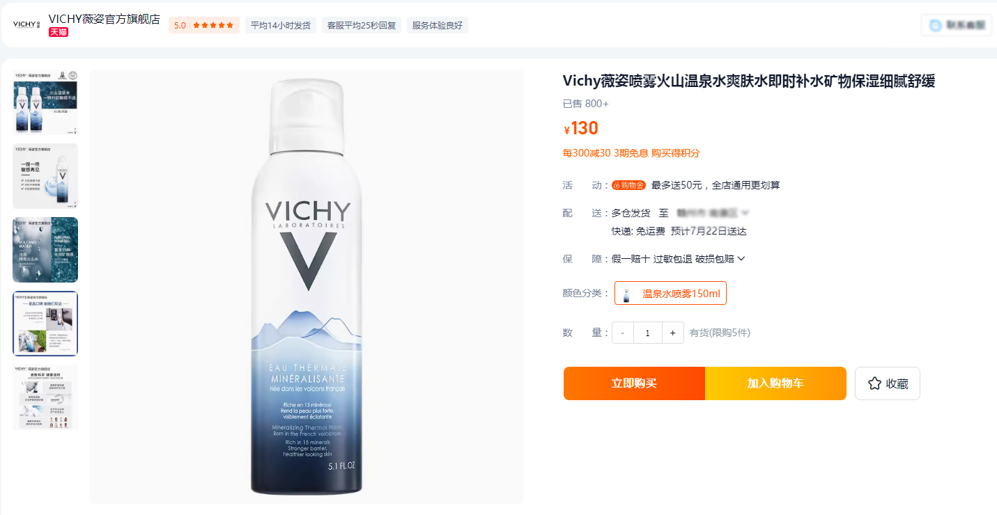 【品名】Vichy薇姿喷雾火山温泉水爽肤水即时补水矿物保湿细腻舒缓150ml