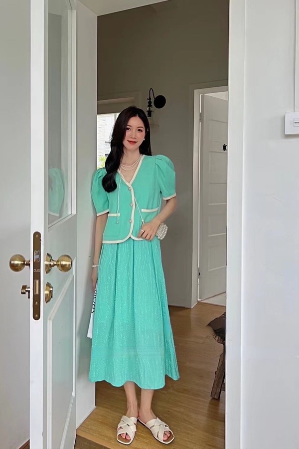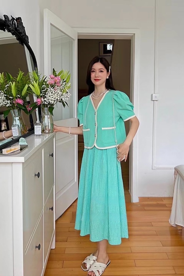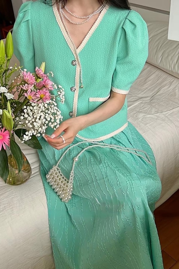 ANSUABEL 气质短款外套V领纱裙套装 14128
