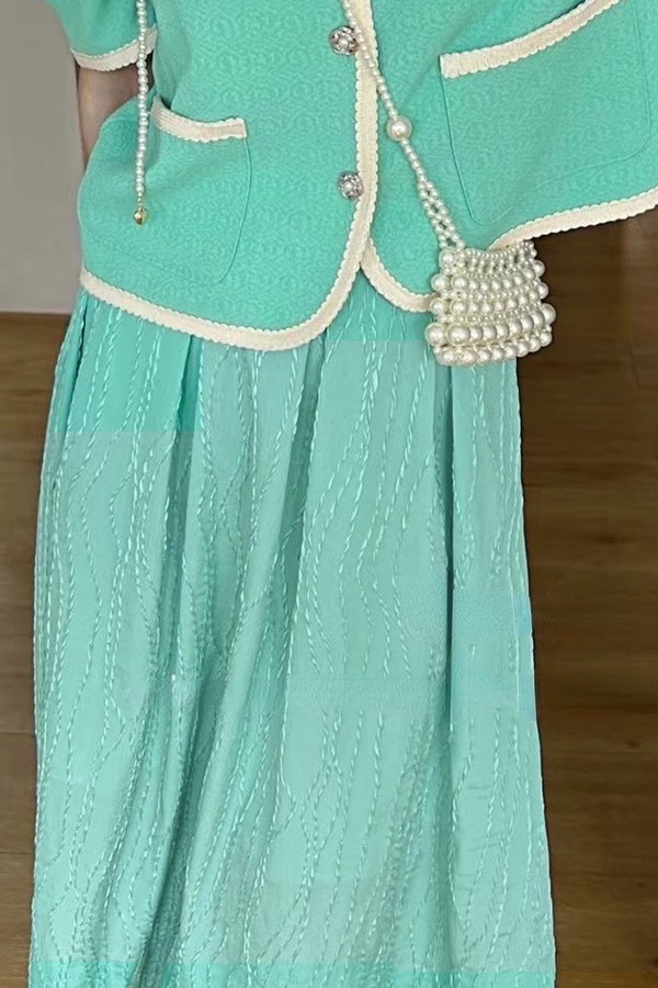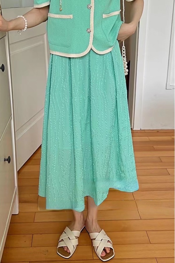 Le Malene 时髦复古浅绿色肌理感高腰百褶半裙 16175
