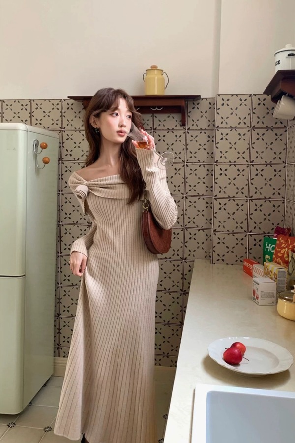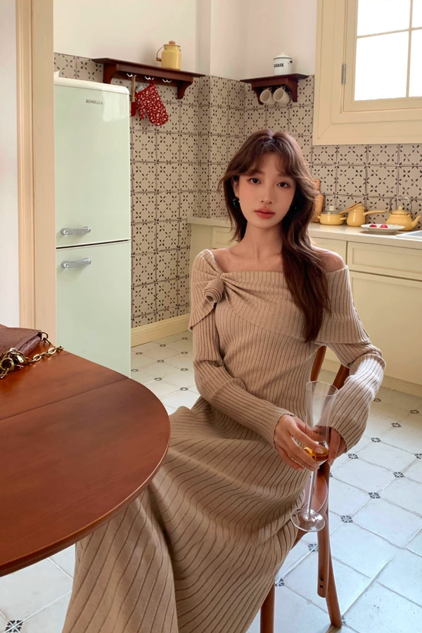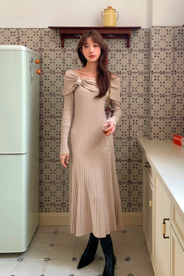 SIA SAYLOR 气质修身玫瑰花一字肩针织连衣裙 21792