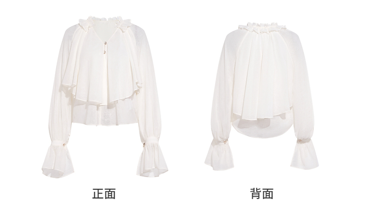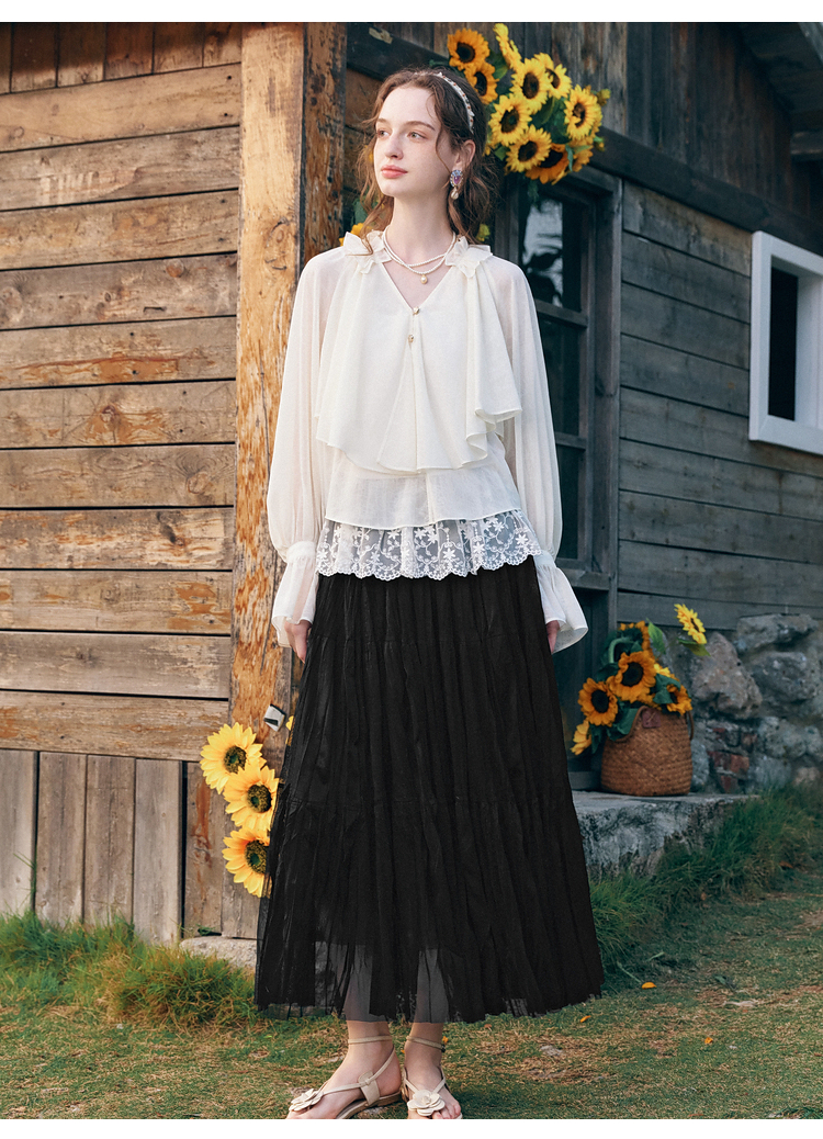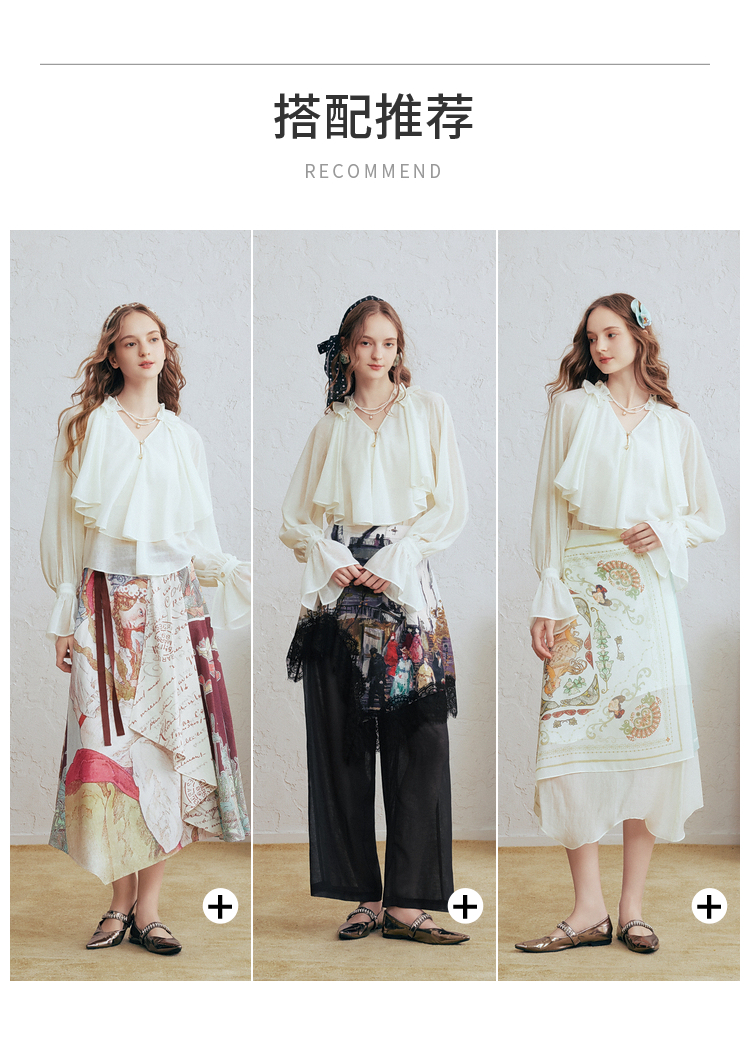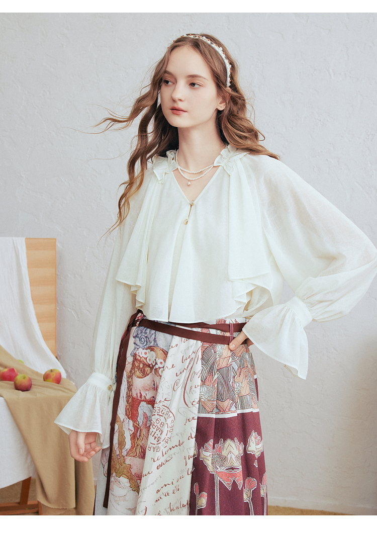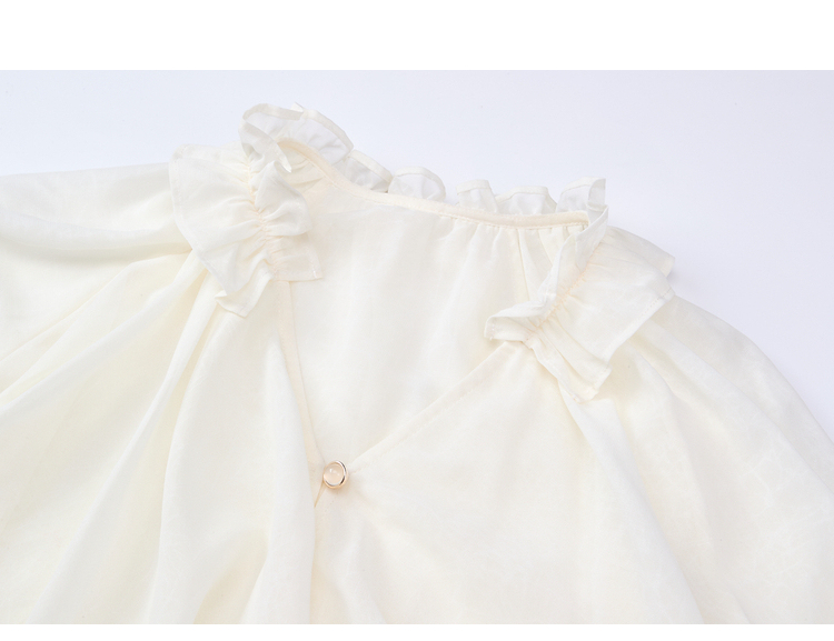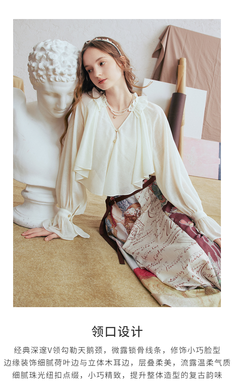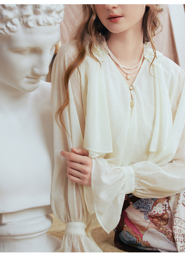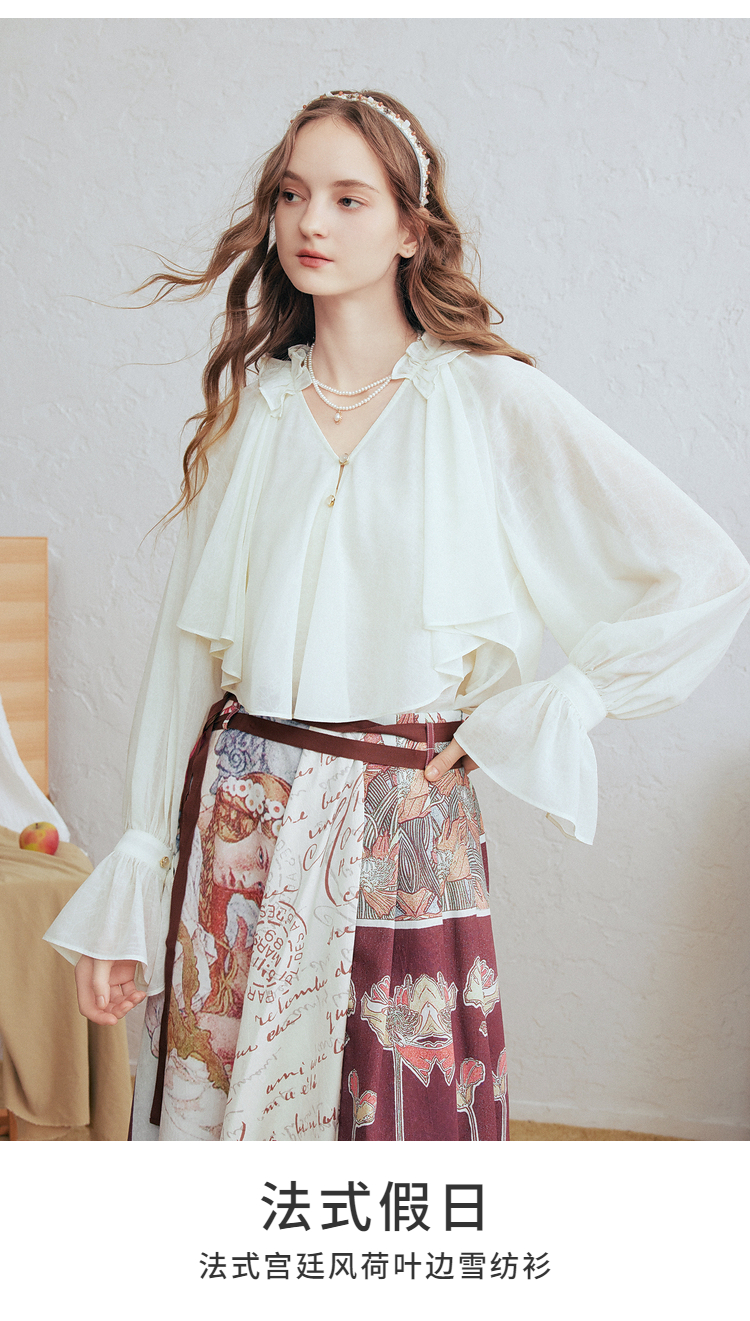 两三事 法式假日 2026春季新款优雅荷叶边v领拼布灯笼袖雪纺衫女