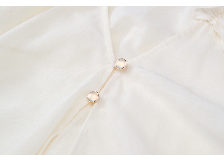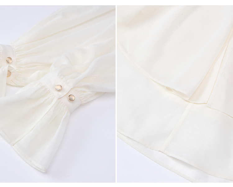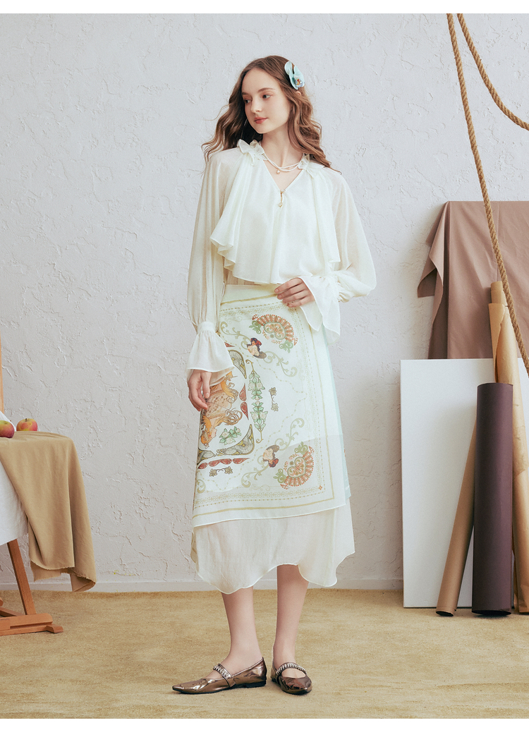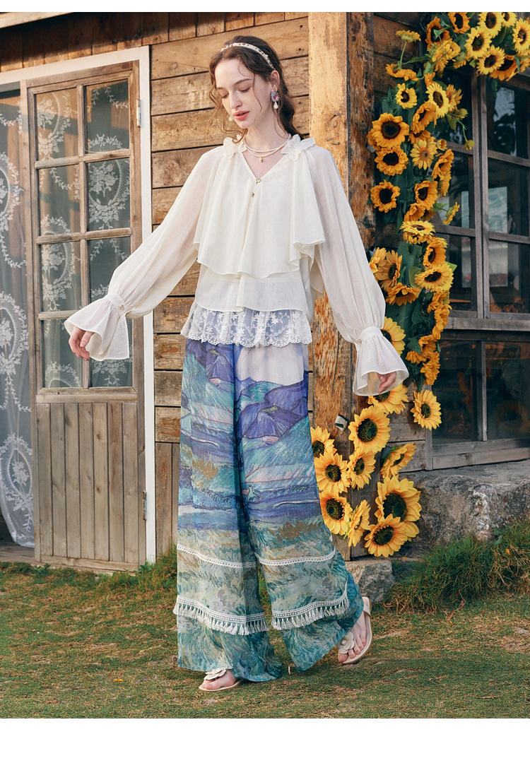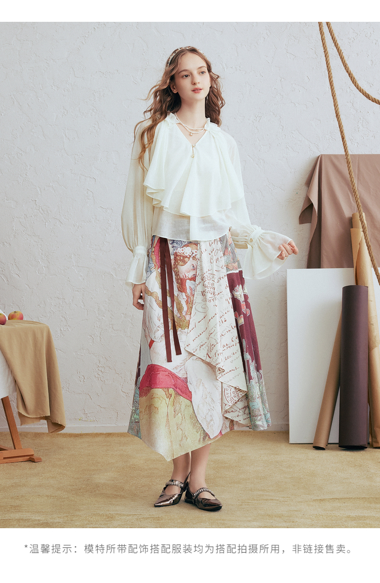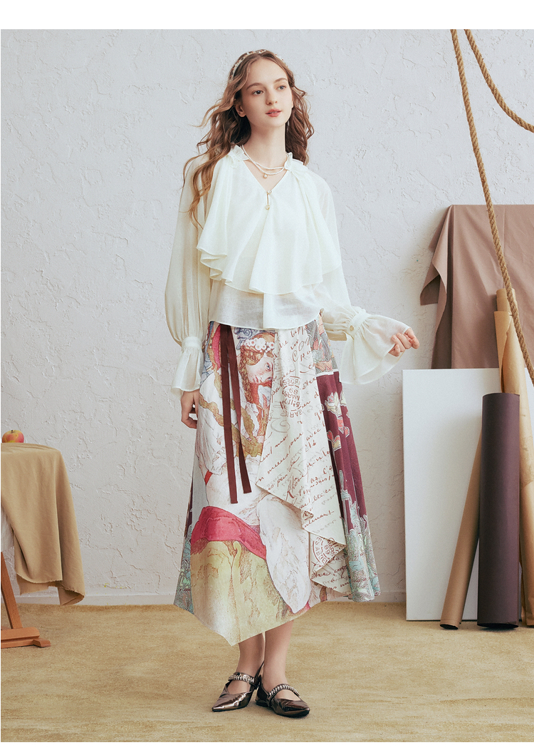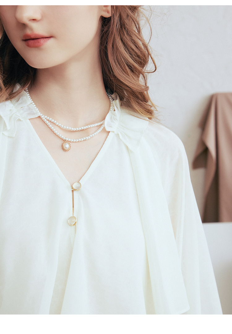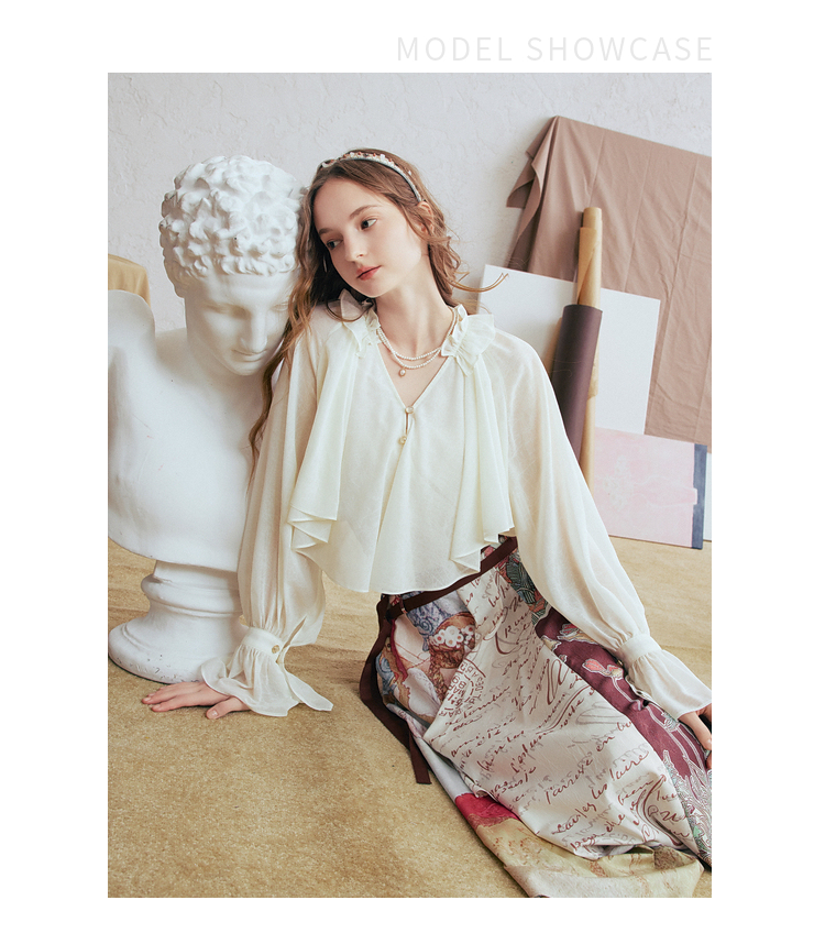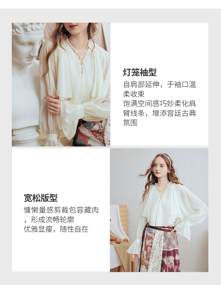 两三事 法式假日 2026春季新款优雅荷叶边v领拼布灯笼袖雪纺衫女