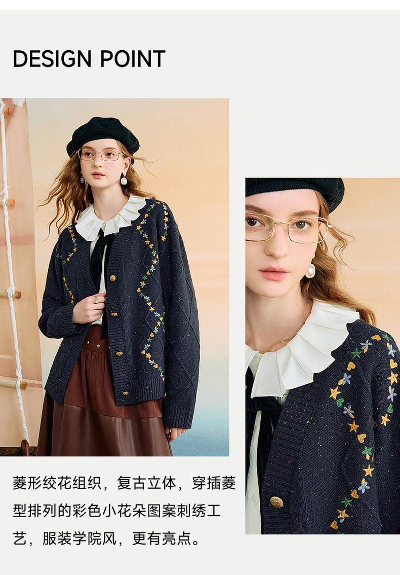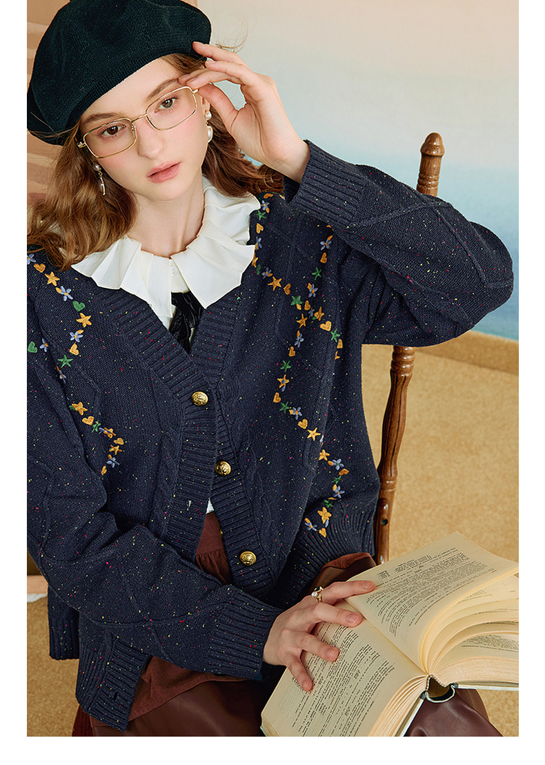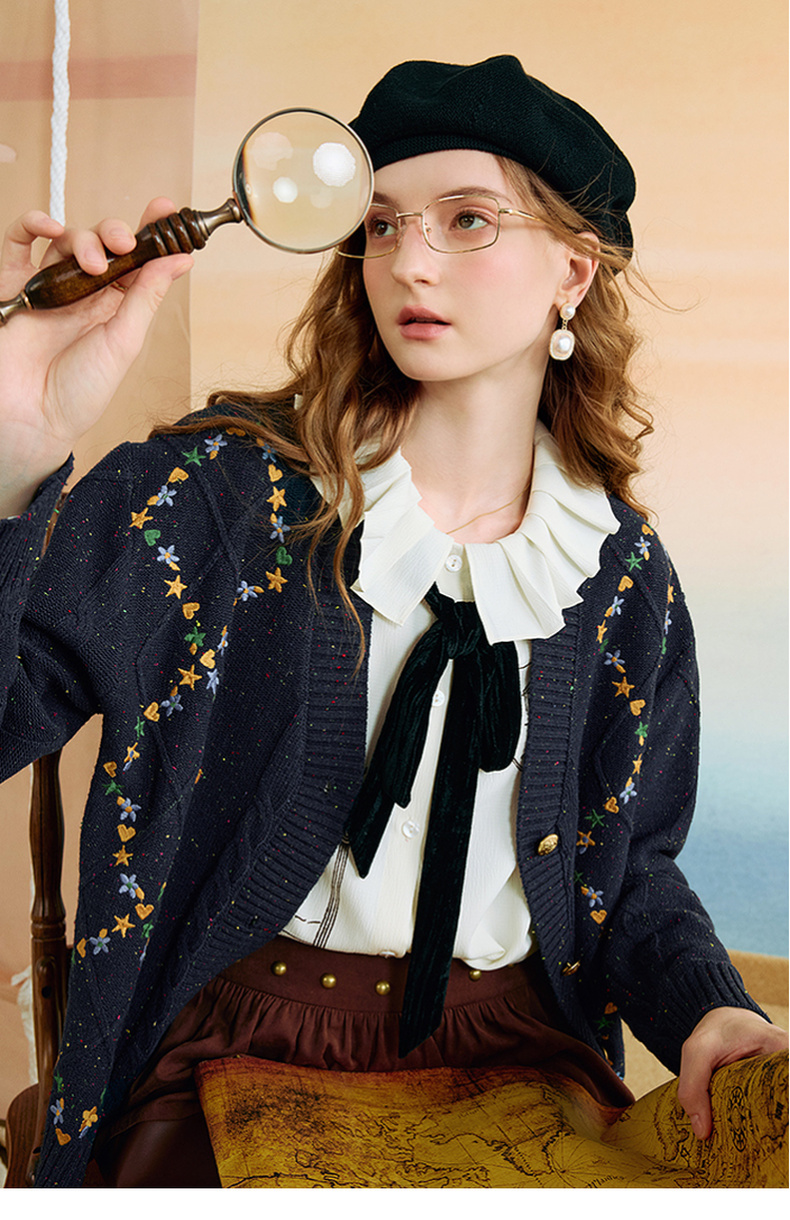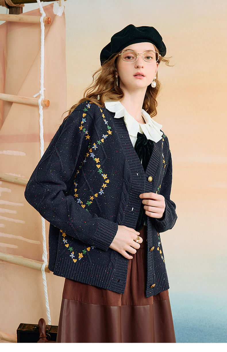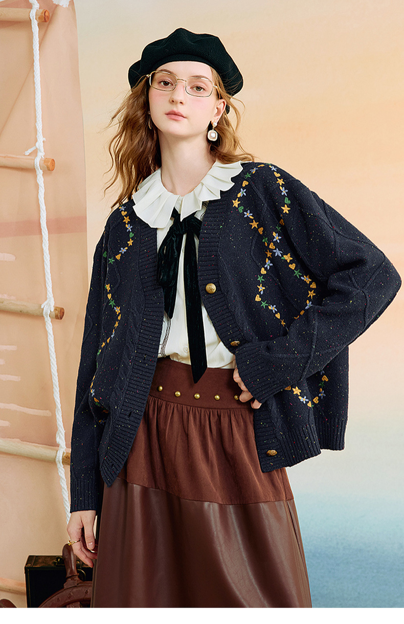 两三事 星屑罗裳 2025秋季新款复古刺绣毛衣开衫女宽松