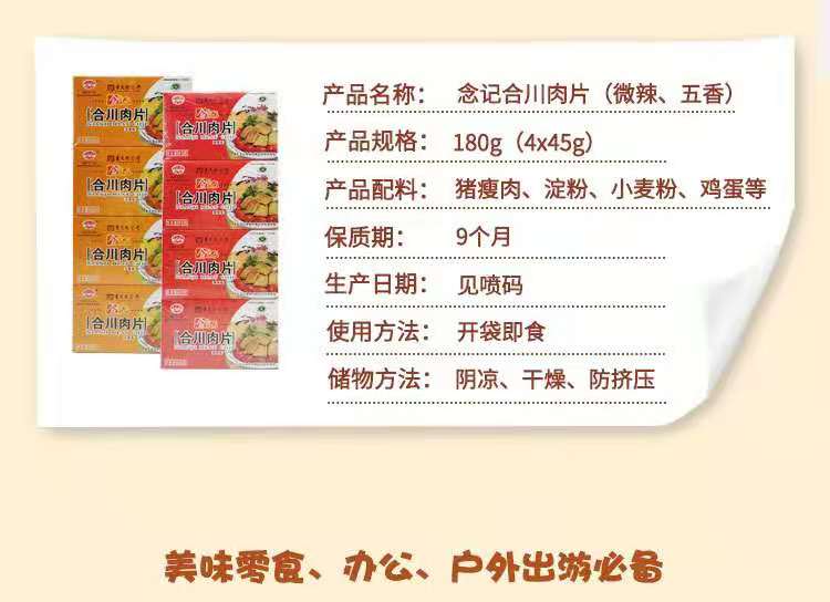 重庆老字号 念记合川肉片45g×4盒 薄且晶莹 色泽金黄 取自重庆合川当地猪肉 微辣/五香