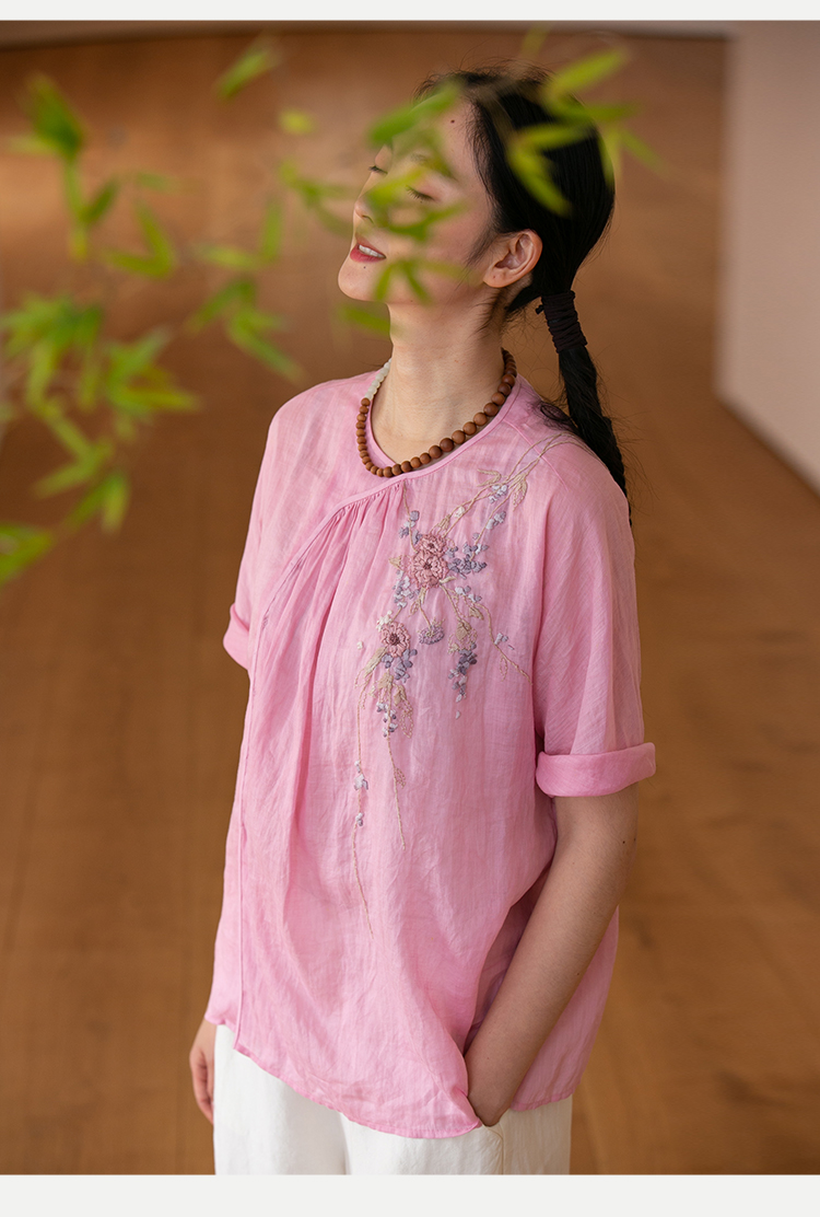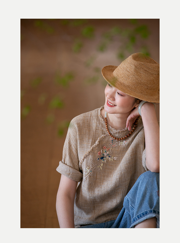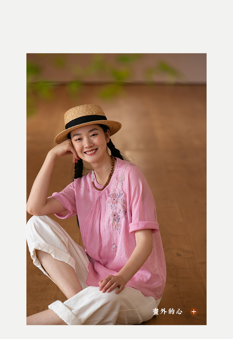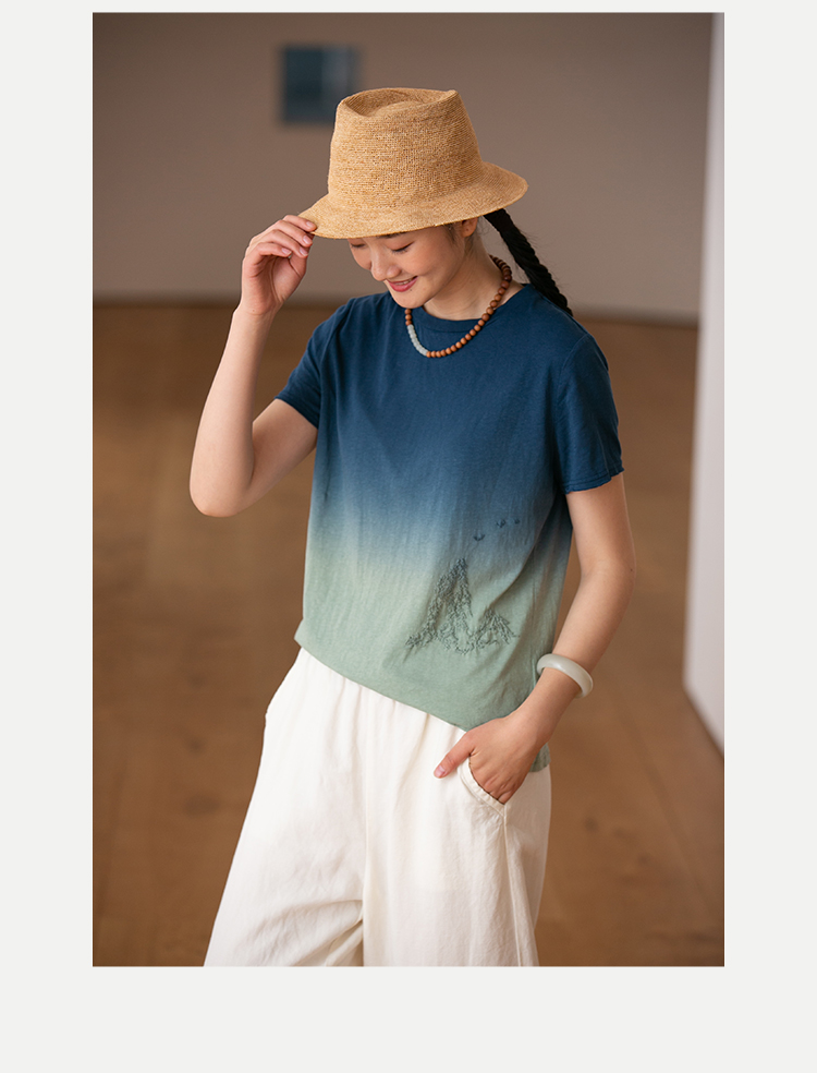 牧衣游原创20支手工刺绣棉质T恤宽松圆领纯色简约百搭短袖 迎春乐