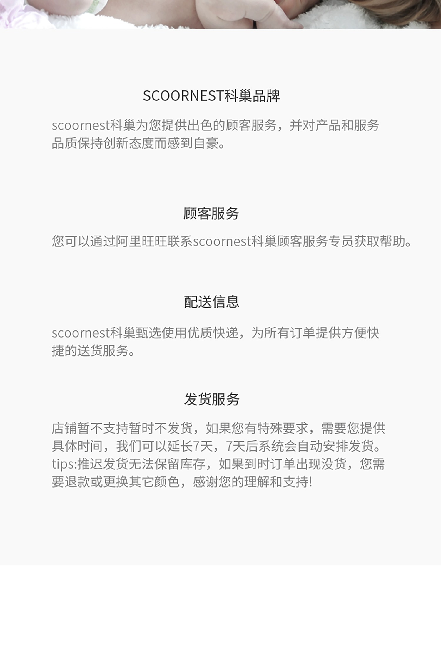 - Scoornest始终秉承给每一位宝宝送去科学的、关心的、创新的成长体验,通过提供商品和服务,使顾客形成守护、发展、巩固这种弥足珍贵的亲情的爱。