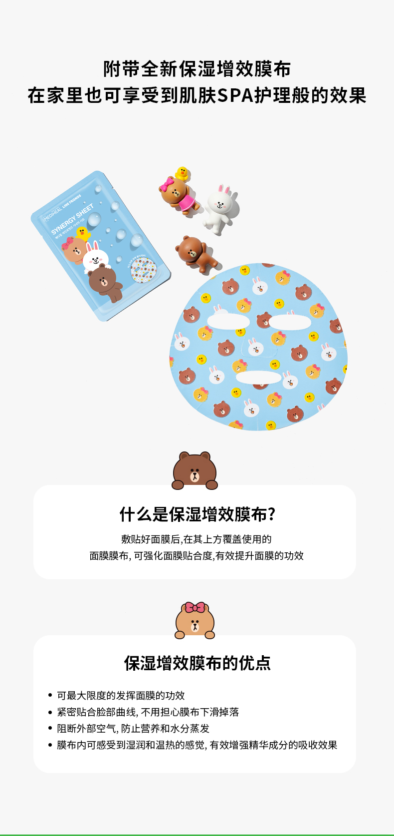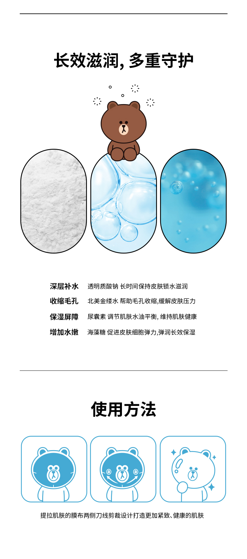 贴好正常的面膜后再覆盖上一层有可爱印花的保湿增效膜布!