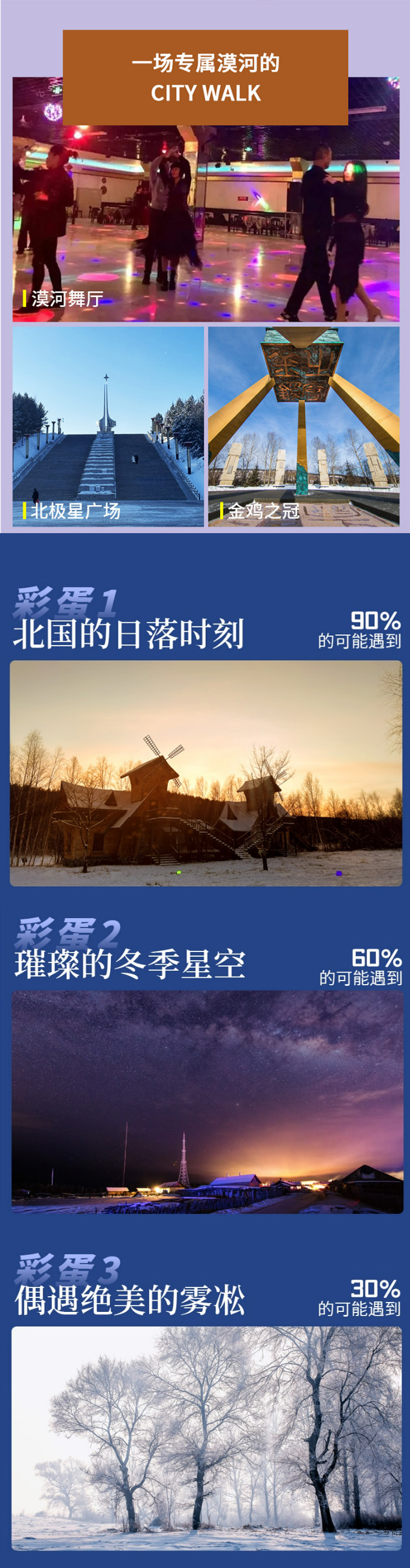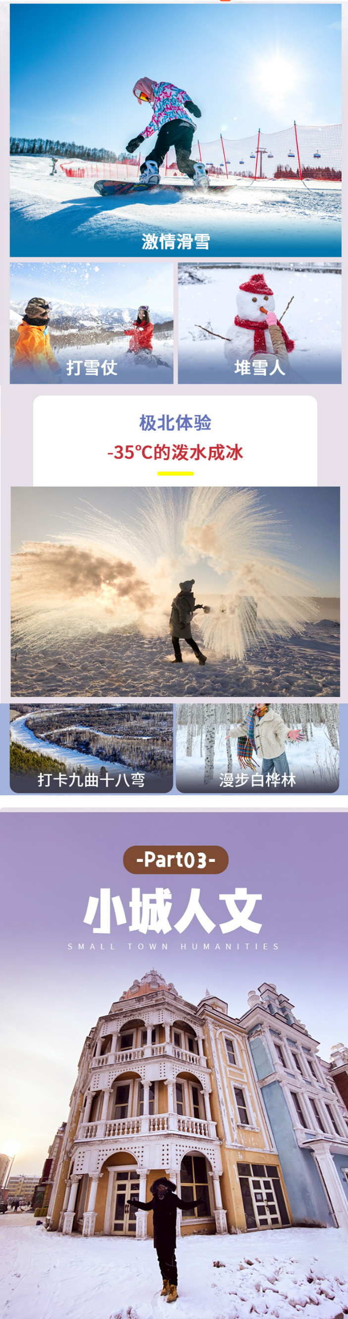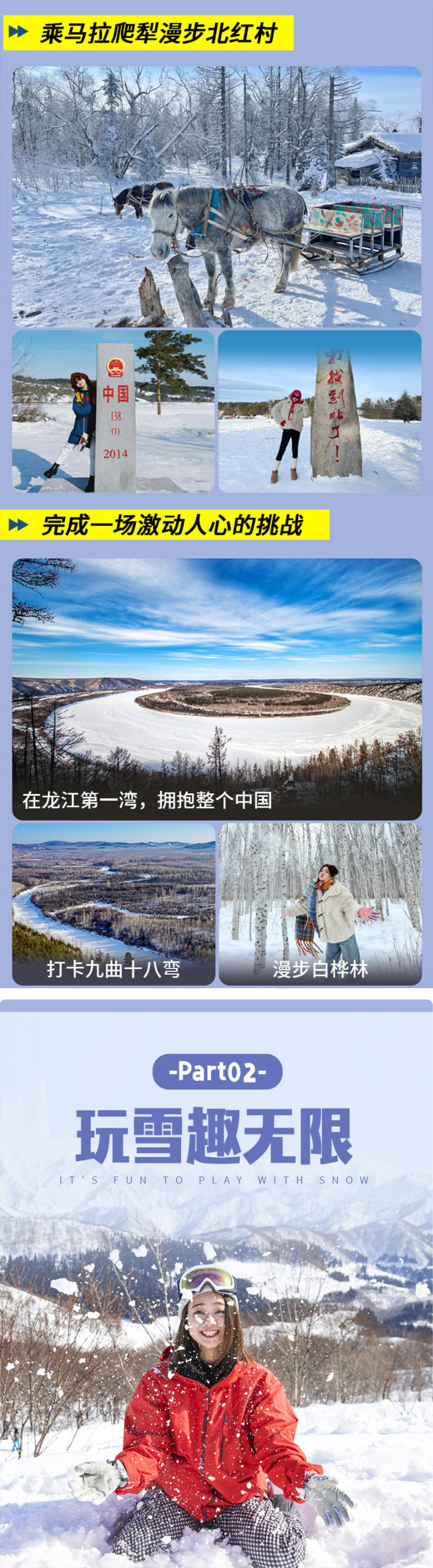 (2)哈尔滨的冰雪旅游旺季,为了防止堵车情况,可能会提前出发时间,打包酒店早餐在车上吃。如遇下大雪,车辆行驶会比平时缓慢,为了让大家不在路上浪费时间,尽量将时间用在玩上,大雪天气也可能会提前出发,建议自备高热量零食。