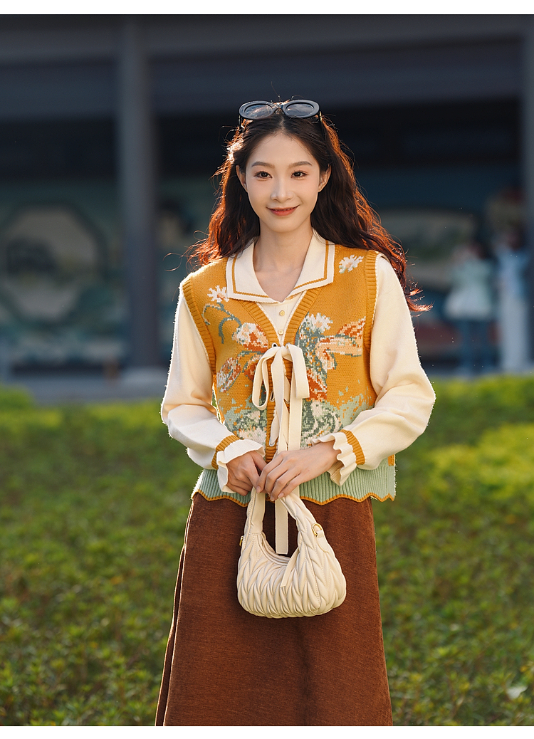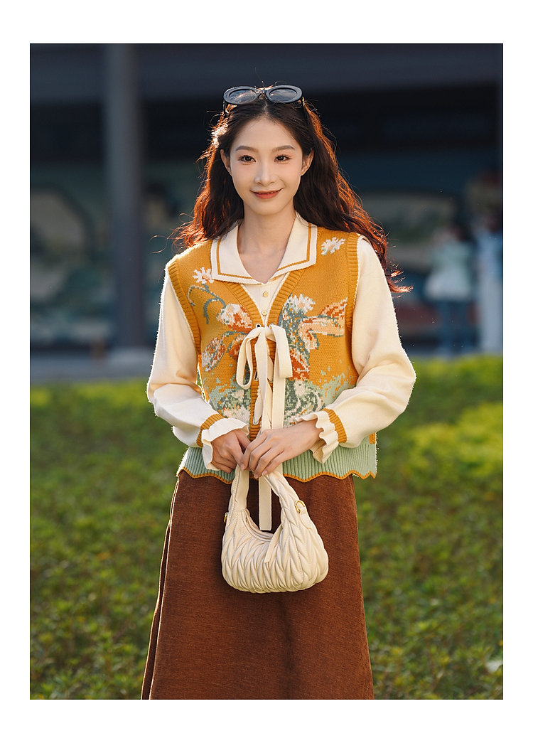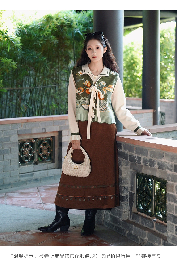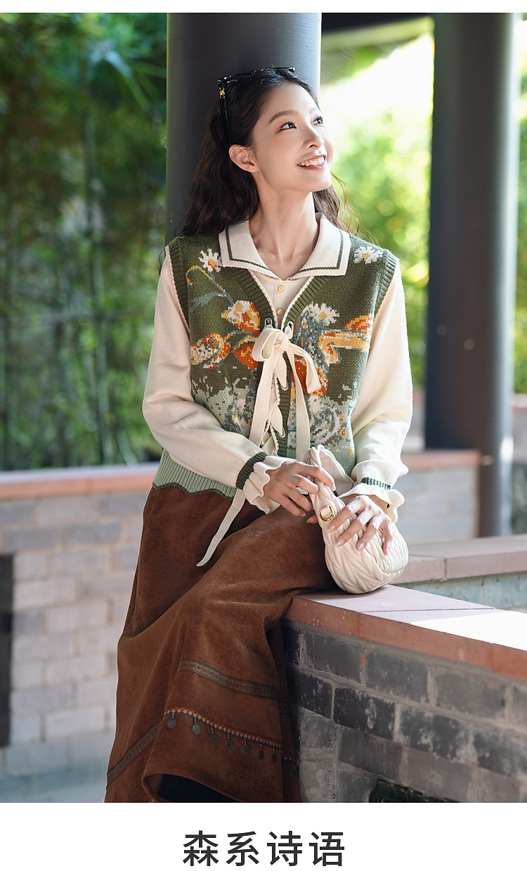 两三事 森系诗语 2025冬季新款复古绑带花色马夹假两件毛衣女宽松
