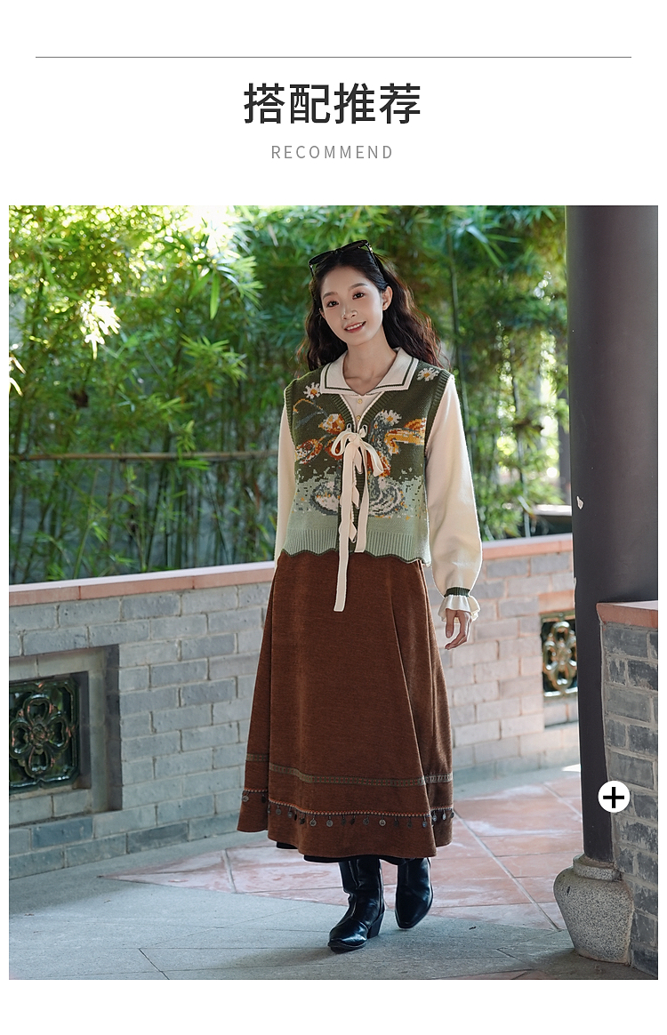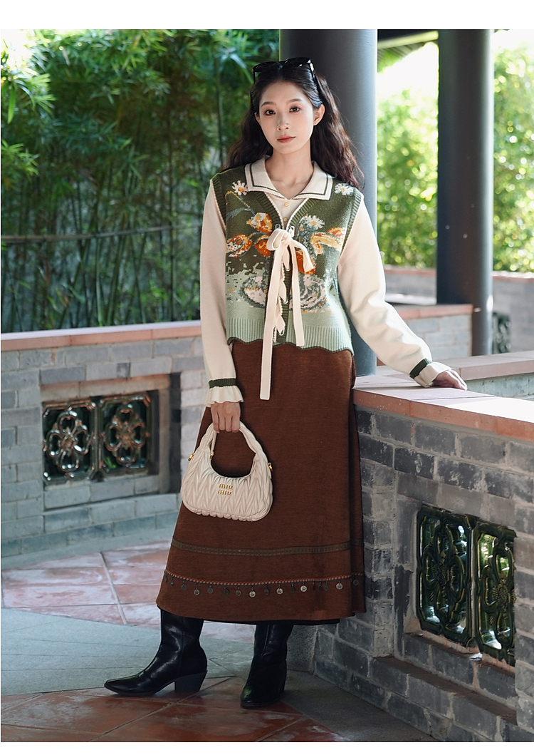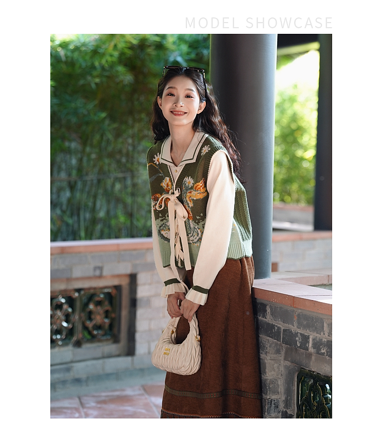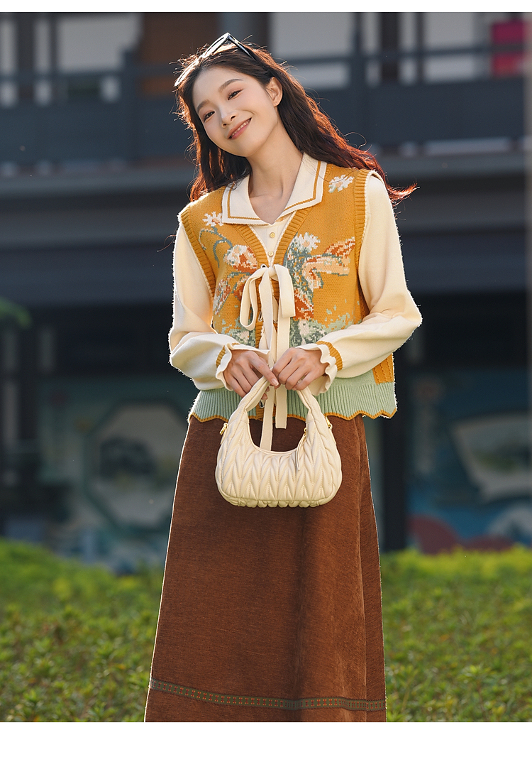 两三事 森系诗语 2025冬季新款复古绑带花色马夹假两件毛衣女宽松