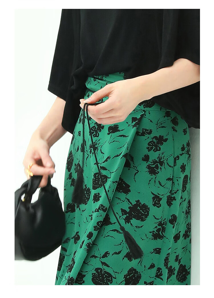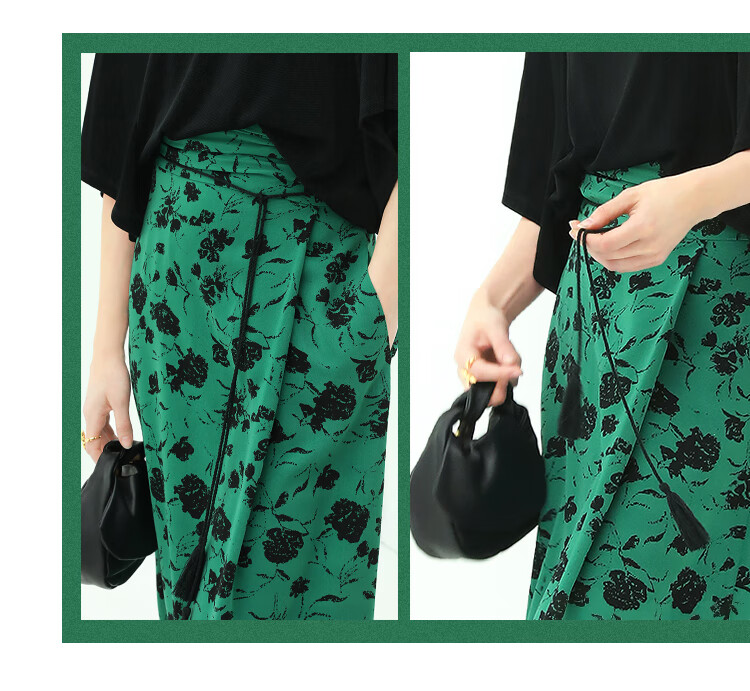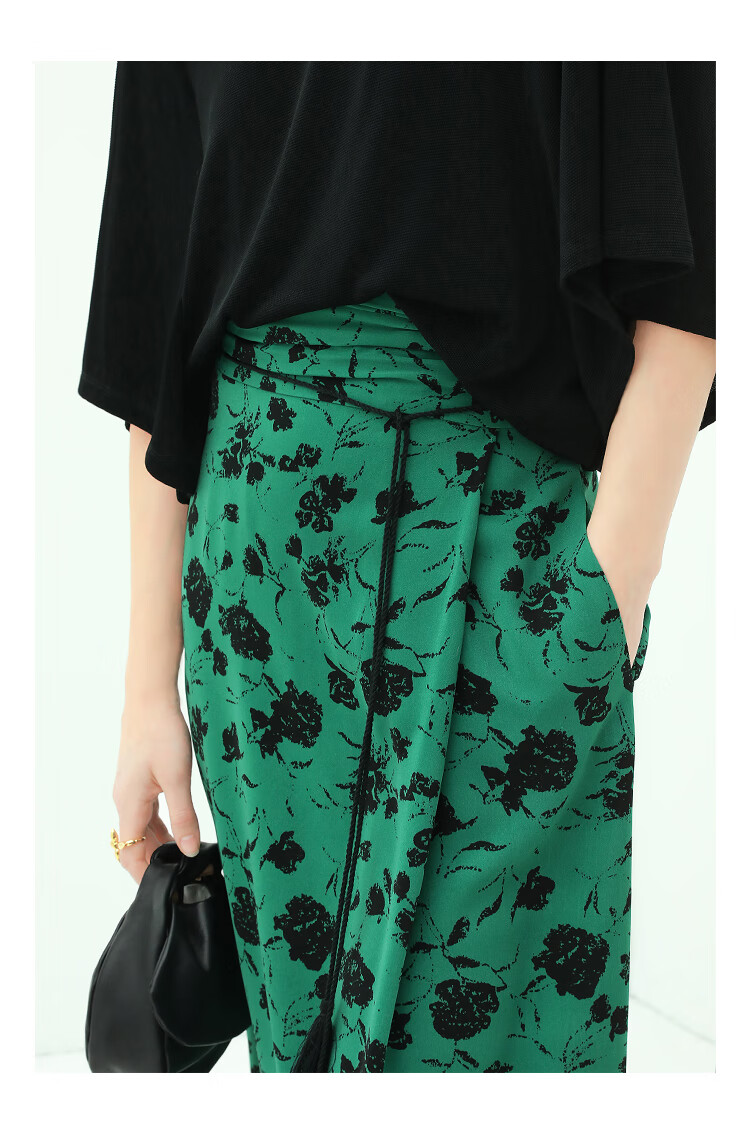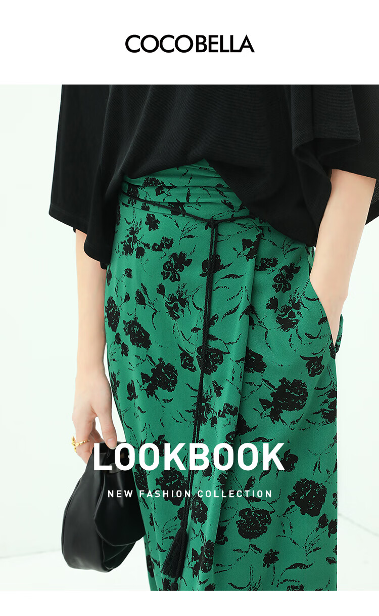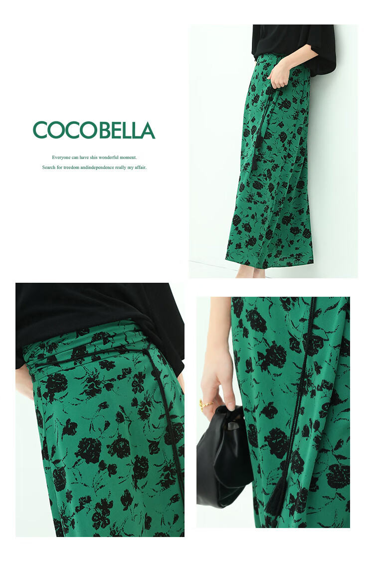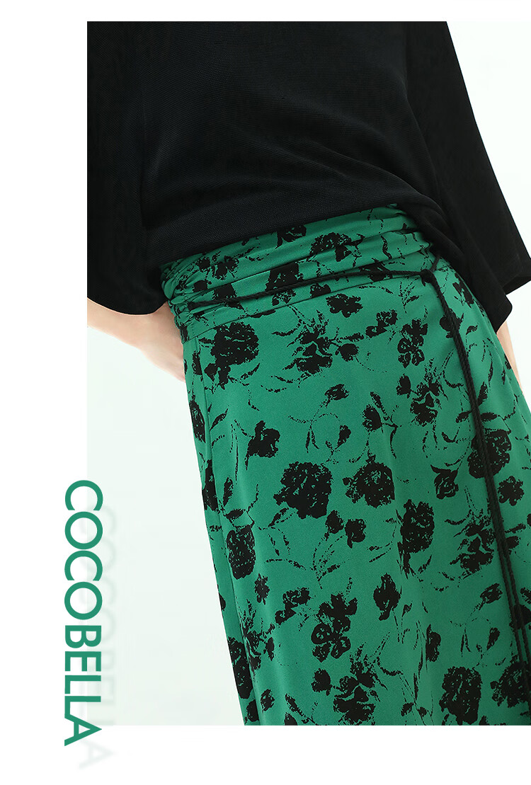 【有赞】COCOBELLA流苏飘带高腰捏褶剪影印花半身裙女夏开叉长裙HS91
