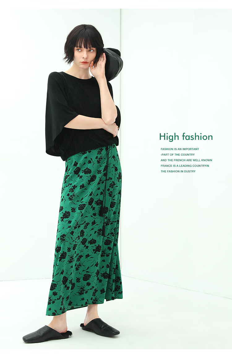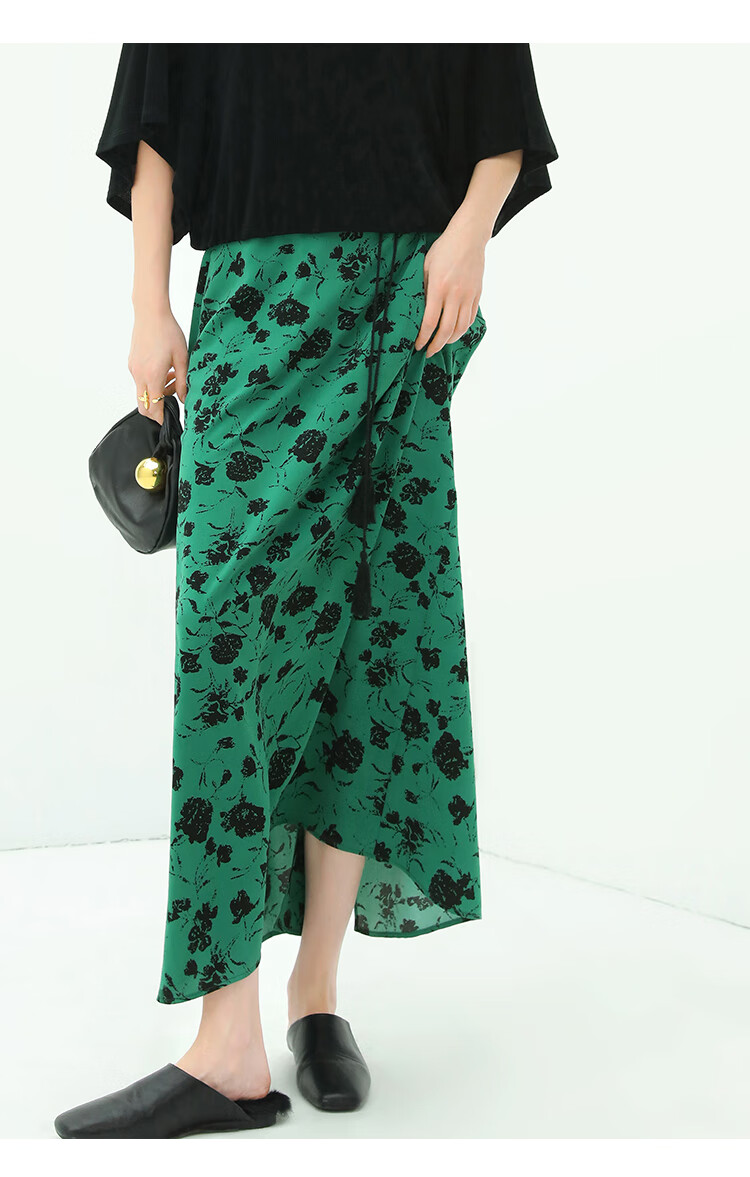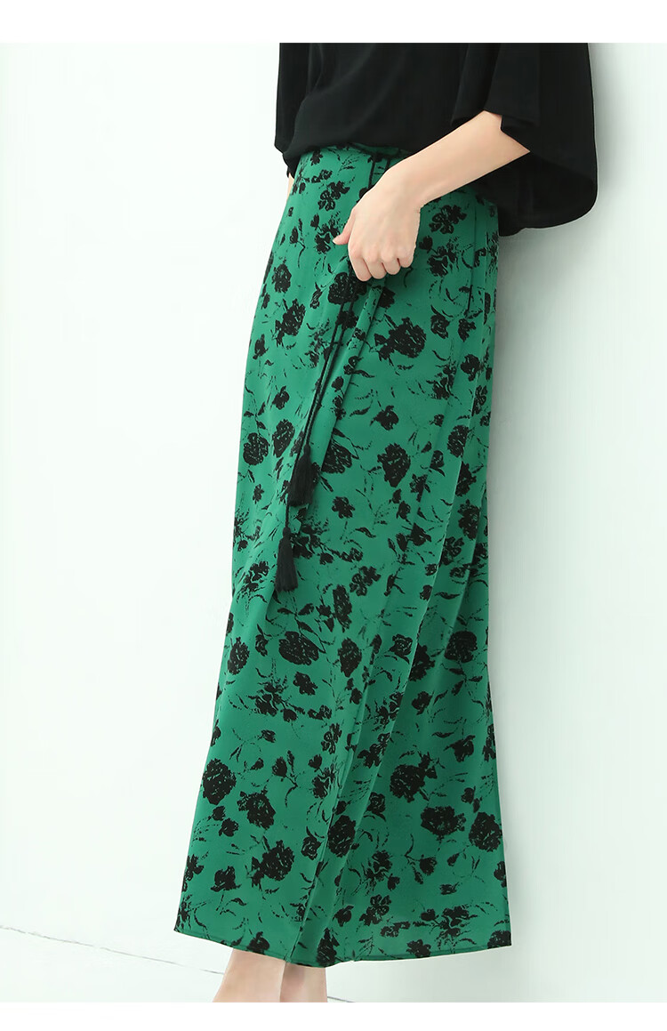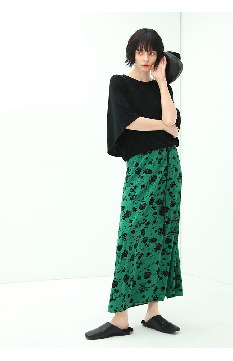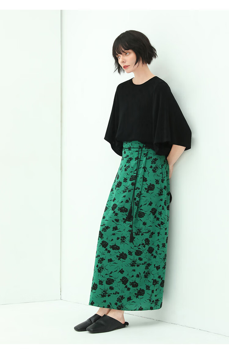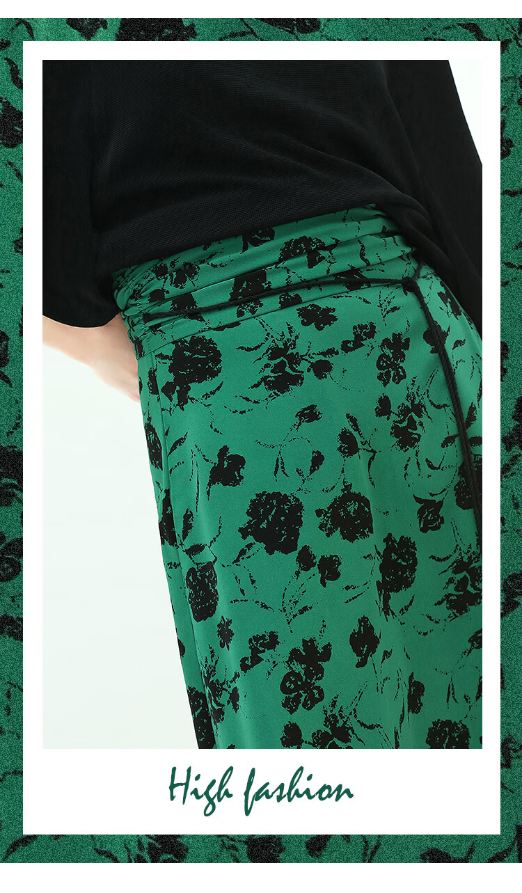 【有赞】COCOBELLA流苏飘带高腰捏褶剪影印花半身裙女夏开叉长裙HS91
