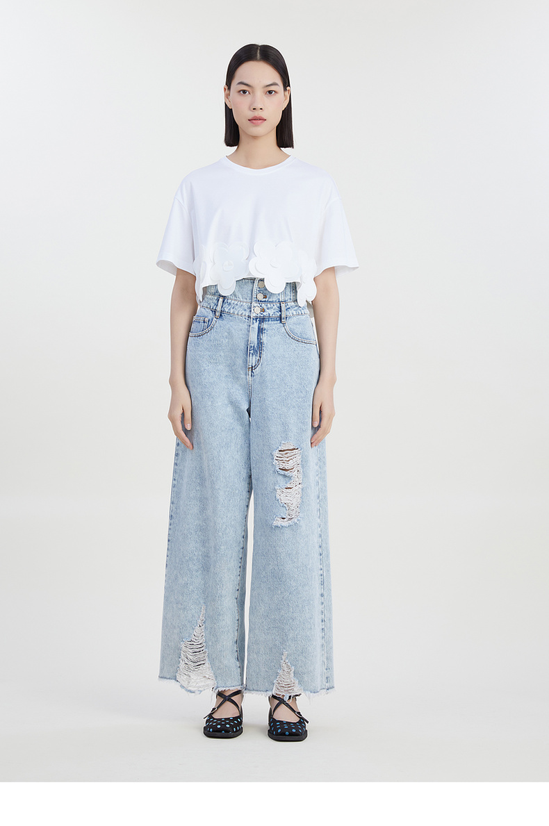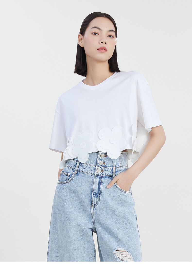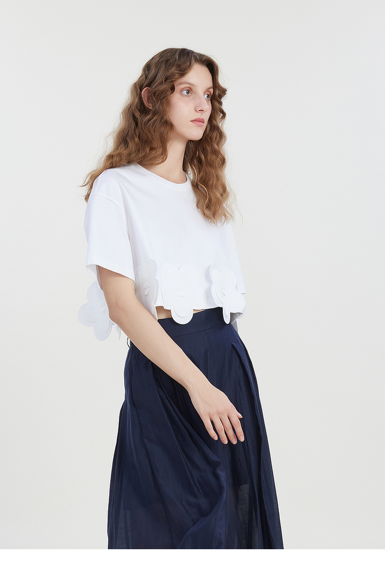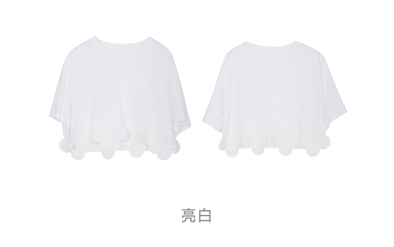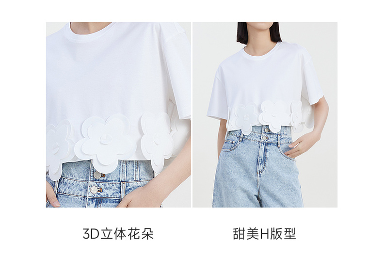 谜底时尚宽松短款T恤女2023夏新款圆领下摆花朵装饰短袖232MT0577