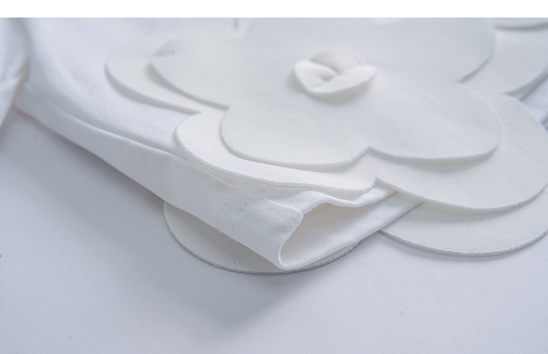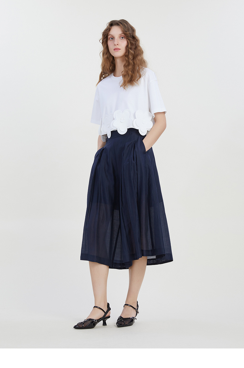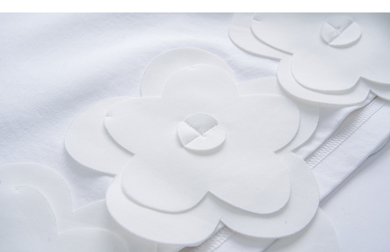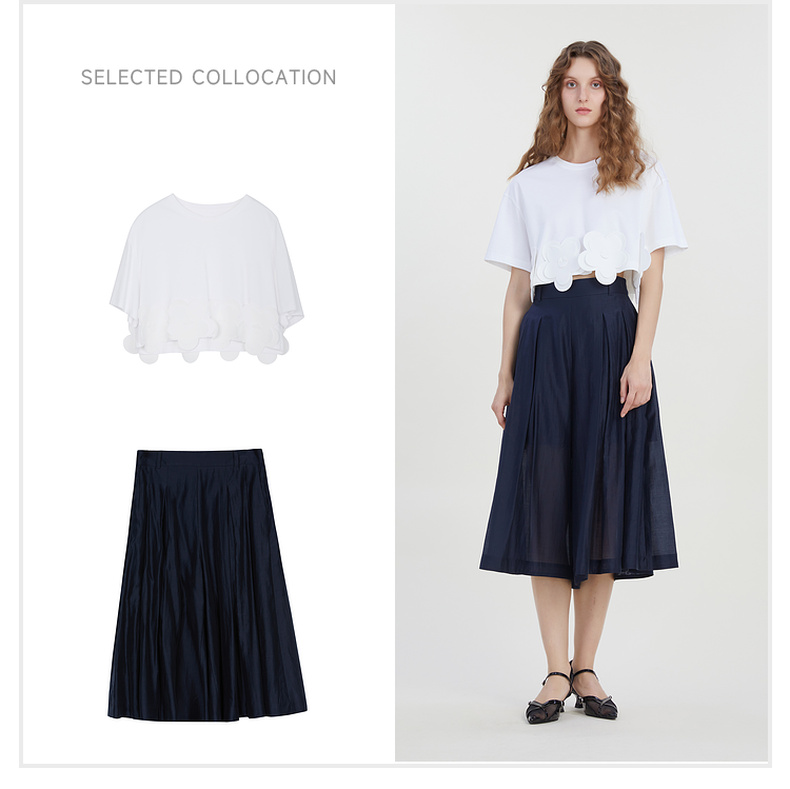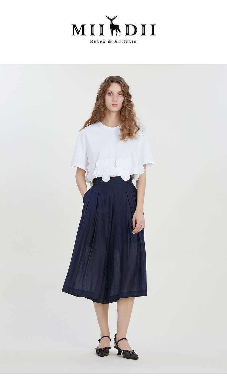 谜底时尚宽松短款T恤女2023夏新款圆领下摆花朵装饰短袖232MT0577
