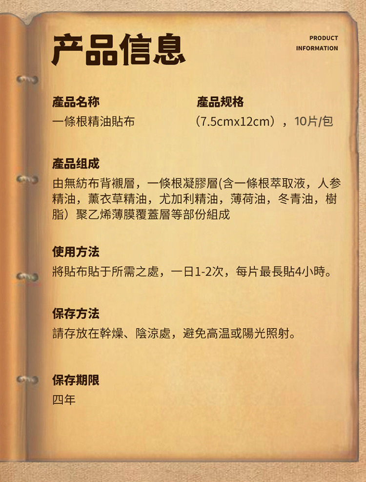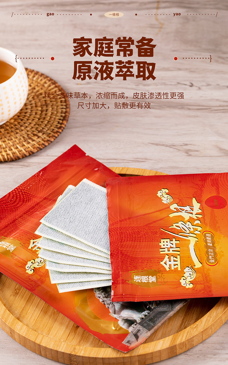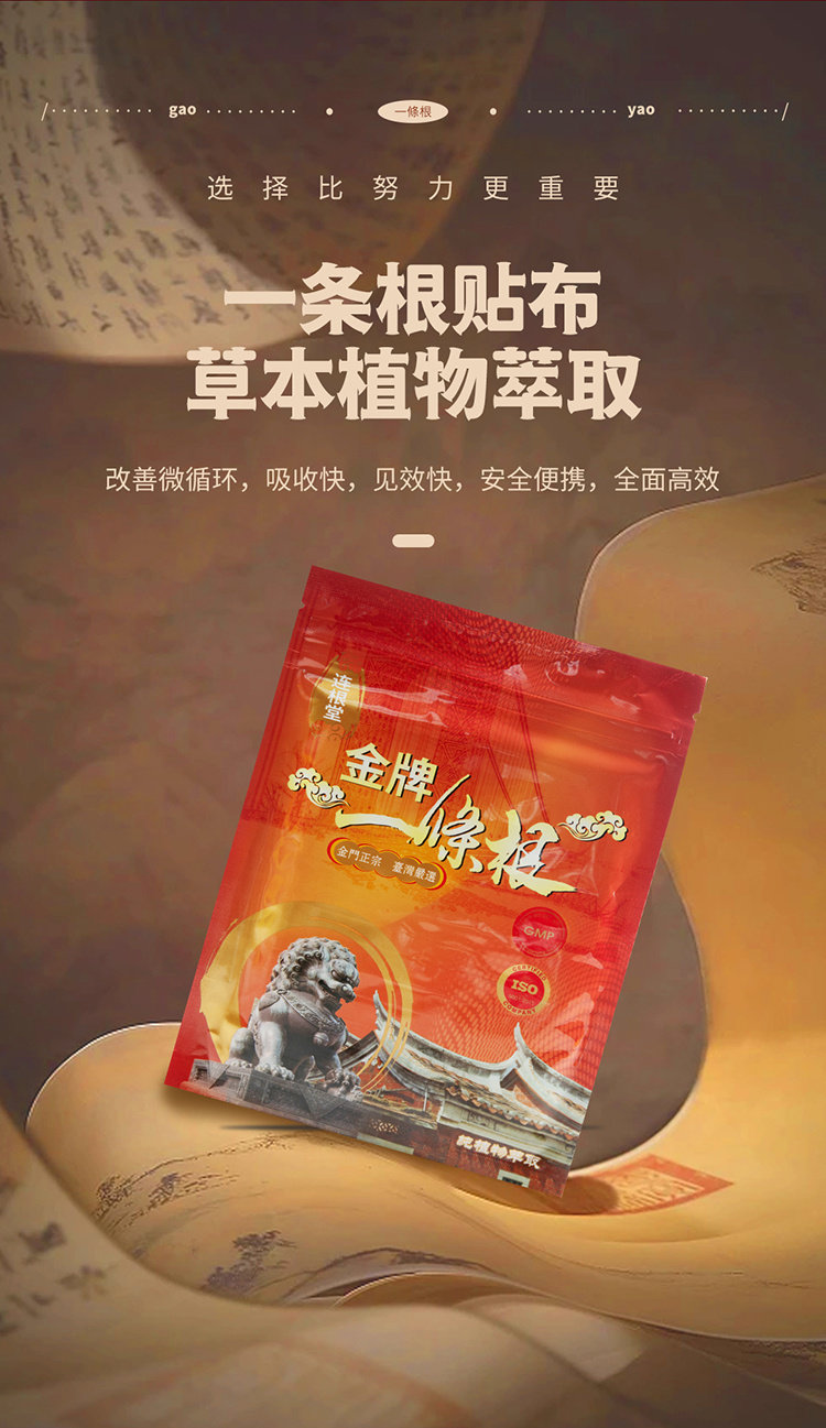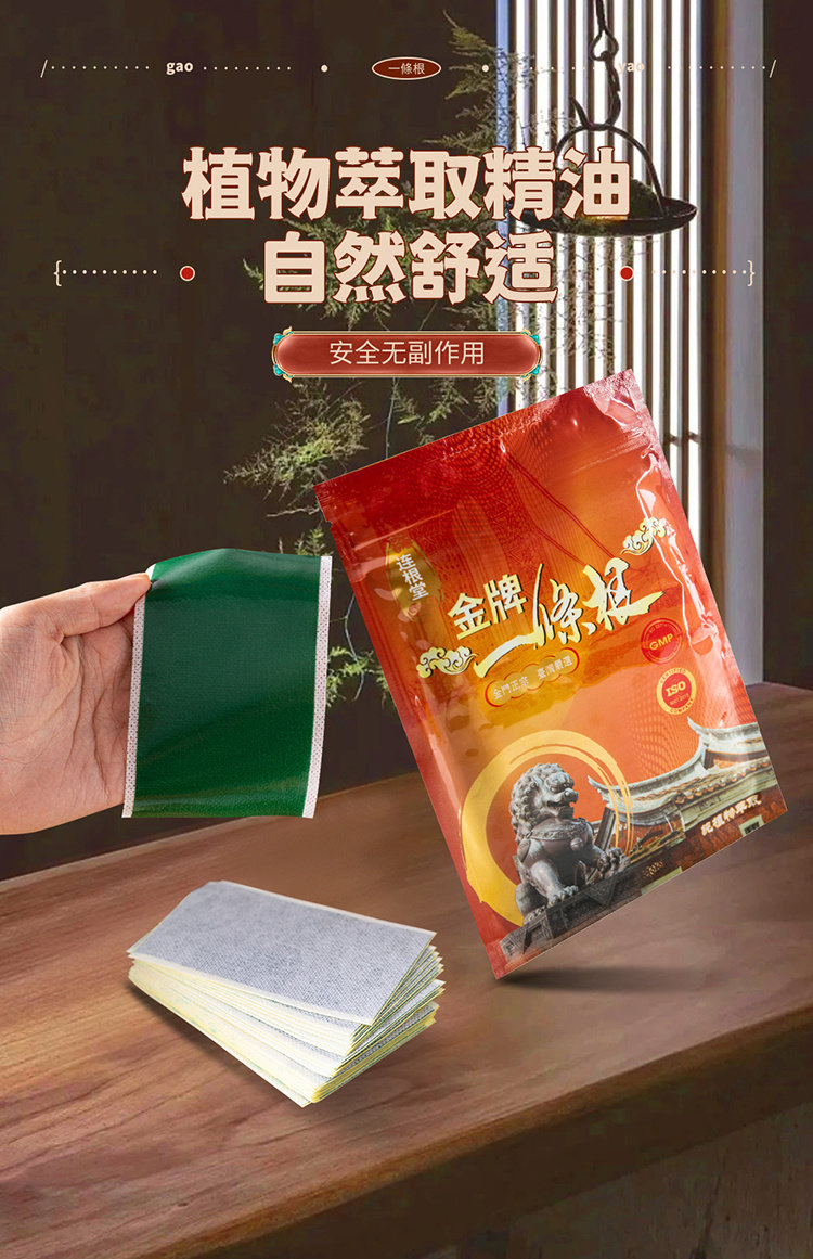 【详情】✅金牌一条根精油贴主要成分为 一条根植物萃取液、辣椒精油,玻尿酸、 葡萄糖胺、薄荷精油、树脂、猫抓藤等 天然草本萃取精油,制成贴布