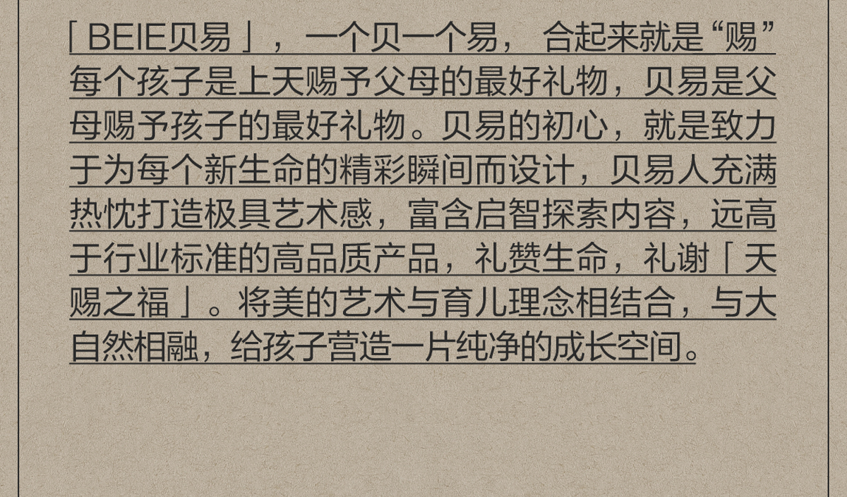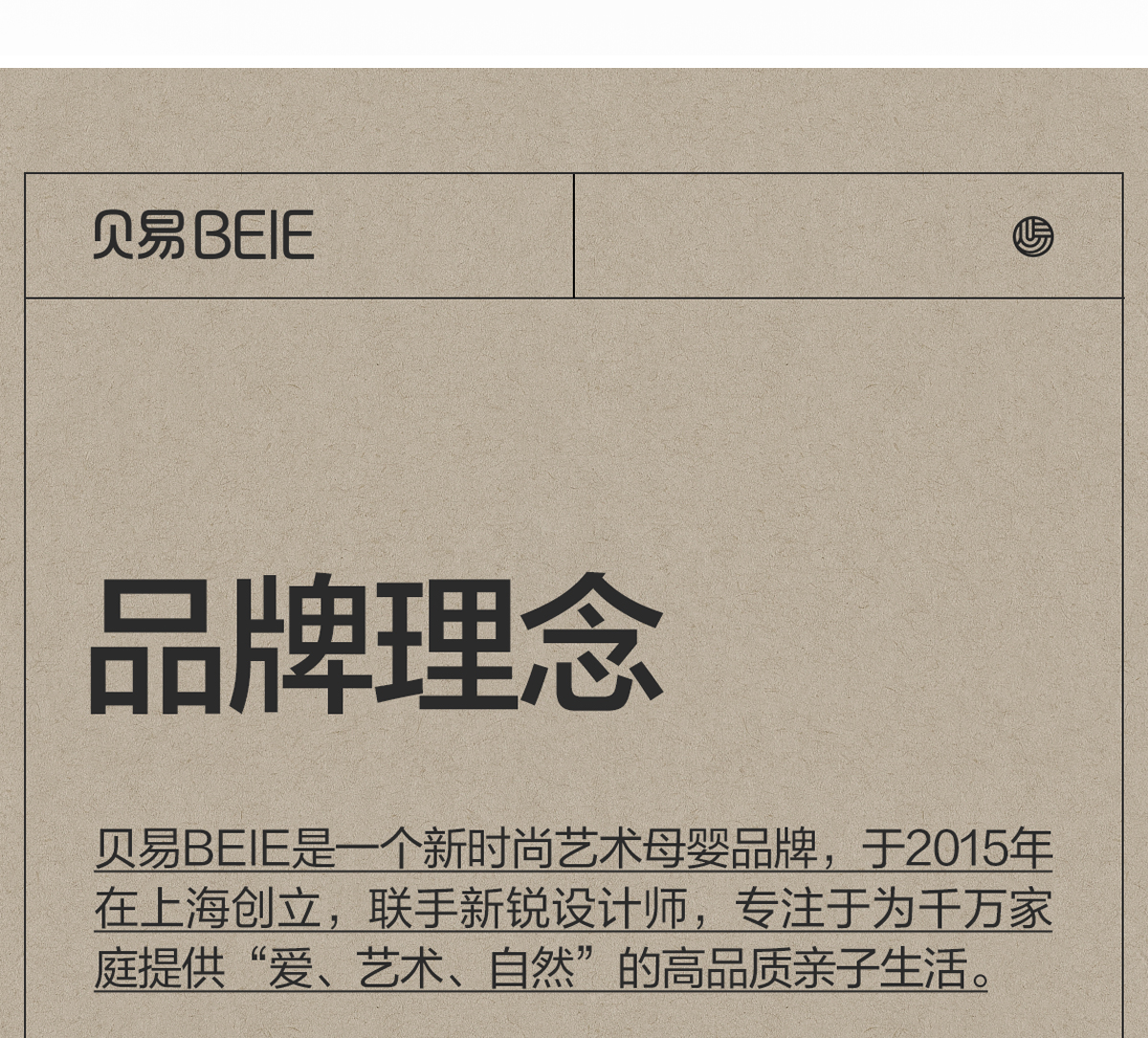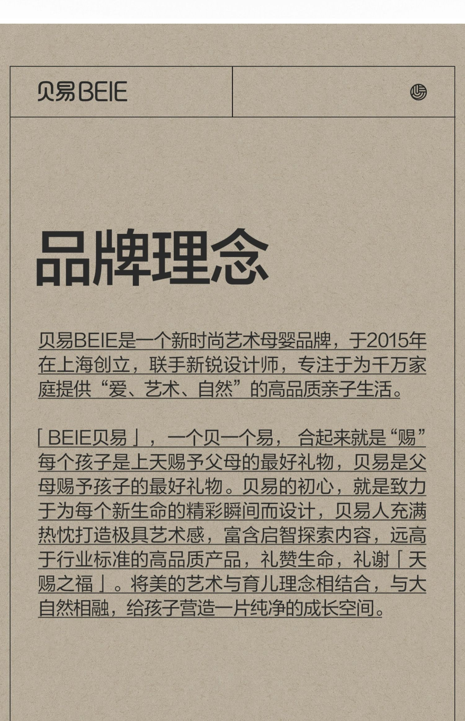 - 「BEIESTATE贝易」以极简设计为风格,主打兼顾设计、品 质和性价比的母婴产品,以创造极致细腻、不张扬、 不世俗的当代母婴用具,为用户日常亲子生活与幼儿 的启蒙早教提供新选择。