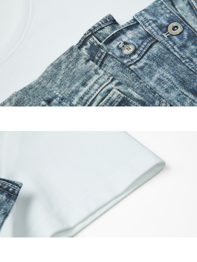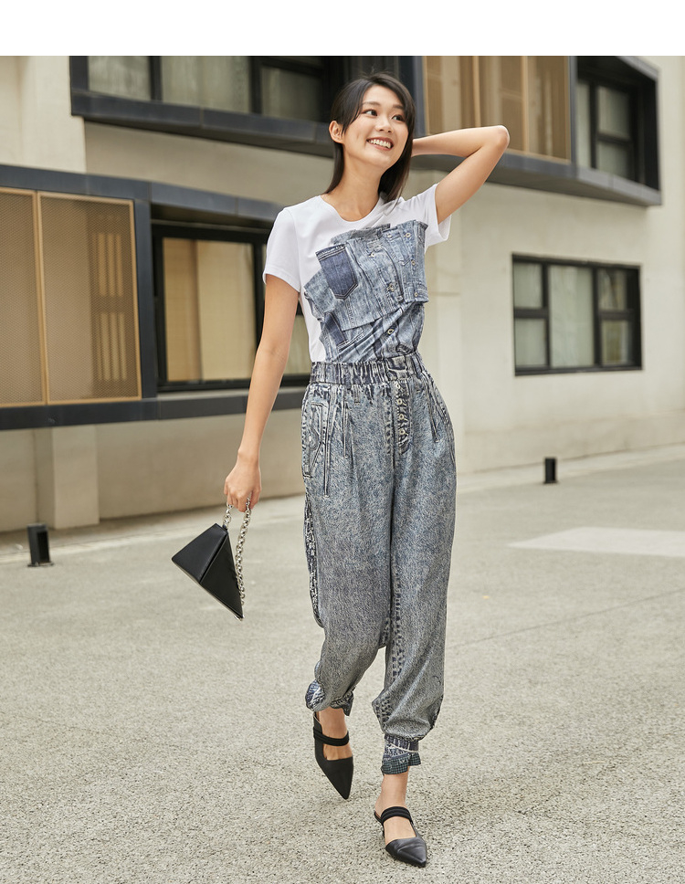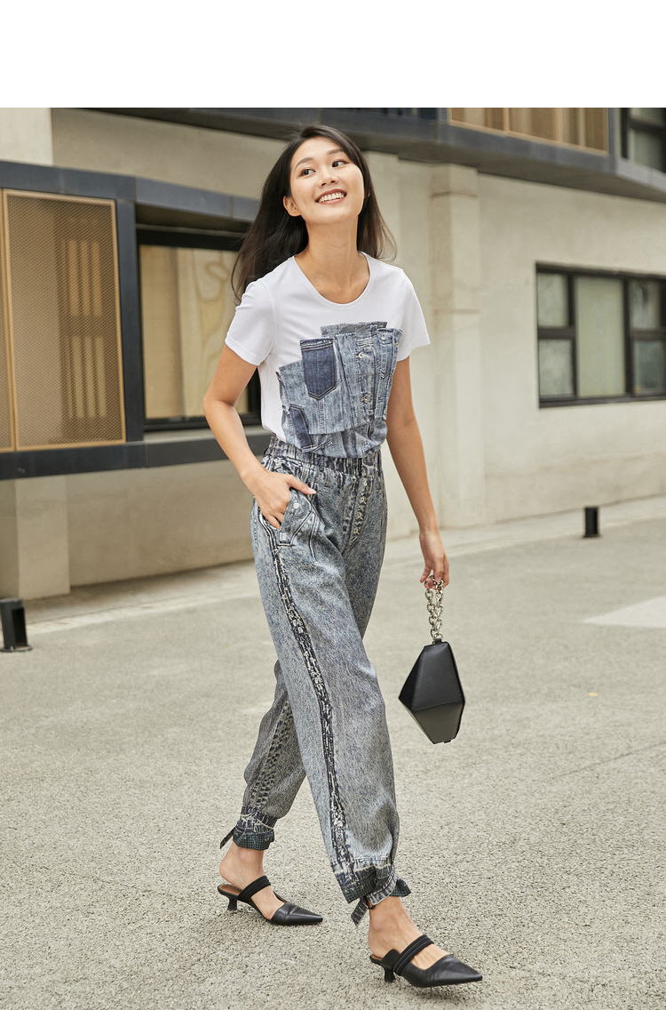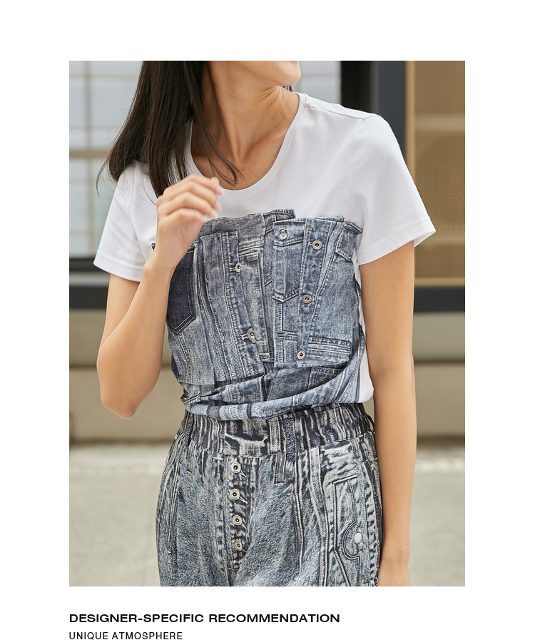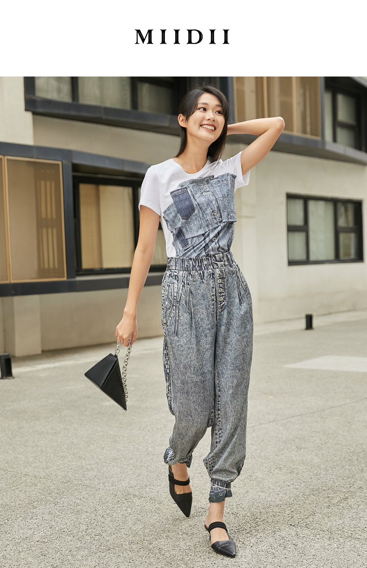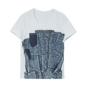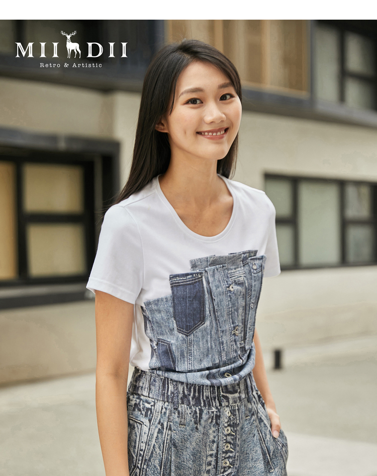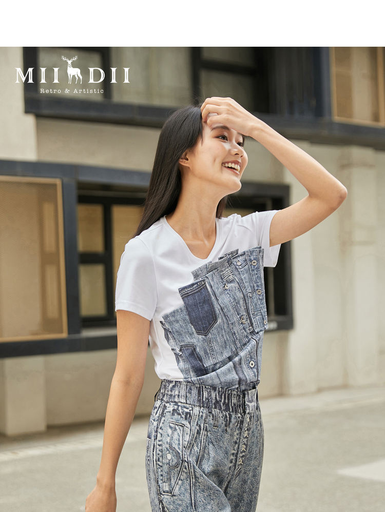MIIDII/谜底T恤女21夏新品结构式牛仔印花合体圆领短袖212MT0760