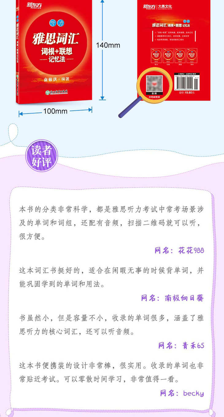 书中涵盖的雅思听力词汇,收词全面,以科学的分类方式呈现在读者眼前。通过按照常考话题分为的九个类别,帮助考生熟悉雅思听力话题,并有针对性地复习薄弱环节,也使得记忆单词不再枯燥。本书的一大特点是它小巧的开本,十分便于携带,方便考生随时随地记忆单词。
