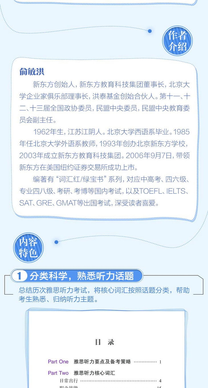 俞敏洪:新东方创始人,新东方教育科技集团董事长,北京大学企业家俱乐部理事长,洪泰基金创始合伙人。第十一、十二、十三届全国政协委员,民盟中央委员,民盟中央教育委员会副主任。1962年生,江苏江阴人。北京大学西语系毕业。1985年任北京大学外语系教师,1993年创办北京新东方学校,2003年成立新东方教育科技集团。2006年9月7日,带领新东方在美国纽约证券交易所成功上市。编著有“新东方红宝书/绿宝书”系列,对应中高考、四六级、专业四八级、考研、考博等国内考试,以及TOEFL、IELTS、SAT、GRE、GMAT等出国考试,深受读者喜爱。